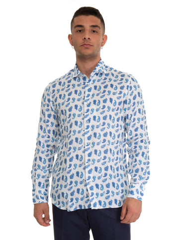 Camicia in lino, collo mezzo francese, fantasia cashmere, schiena con due pinces, vestibilità slim, composizione:...