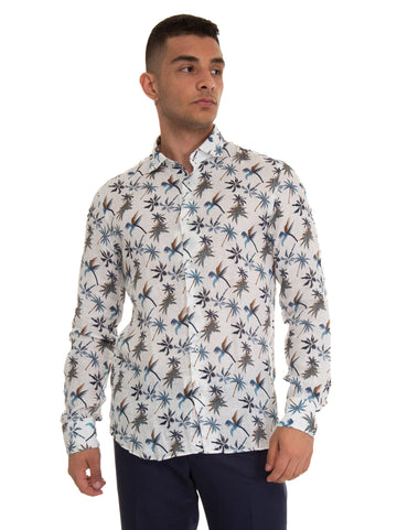 Camicia in lino, collo mezzo francese, stampa palme, schiena con due pinces, vestibilità slim, composizione:...