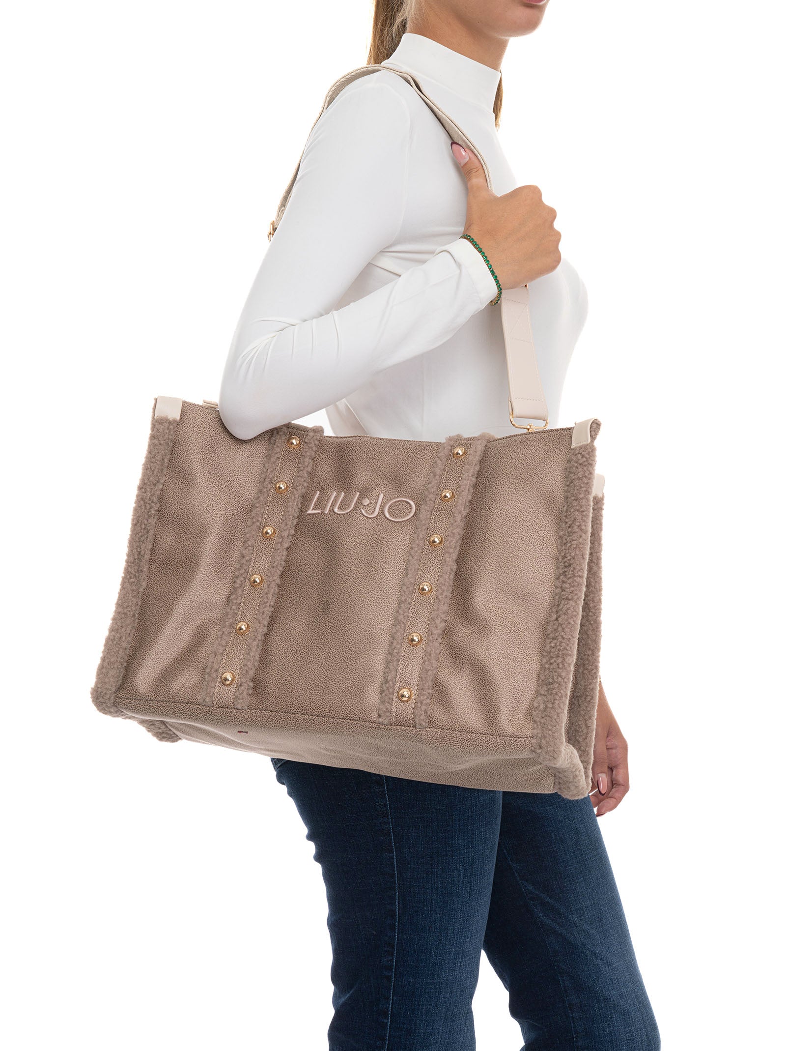 Borsa grande, due manici, tracolla removibile e regolabile, logo anteriore, applicazione borchie, bordo in pelliccia, chiusura con cerniera, composizione: 100% poliestere, linea: LIU JO.