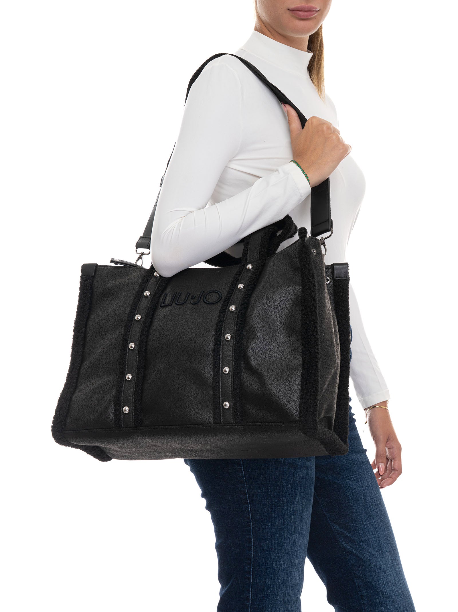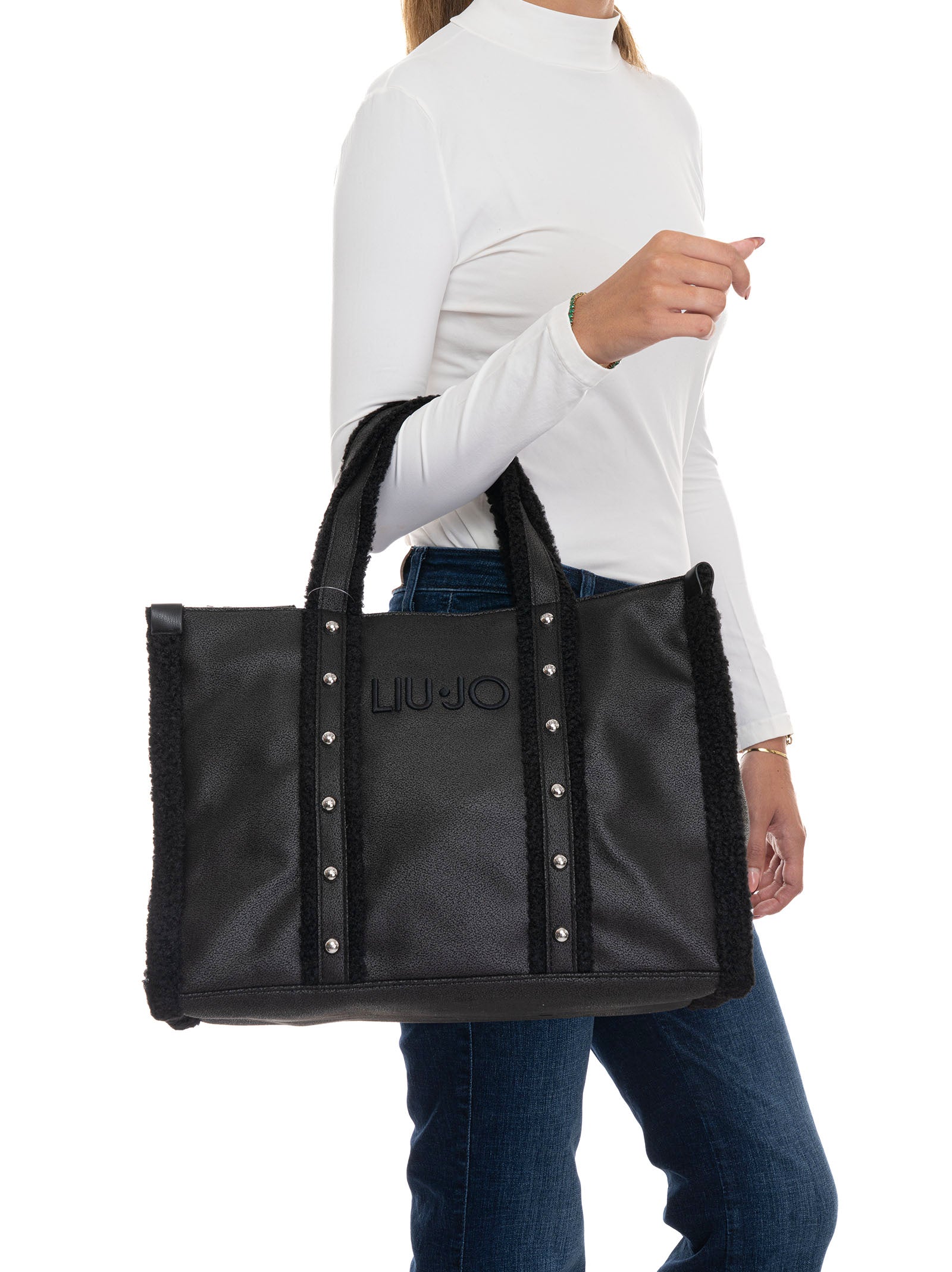Borsa grande, due manici, tracolla removibile e regolabile, logo anteriore, applicazione borchie, bordo in pelliccia, chiusura con cerniera, composizione: 100% poliestere, linea: LIU JO.
