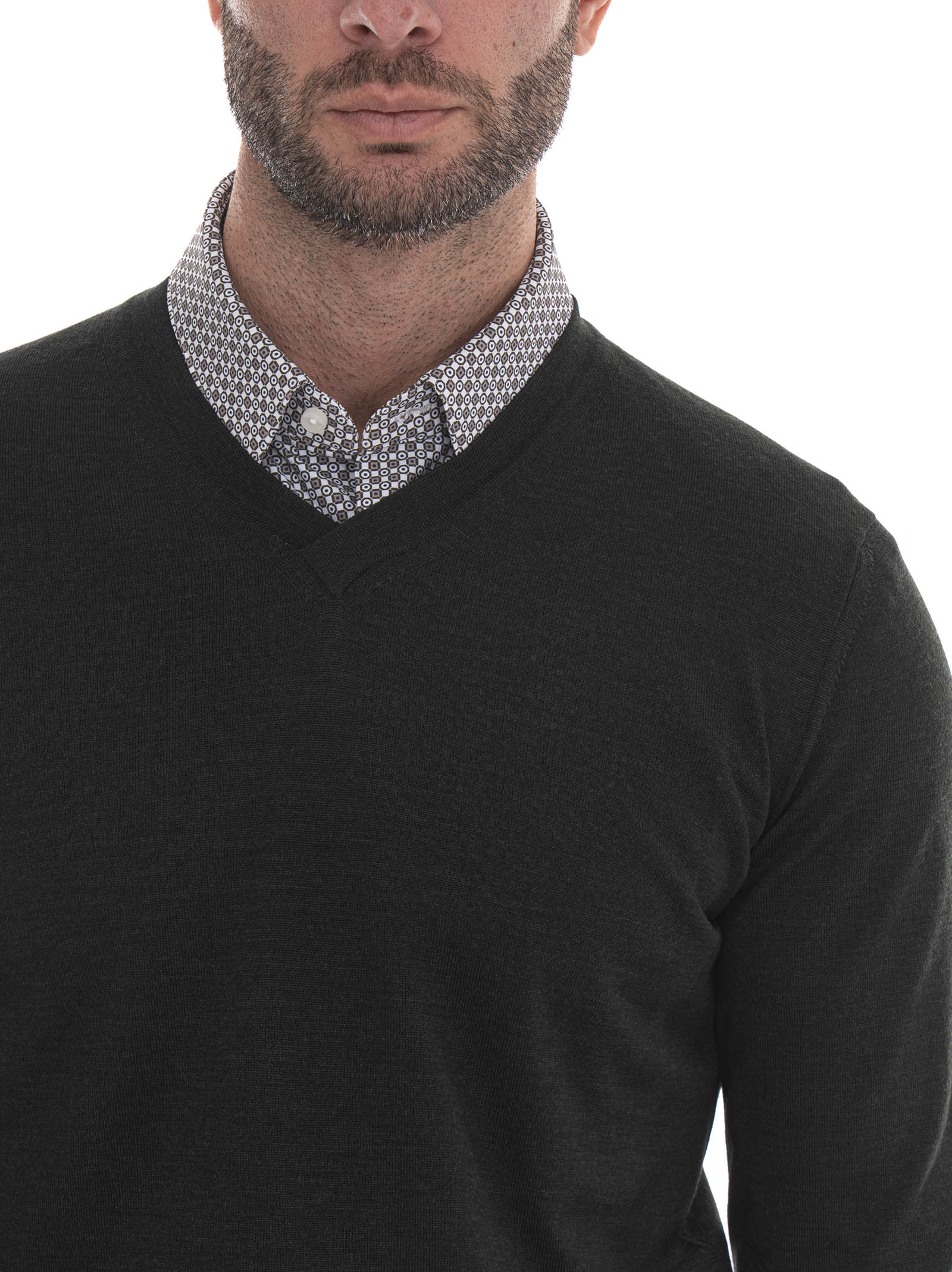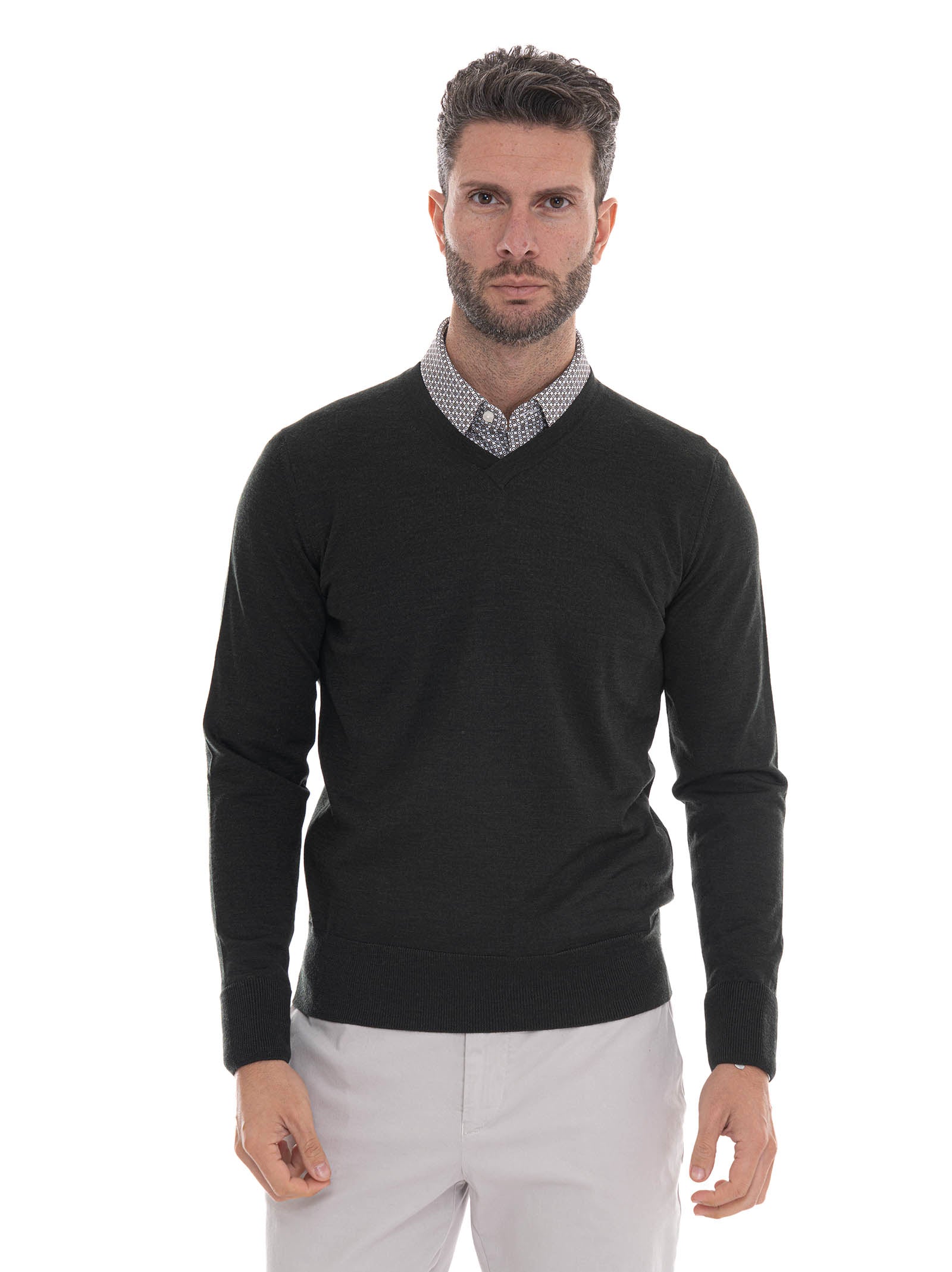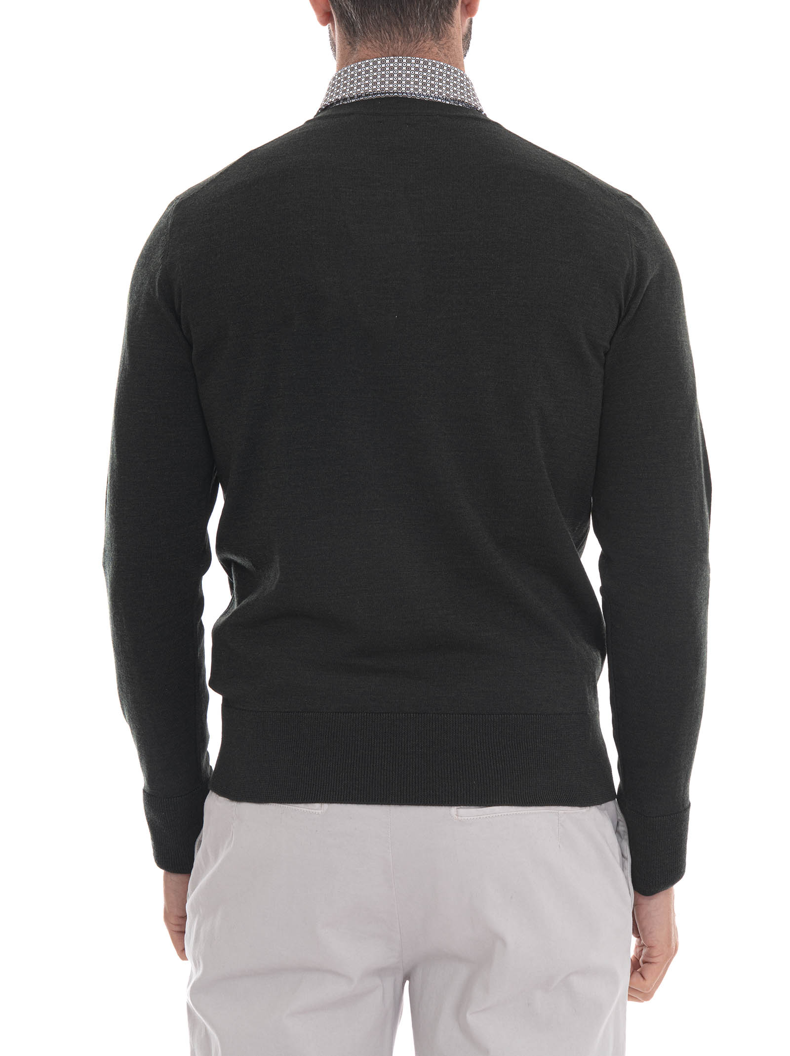 V-neck sweater, solid color, non-shrink treatment, super fine merino wool, composition: 100% merino wool, line: HINDUSTRIE.