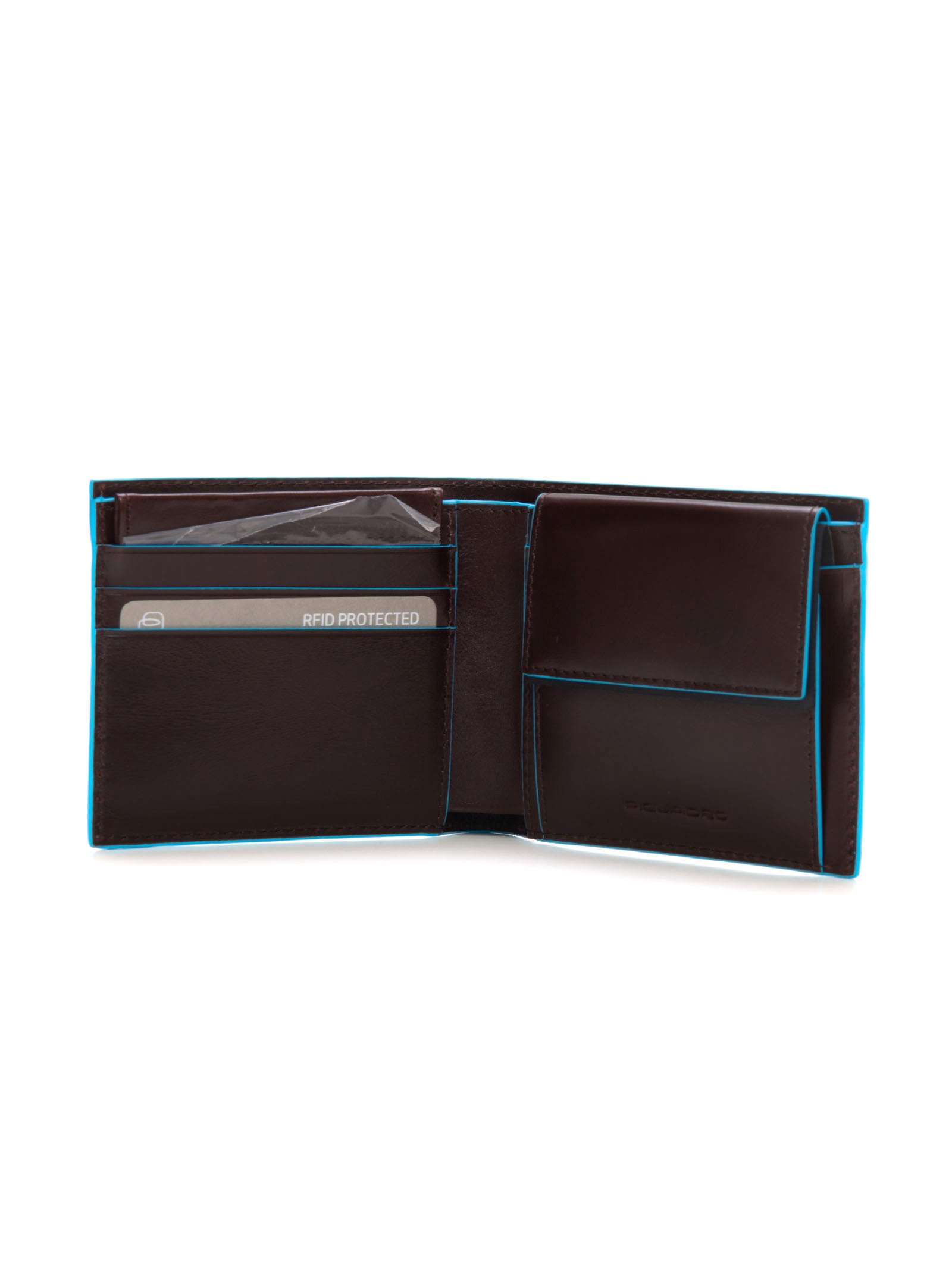 Wallet, banknote compartment, card holder compartments, coin compartment, contrasting profiles, chromed steel logo, composition: 100% leather, line: PIQUADRO.