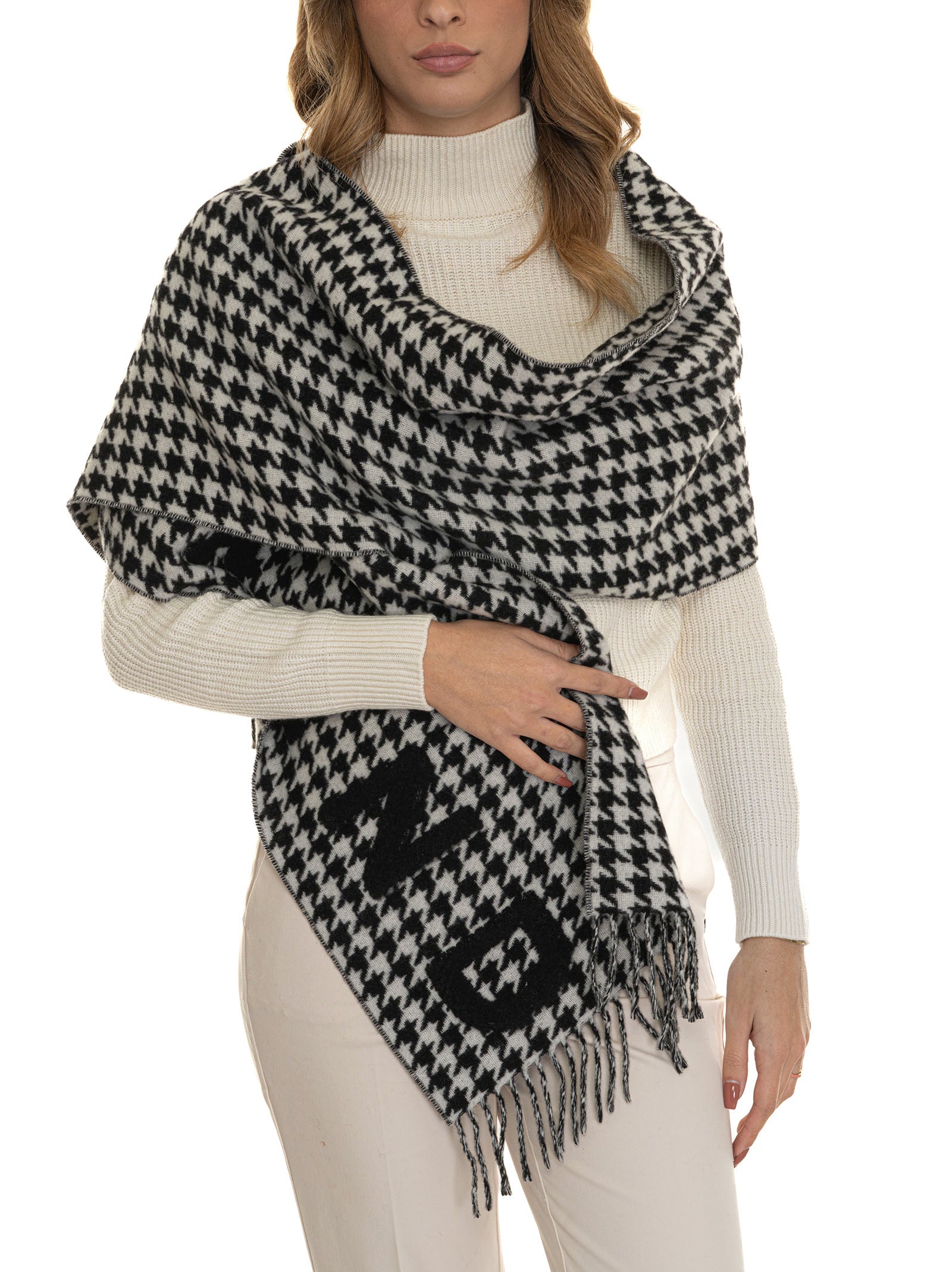 Weekend Max Mara Fashion scarf, houndstooth pattern, fringed profile, front writing, composition: 95% wool, 5% polyamide, line: WEEKEND MAX MARA.