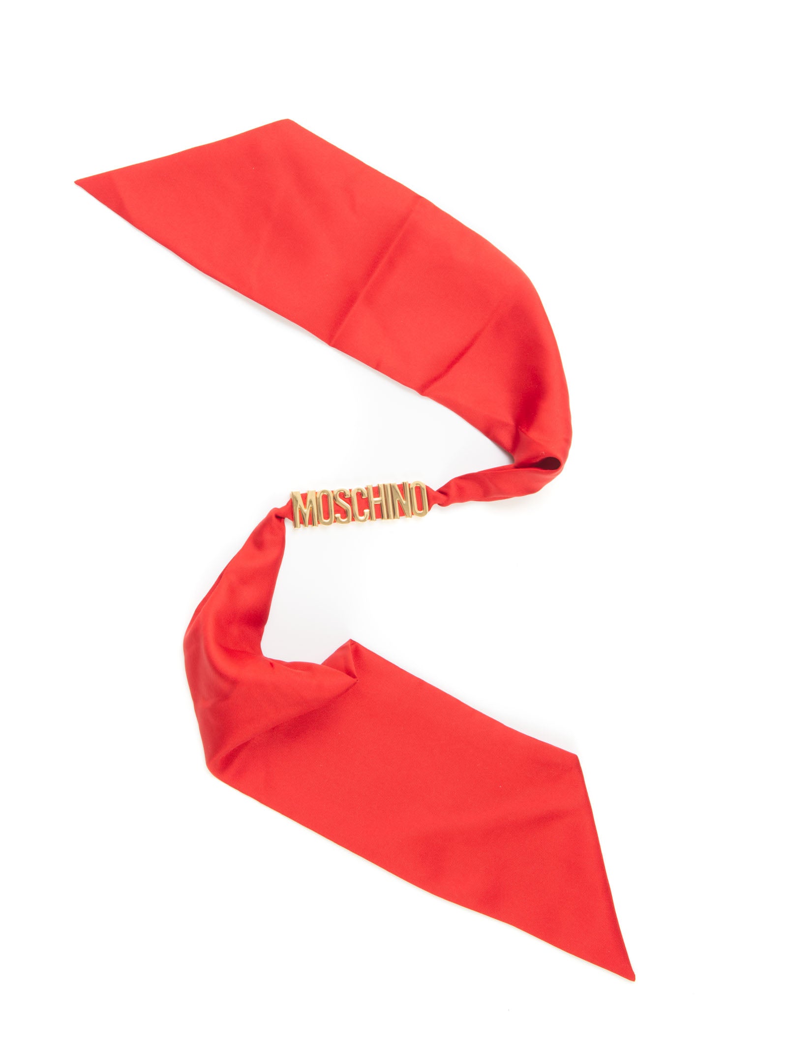 Scarf, neck knot, gold-colored metal logo, solid color, composition: 100% silk, line: MOSCHINO.