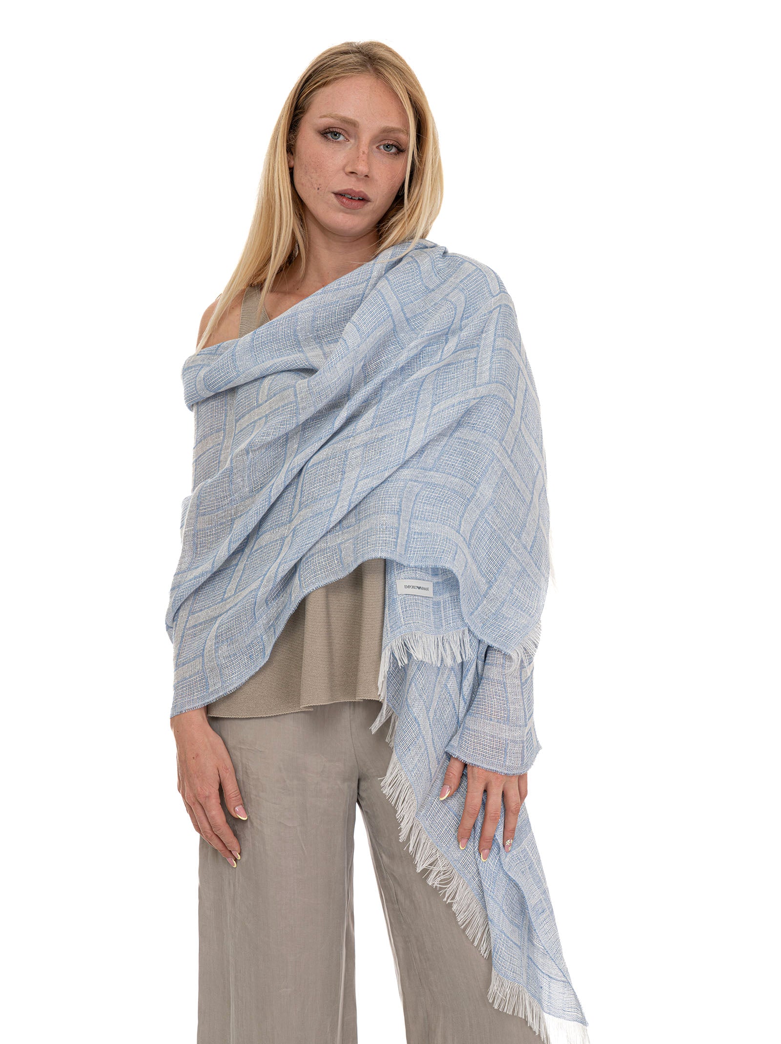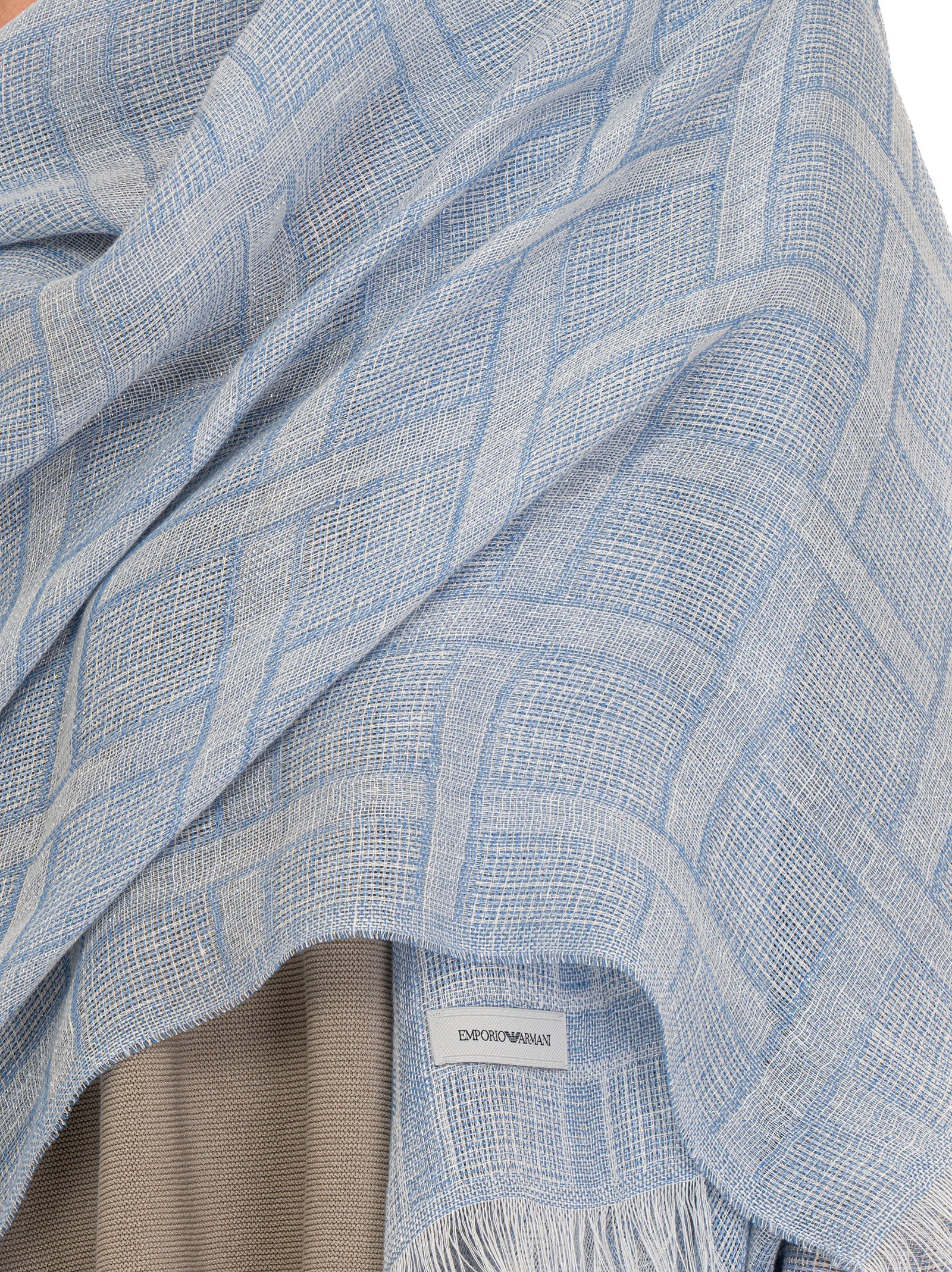 Stola, fantasia geometrica, dettagli in lurex, profilo con frange, composizione: 97% lino, 2% cupro, 1% metallizzato, linea: EMPORIO ARMANI.