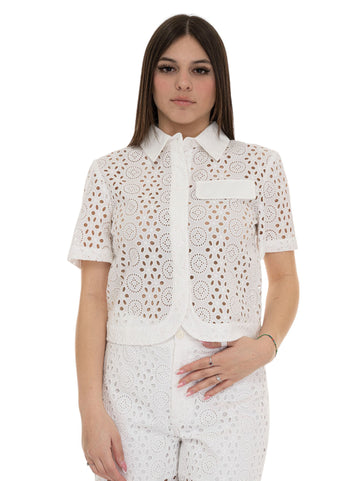 Women's shirt, classic collar, cropped length, button fastening, Sangallo fabric, logo tab, composition: 100% cotton,...