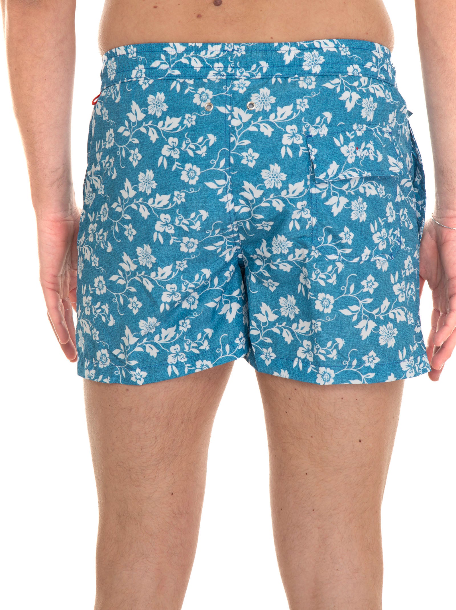 Swim shorts, spring and drawstring waist, logoed back pocket with velcro closure, front pocket with closure, leaf pattern, composition: 100% polyester, line: KITON.