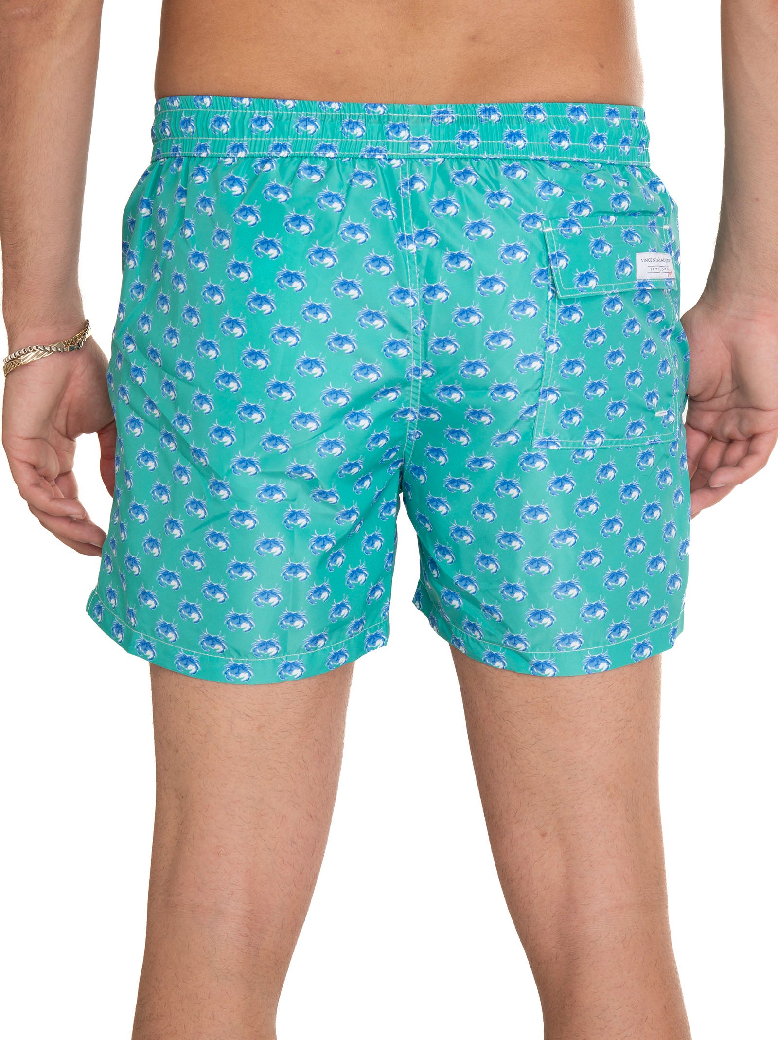 Sea boxer, crab pattern, back pocket, internal mesh, side vents, composition: 100% polyester, line: VINCENZO DE LAUZIERS.