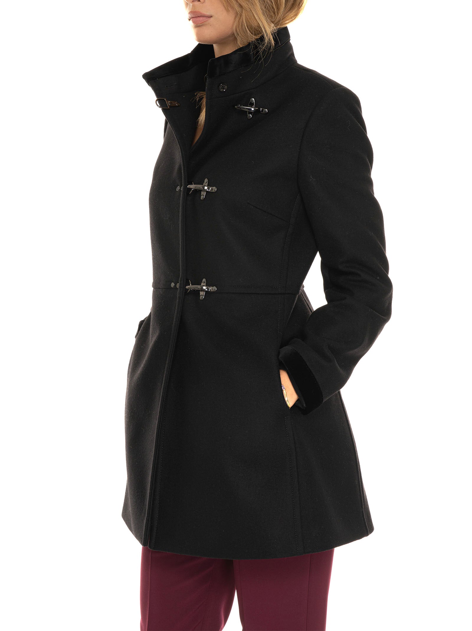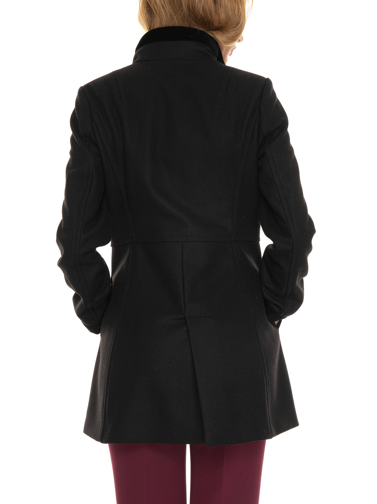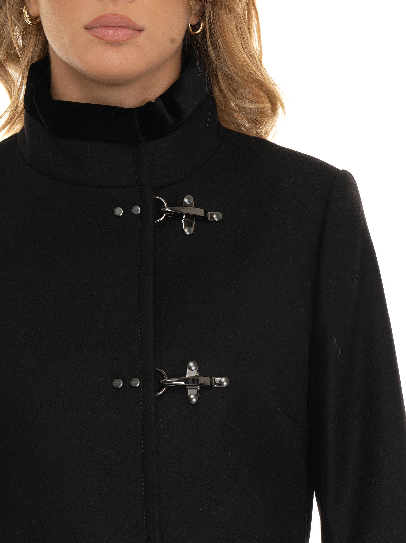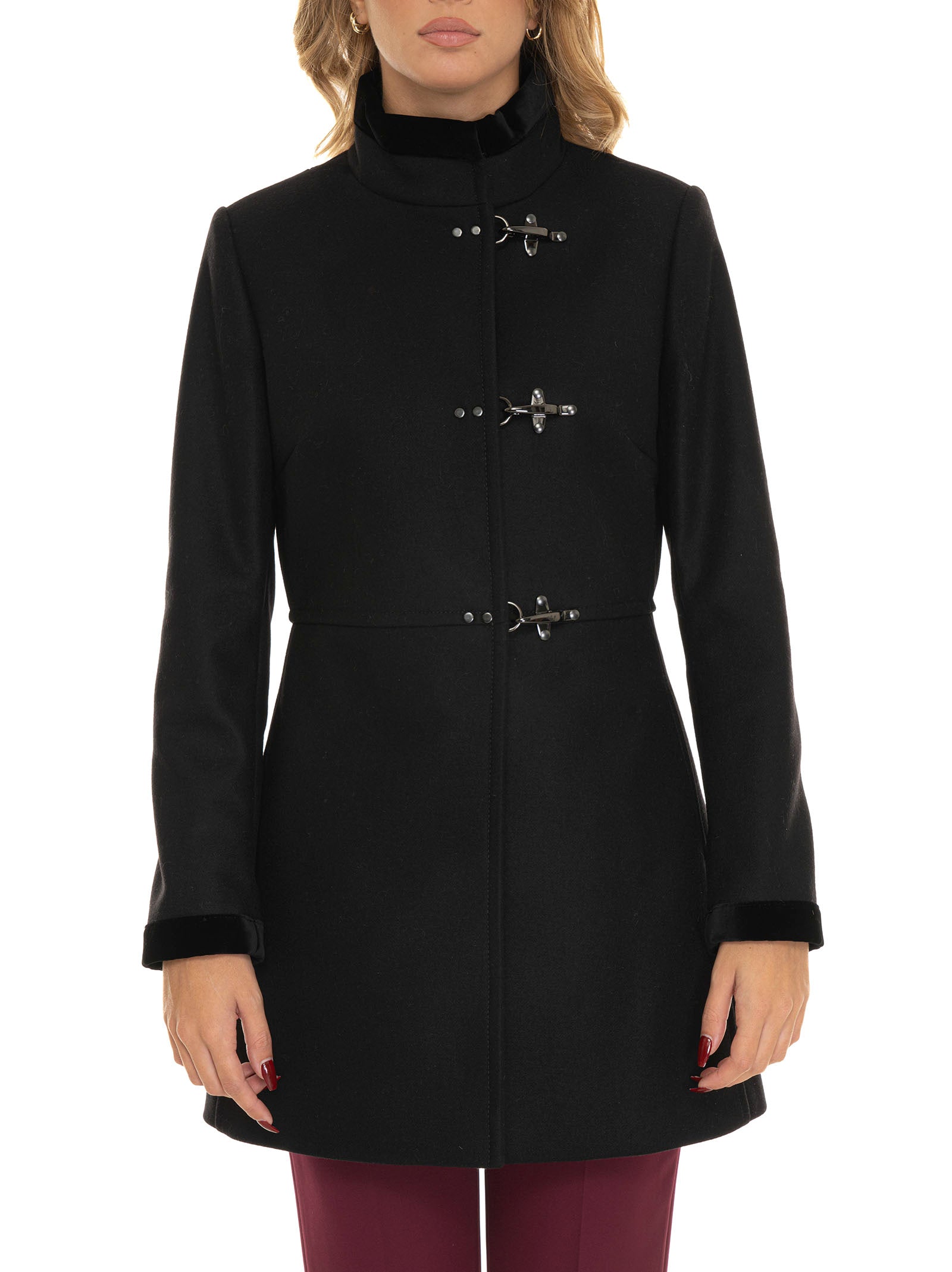 Coat in Fay Virginia cloth, hook closure, standing collar, velvet profiles, back vent, lined, composition: 80% virgin wool, 20% polyamide, interior: 62% acetate, 38% polyester, line: FAY.