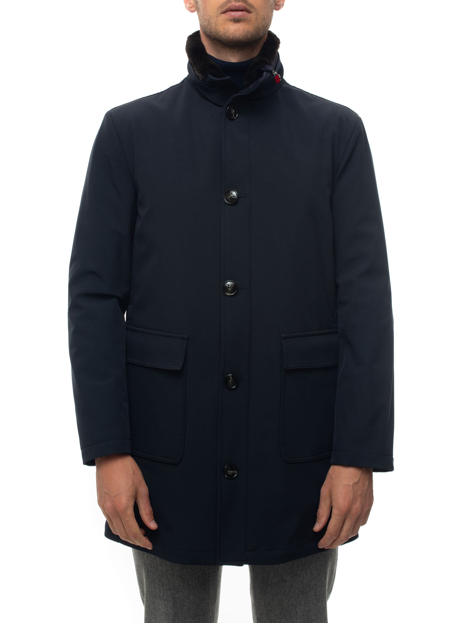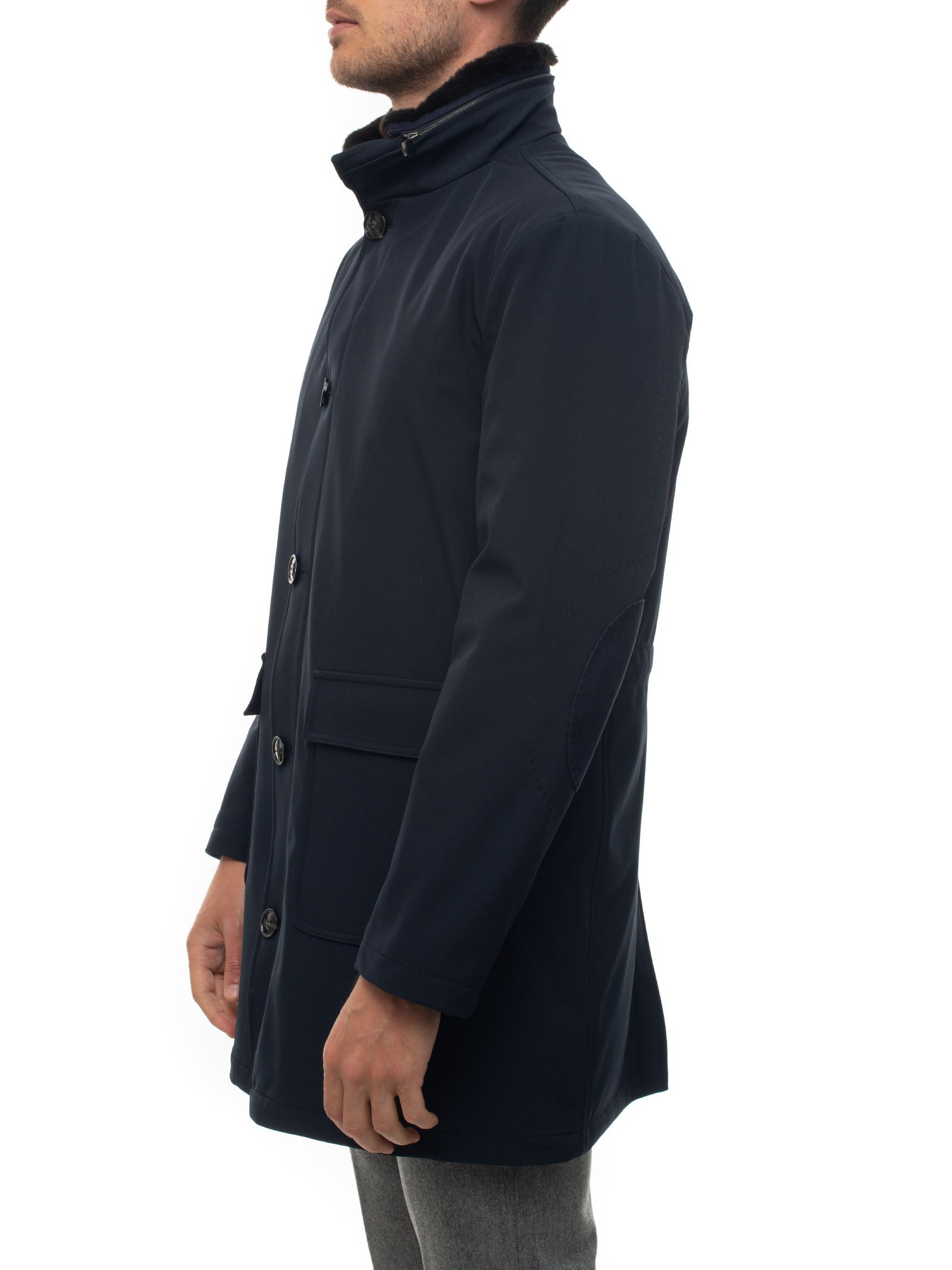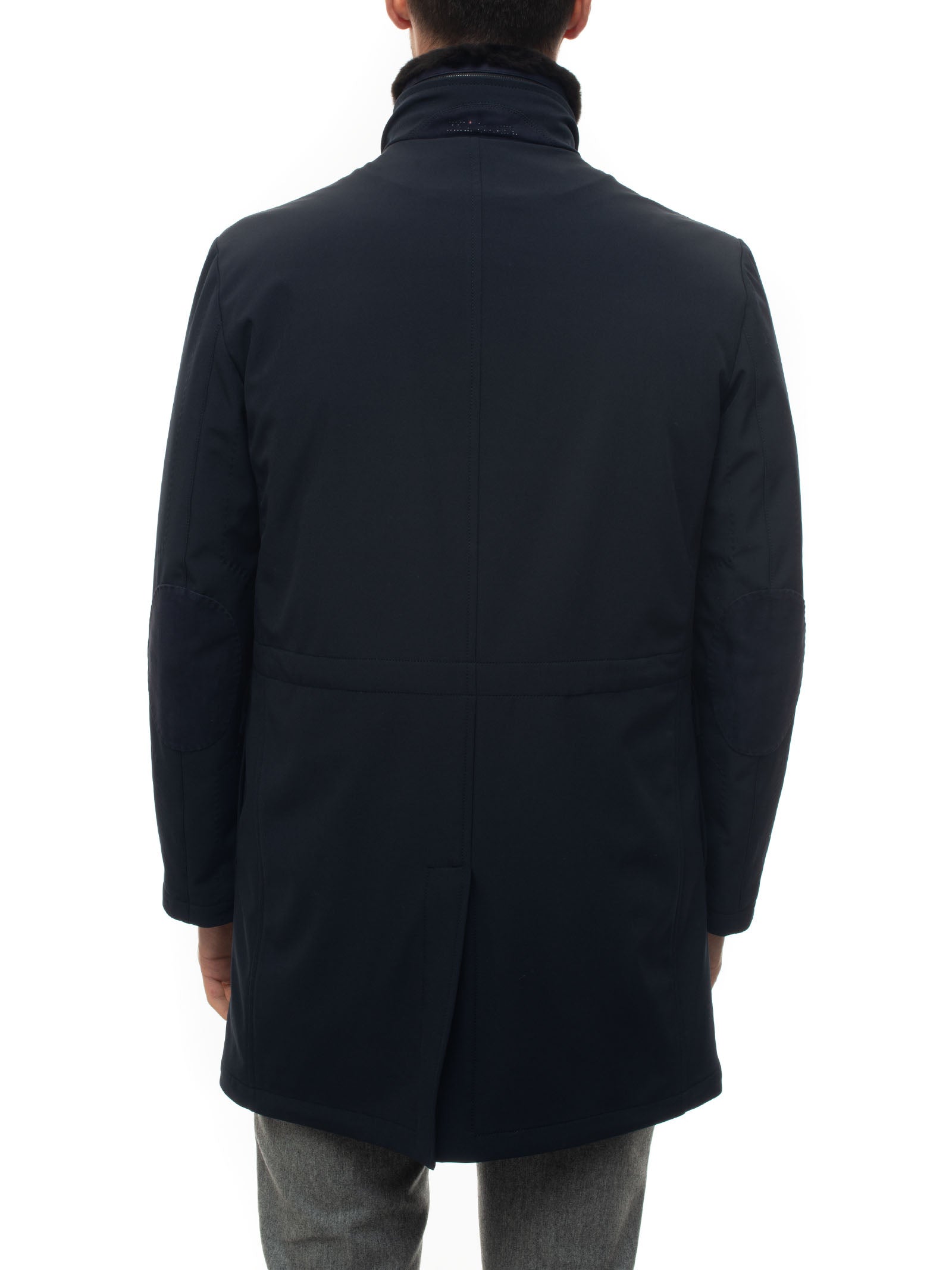 Fabric jacket, removable fur, elbow patches, double slider zip closure + buttons, made in Italy, regular fit, composition: 93% polyester, 7% elastane, lining: 100% polyester, line: KITON.