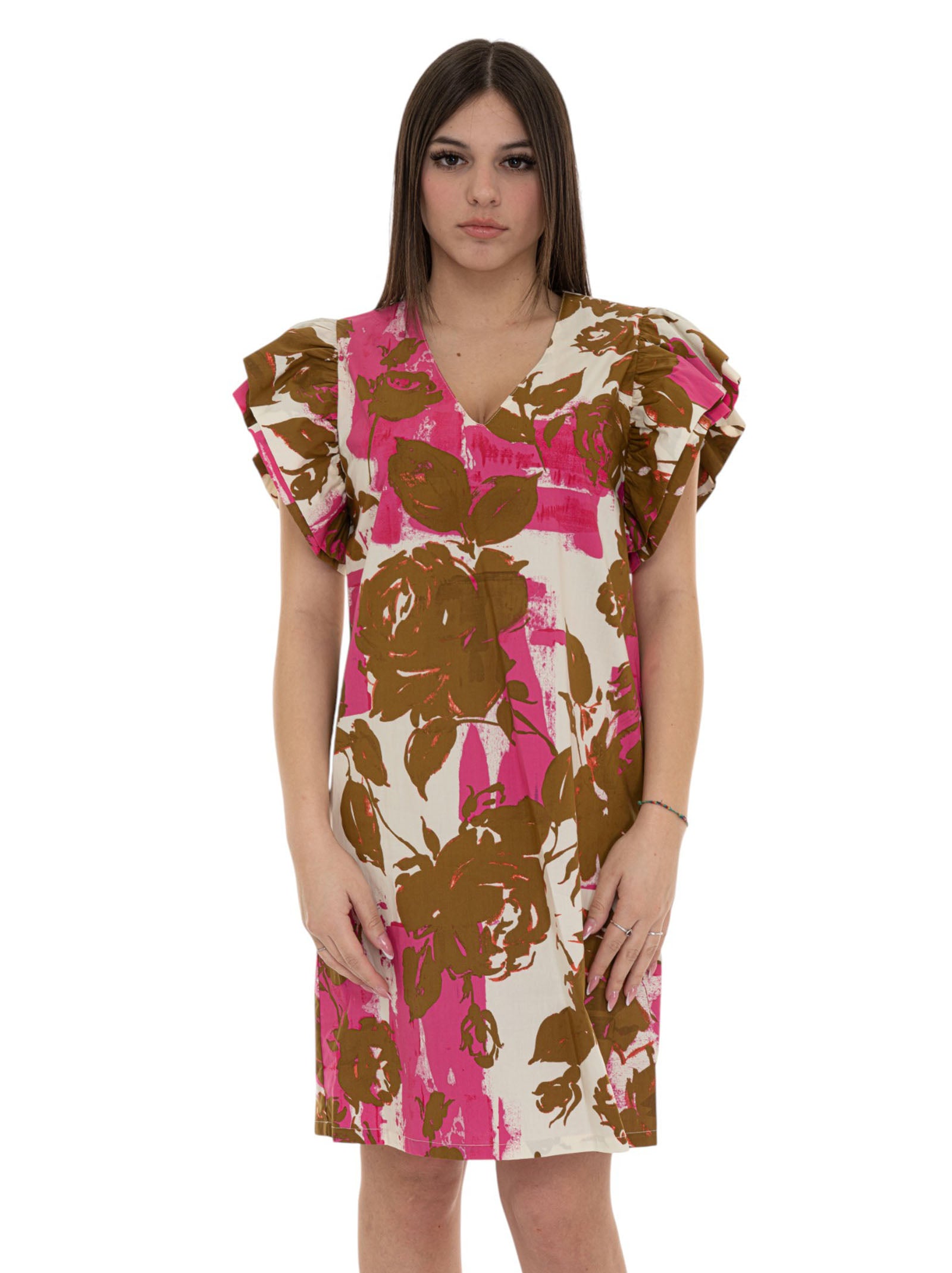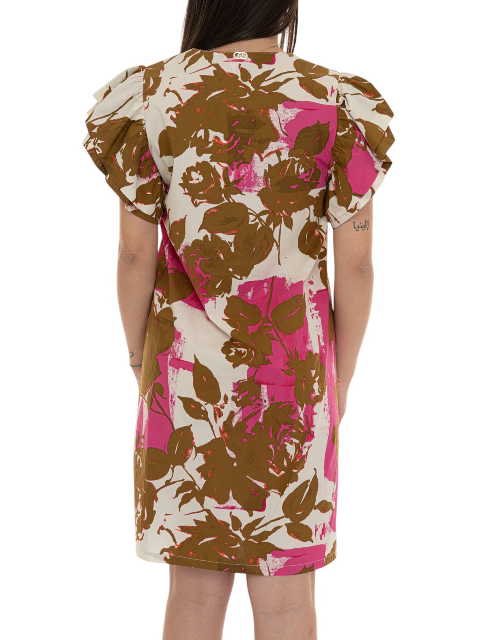 Short dress, V-neck, flounced sleeves, patterned print, logo tab, composition: 100% cotton, line: LIU JO.