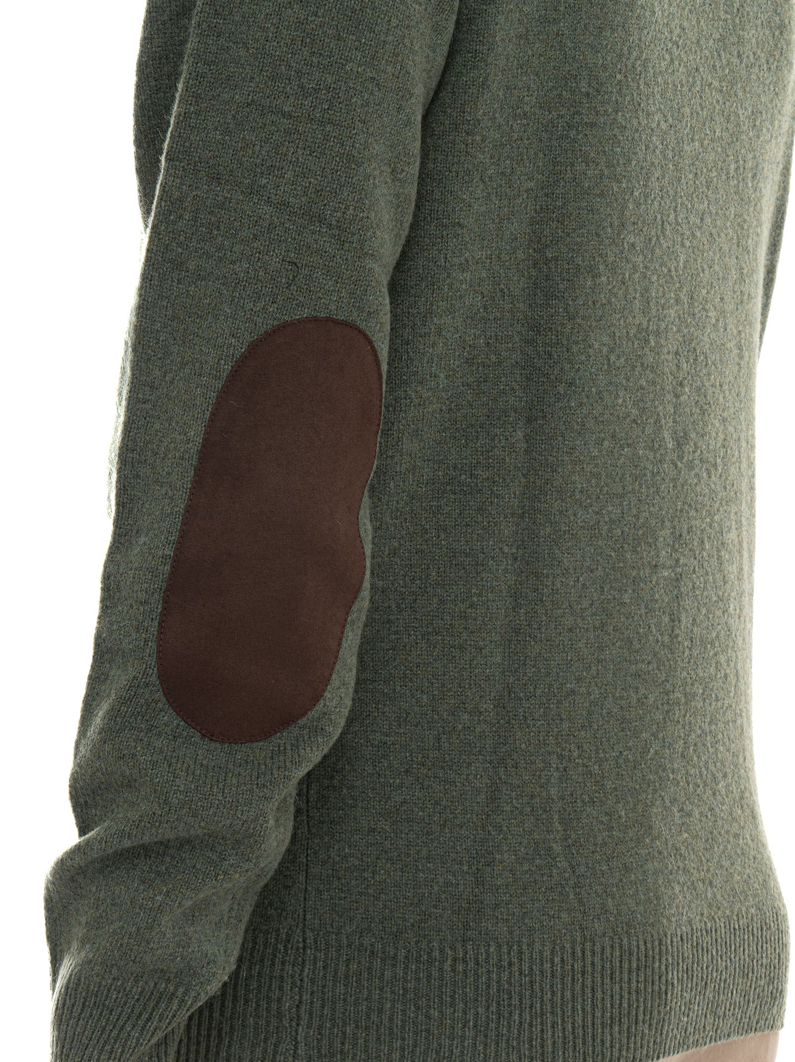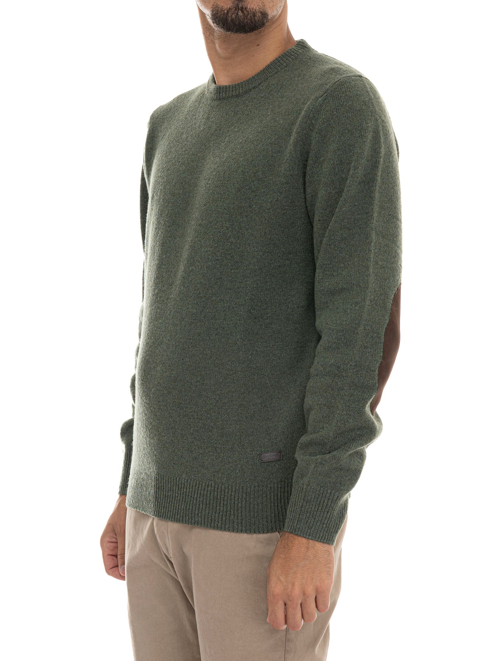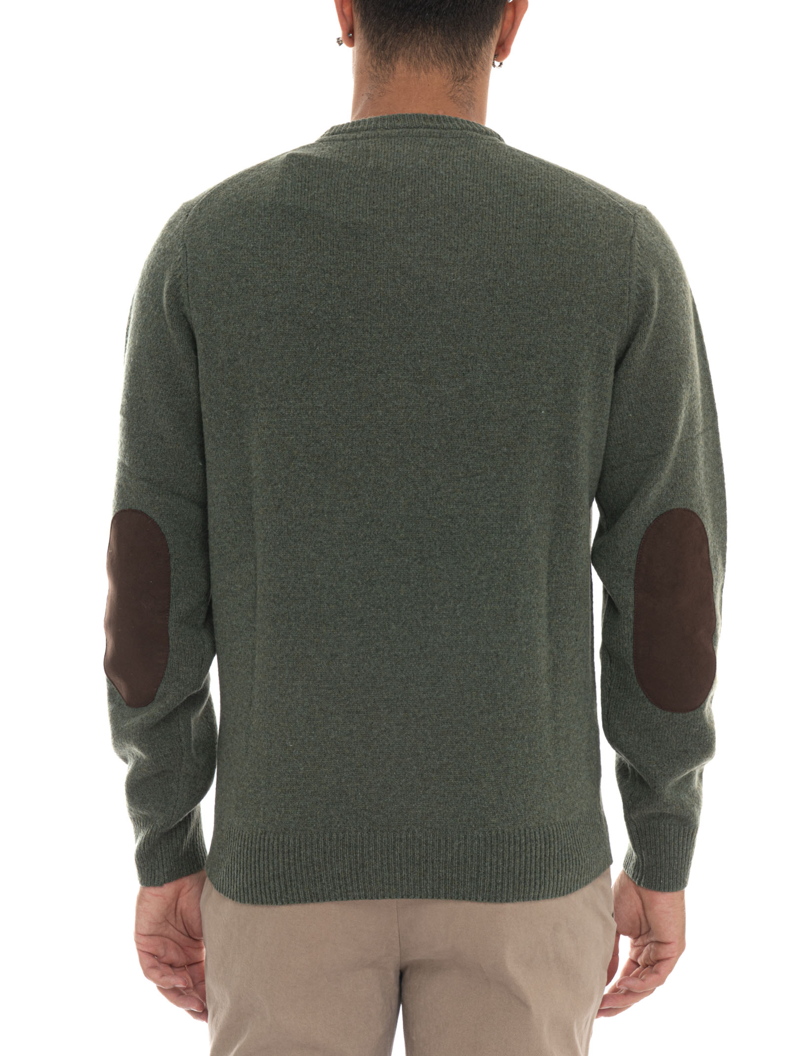 Crew neck sweater, contrasting elbow patches, solid color, contrasting stitched logo, composition: 100% wool, line: BARBOUR.