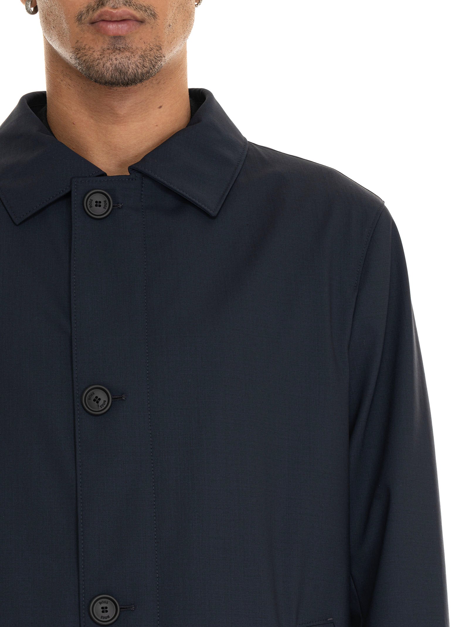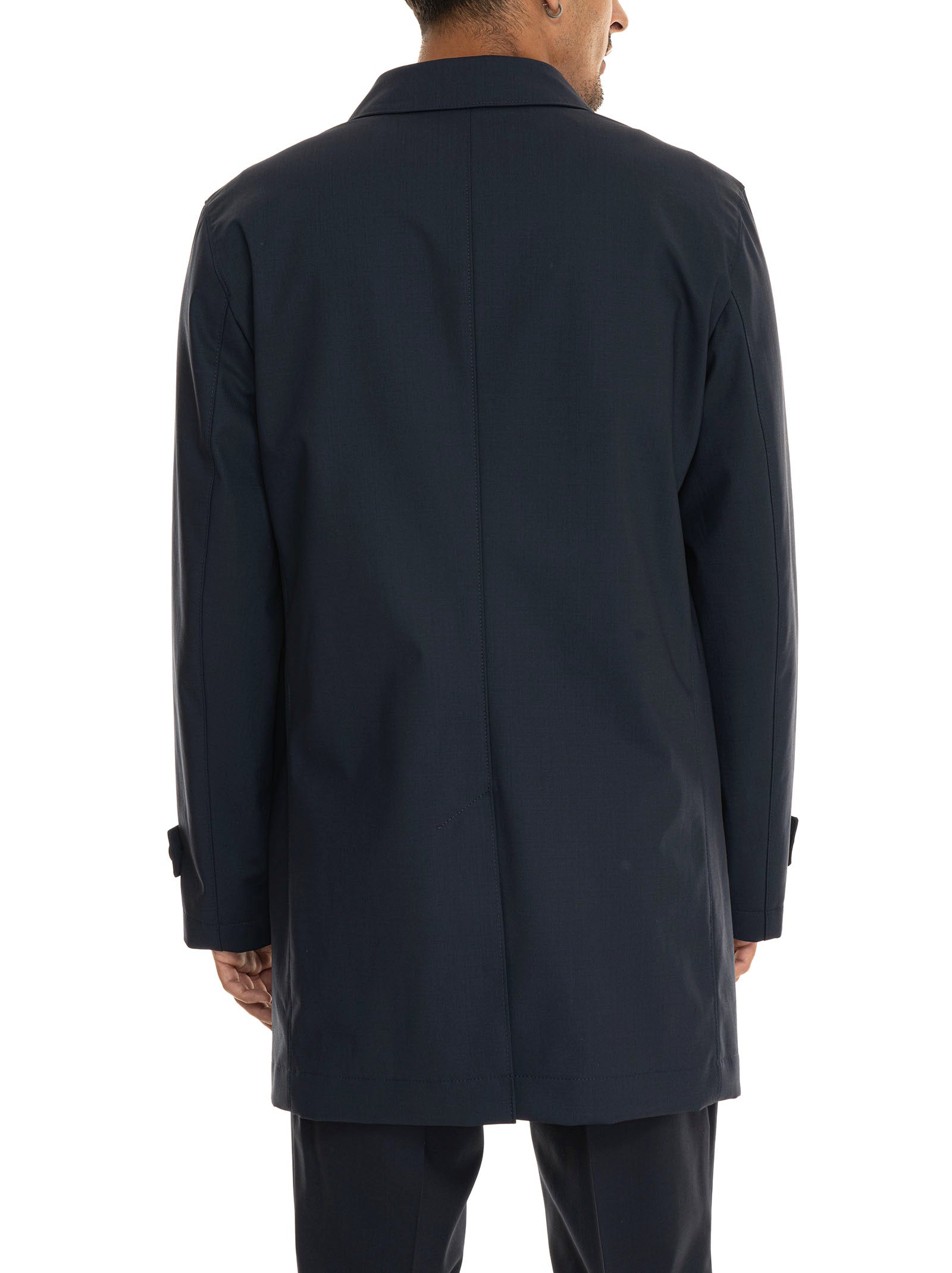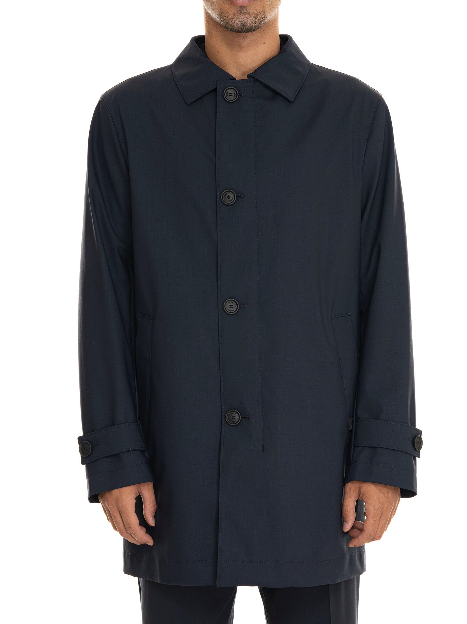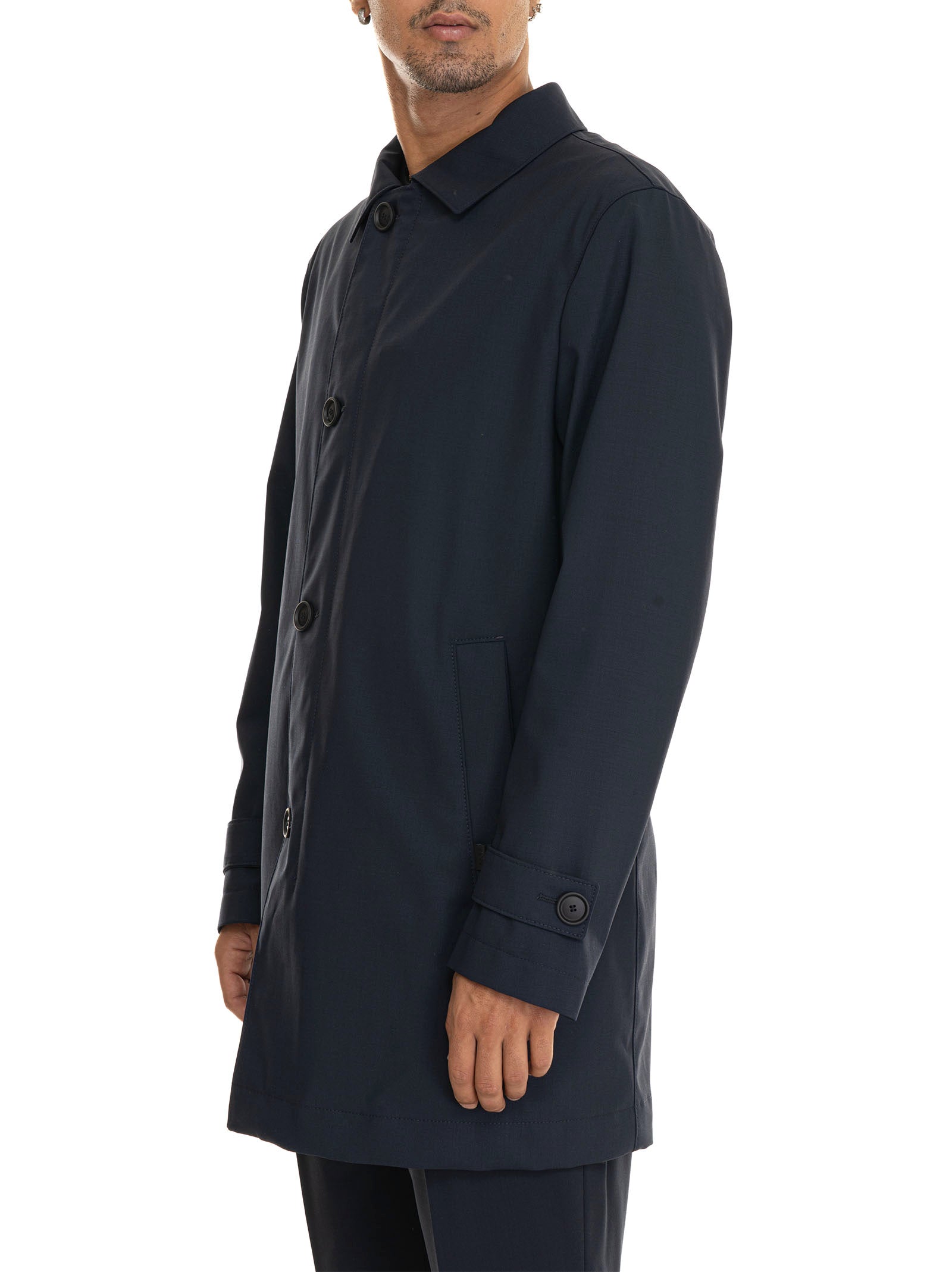 Long trench coat, double slider zip fastening, logo button fastening, buttoned cuff, external pockets, water resistant, back slit, composition: 53% polyester, 43% wool, 4% elastane, line: BOSS.