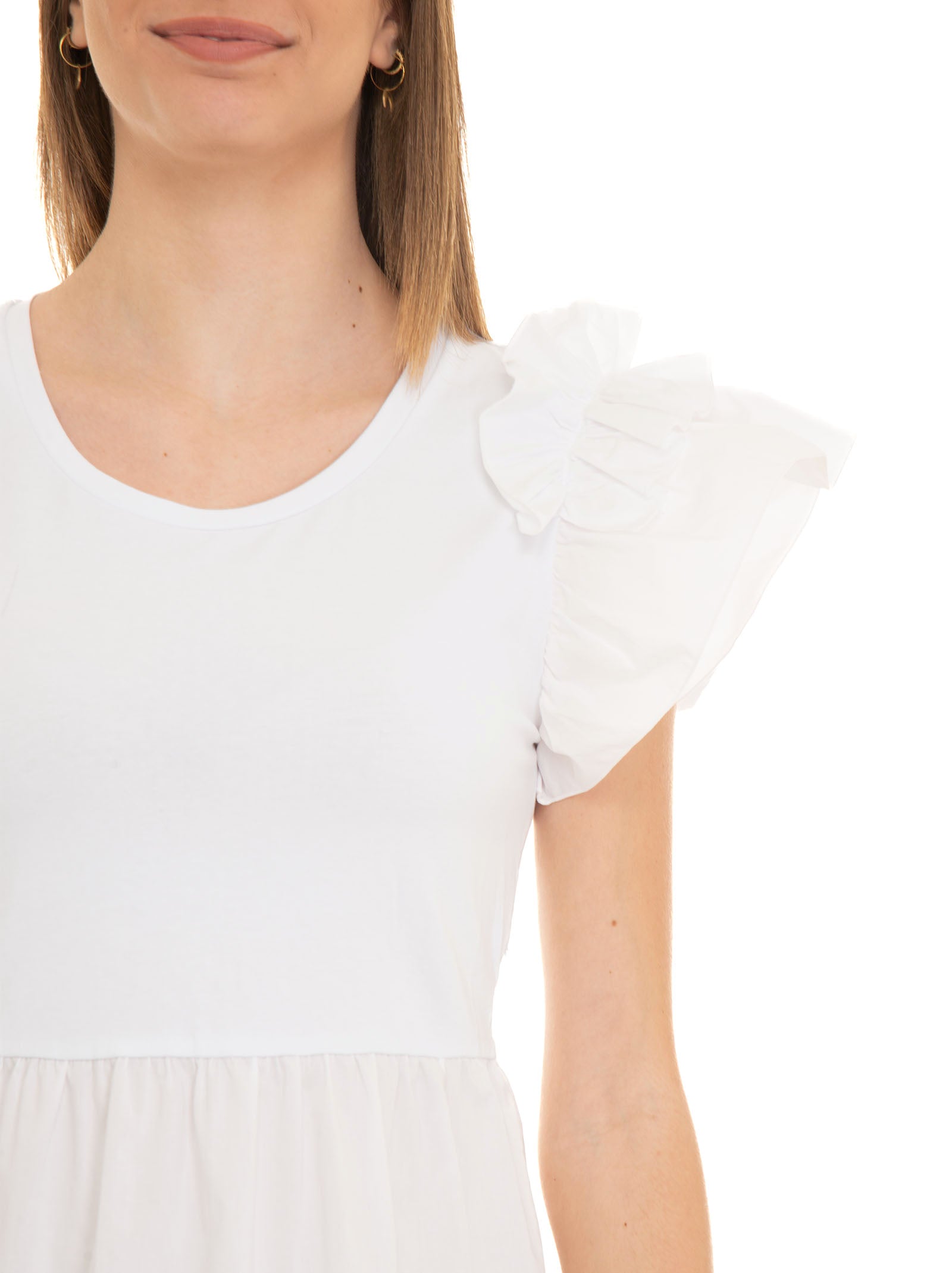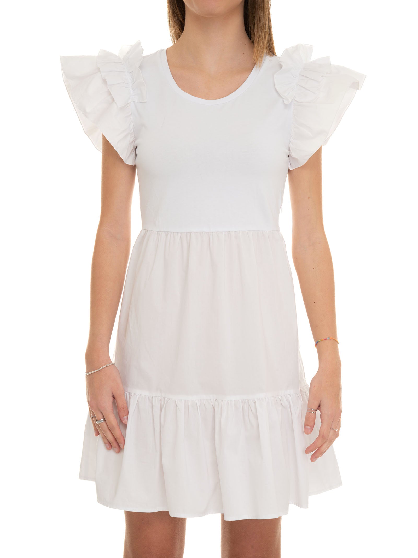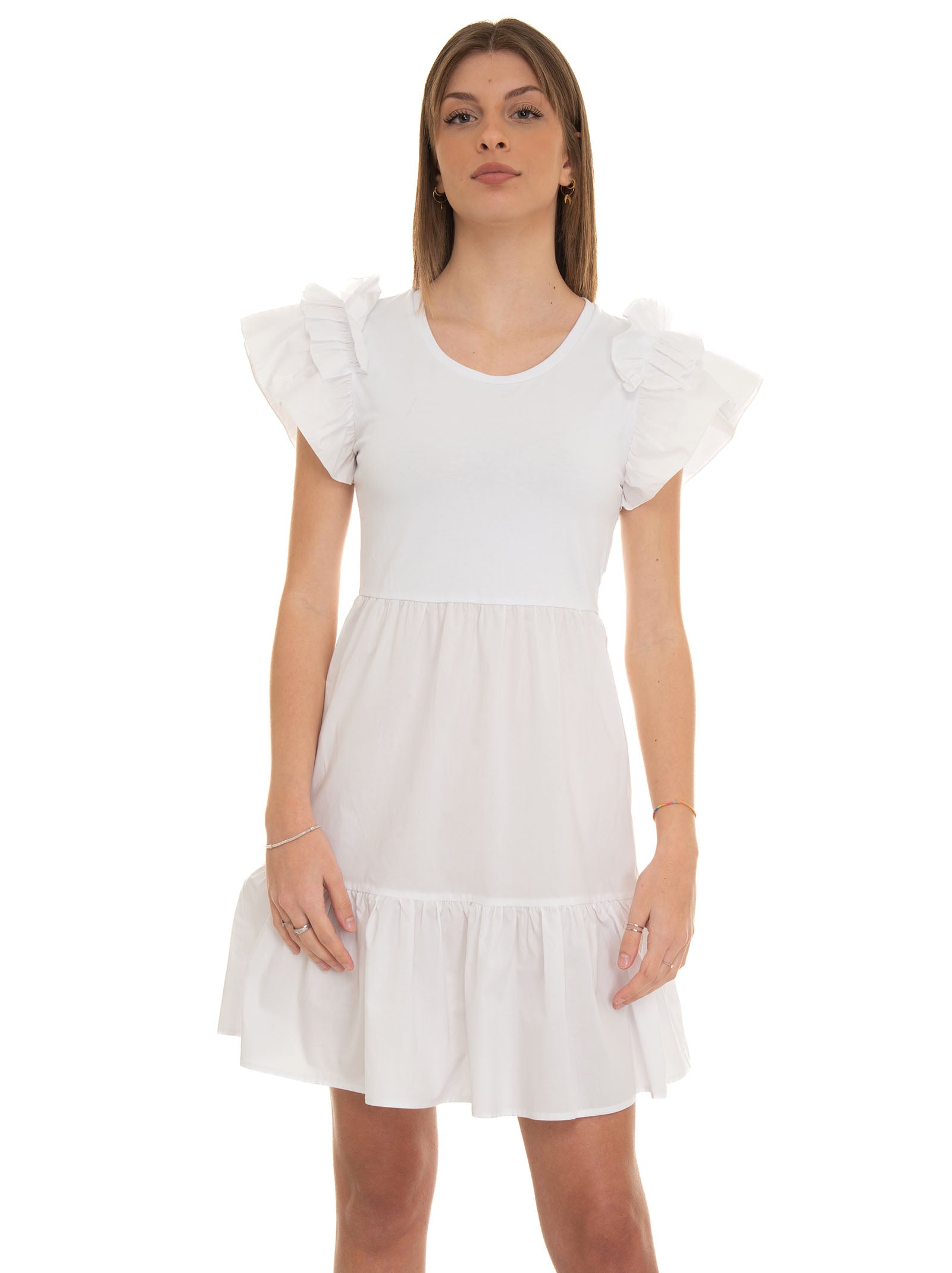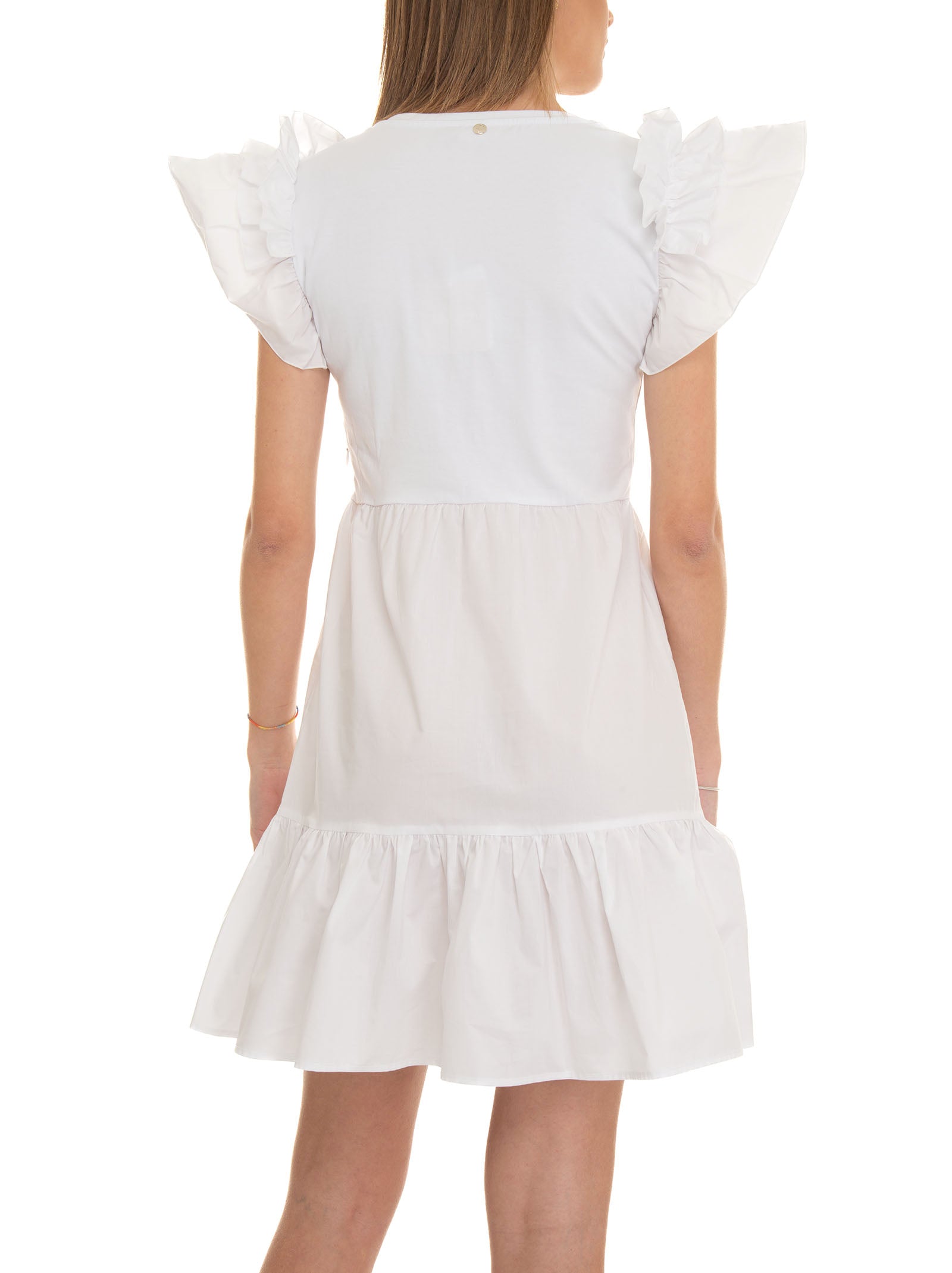 Short dress with round neck and armholes, cap sleeves, ruffles on the sleeves, cut at the waist, flounce on the bottom, regular fit, composition: 99% cotton, line: LIU JO.