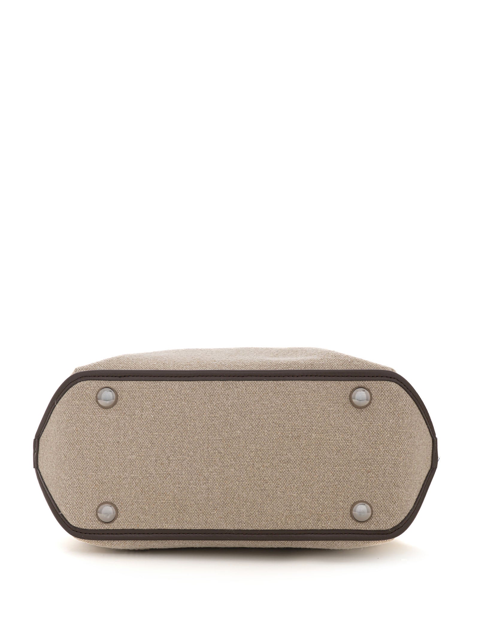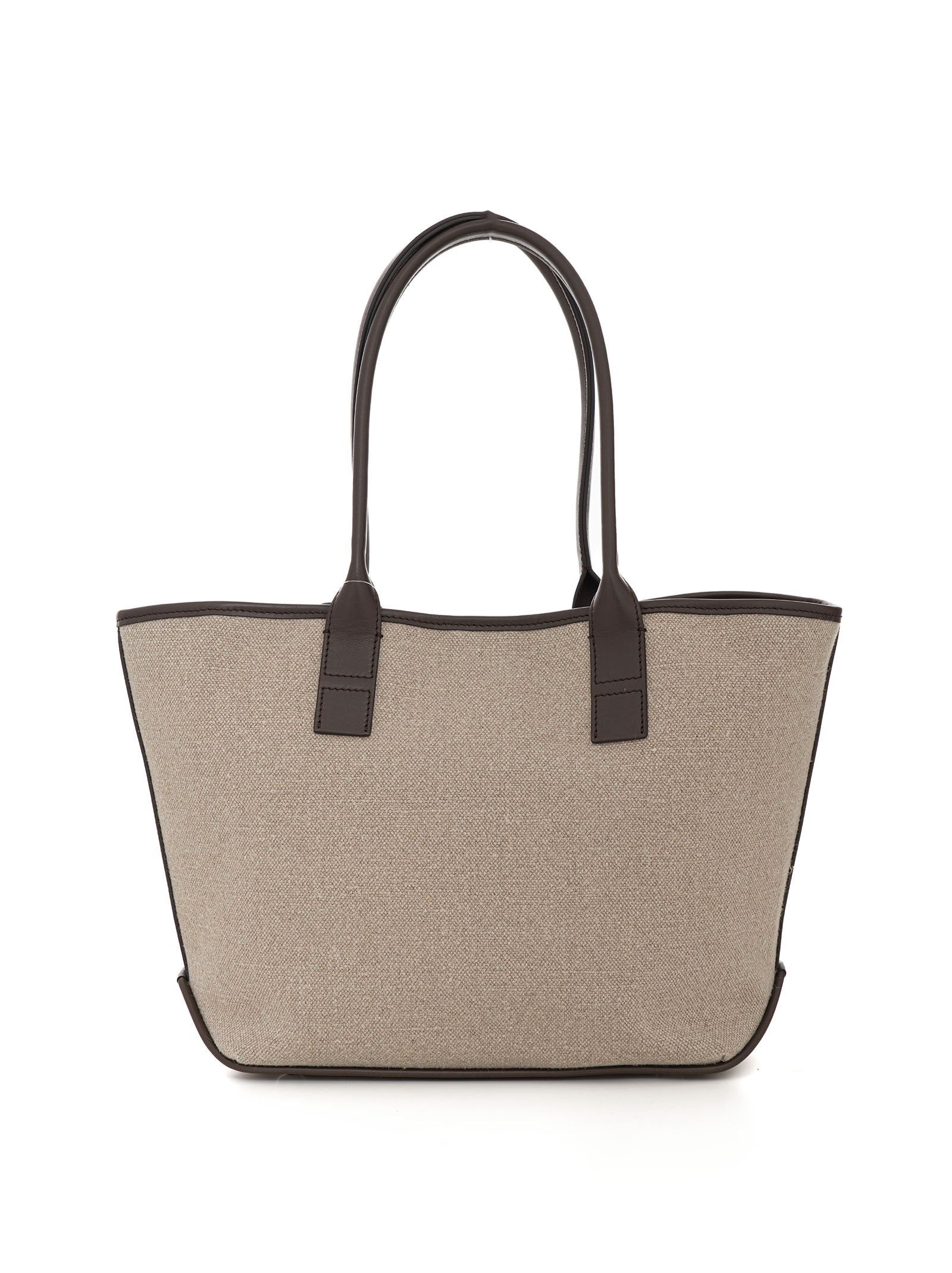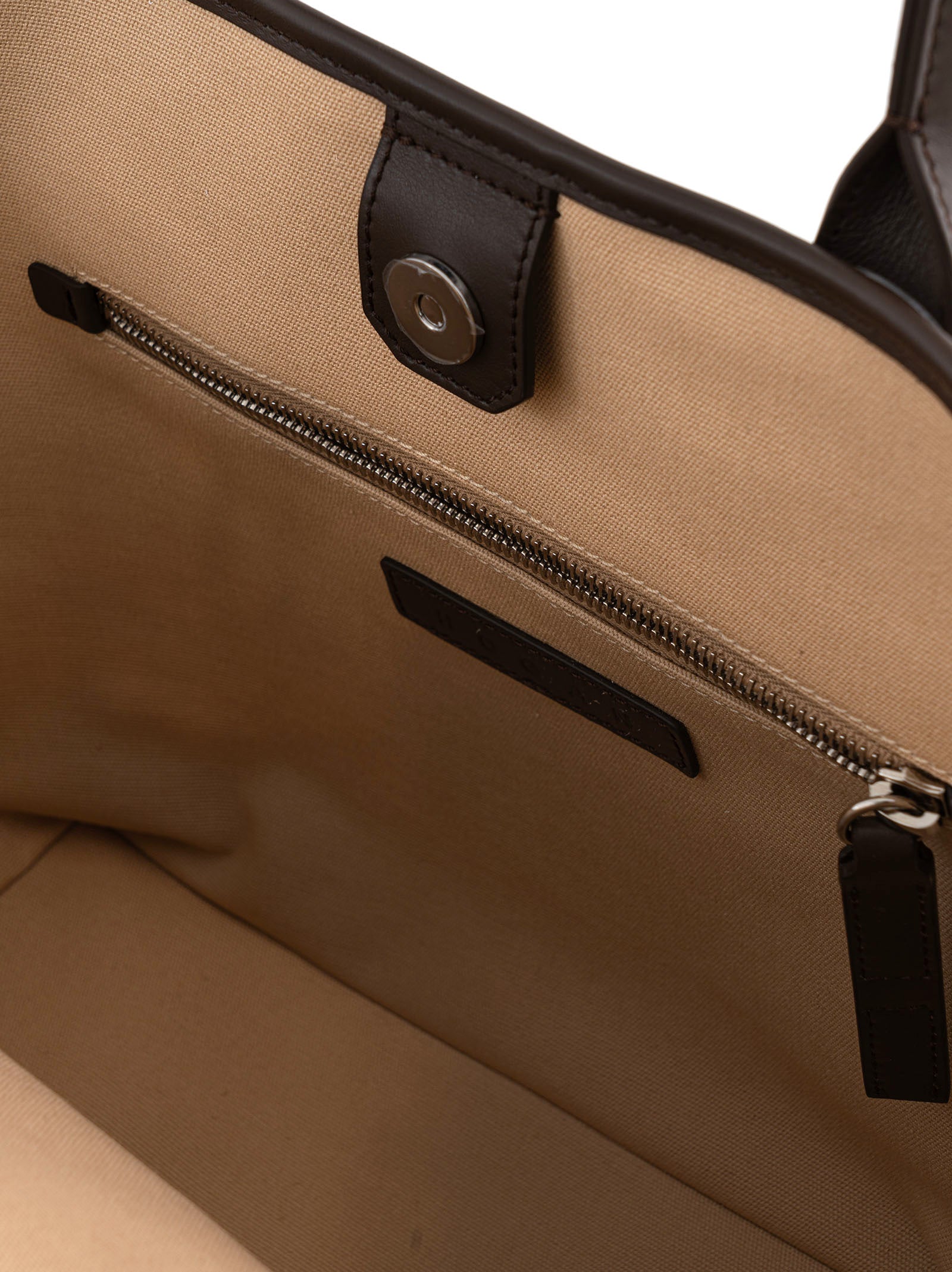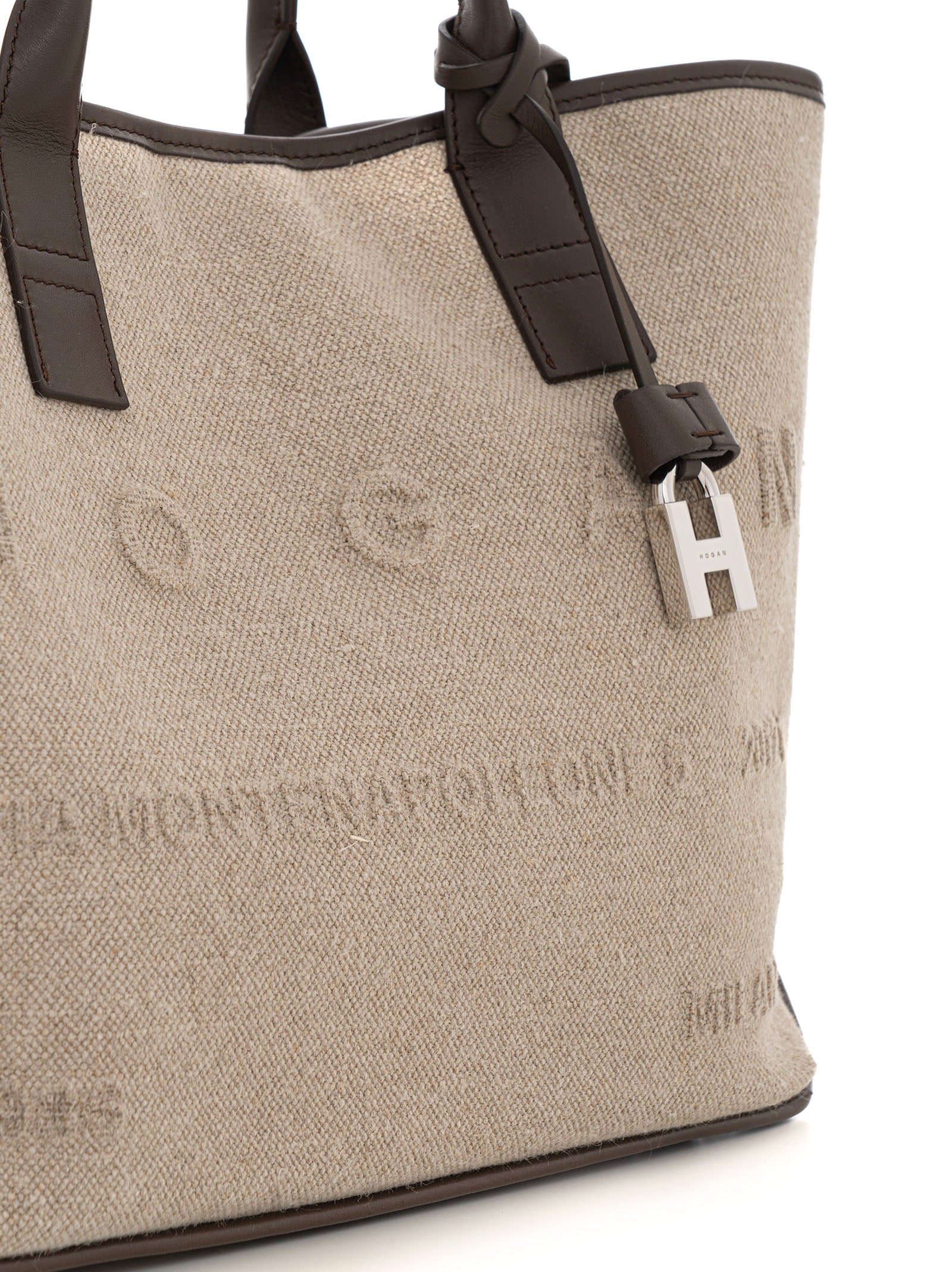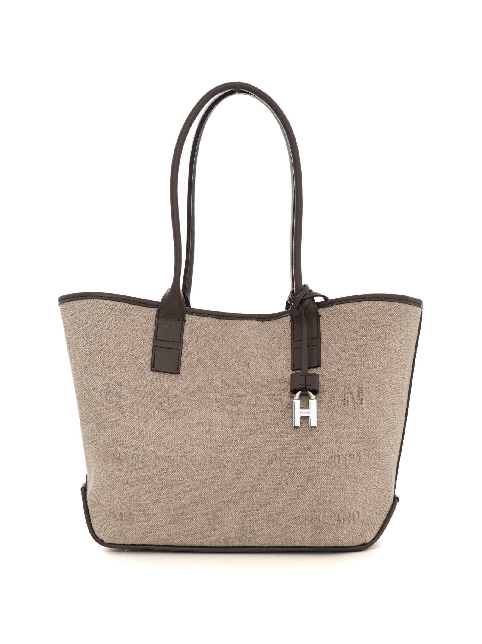 Borsa modello shopper, inserti in pelle, chiusura con bottone magnetico, piedini metallici alla base, logo in rilievo, composizione: 20% pelle, 80% lino, linea: HOGAN.