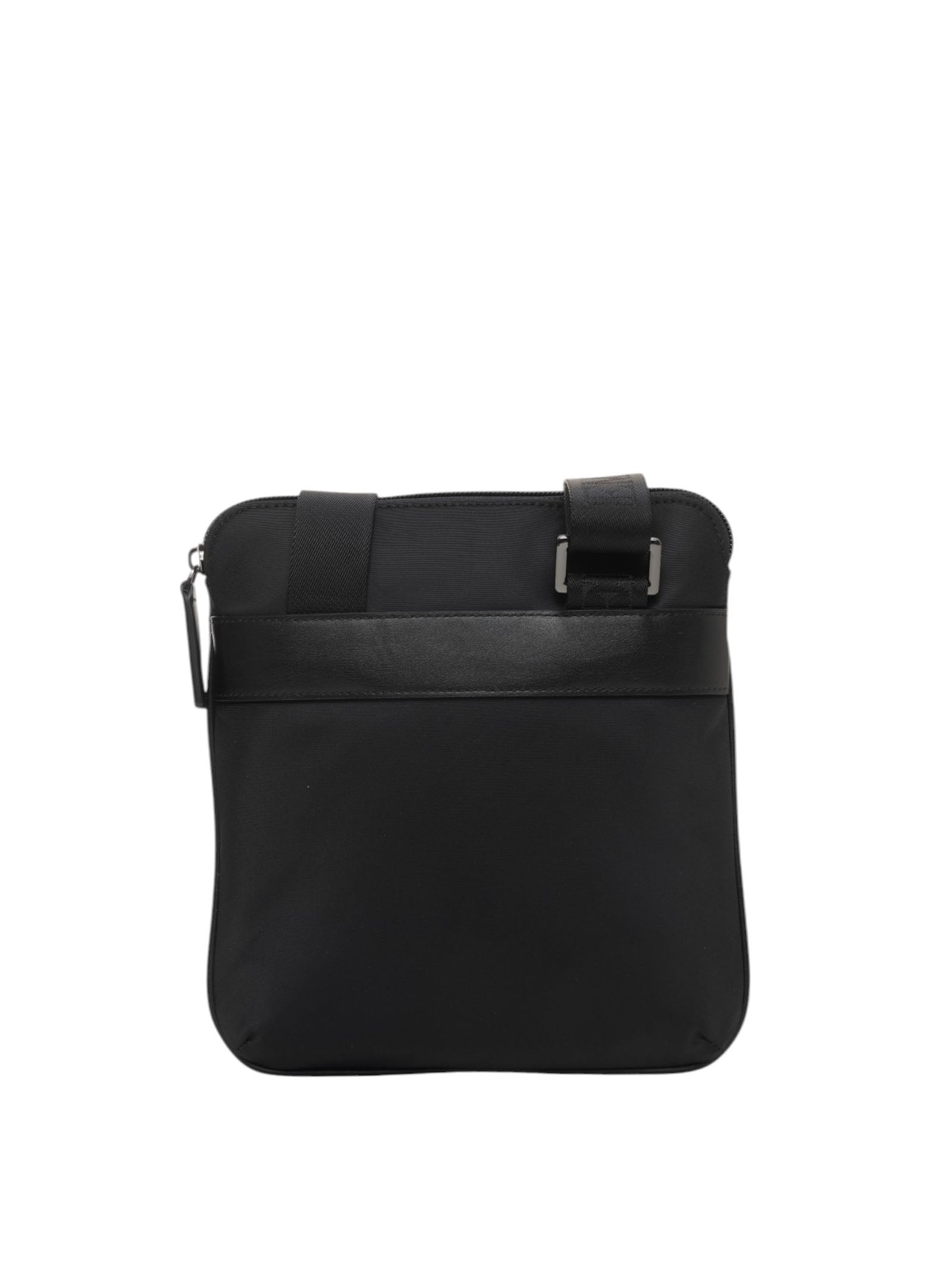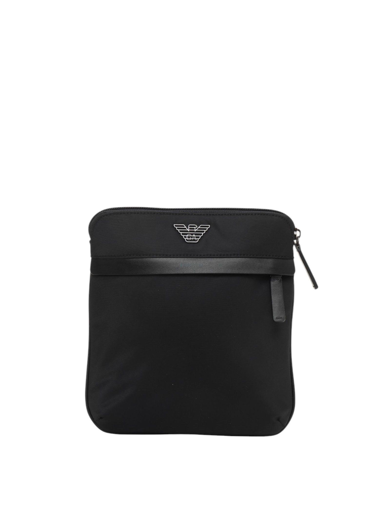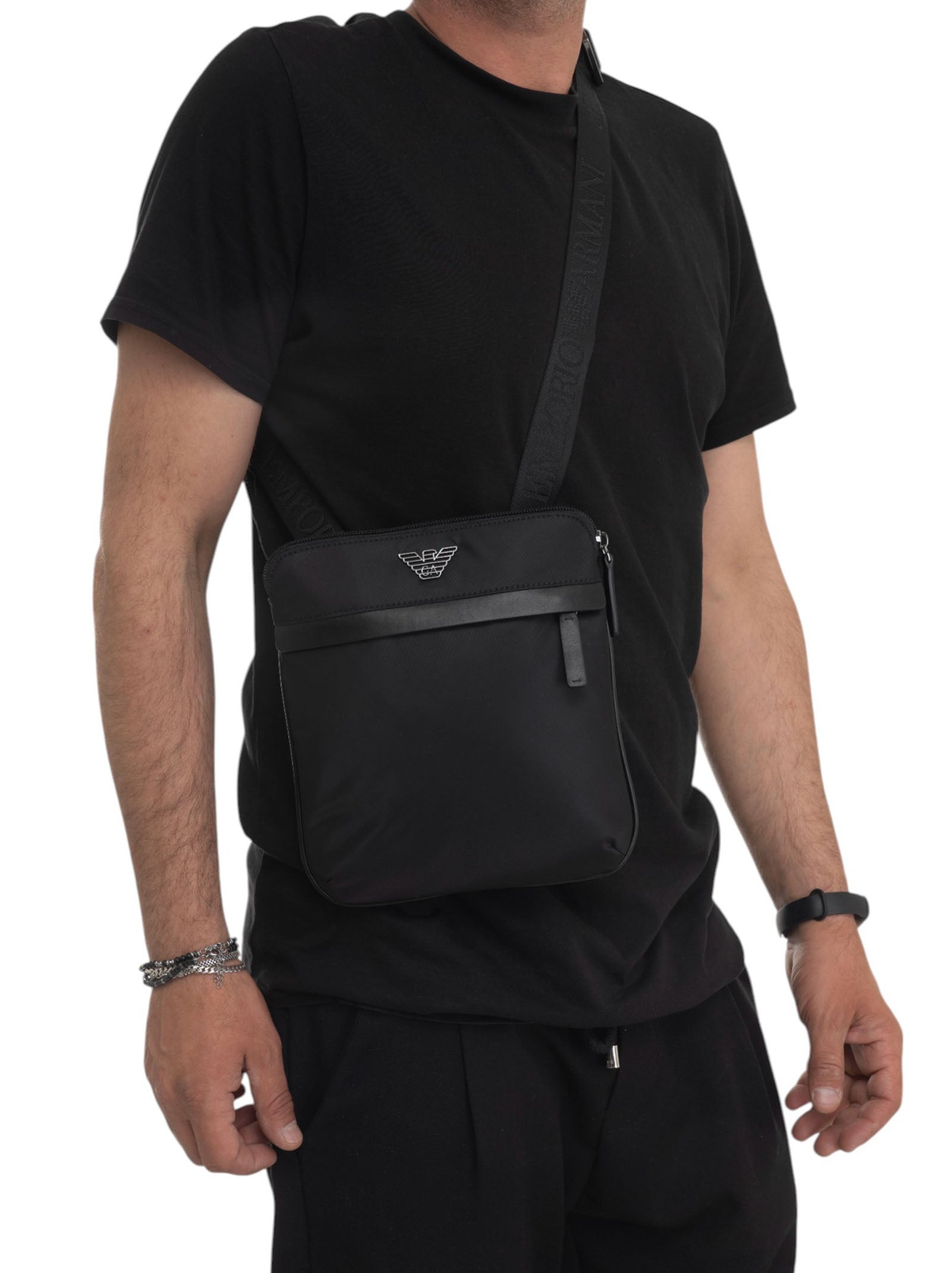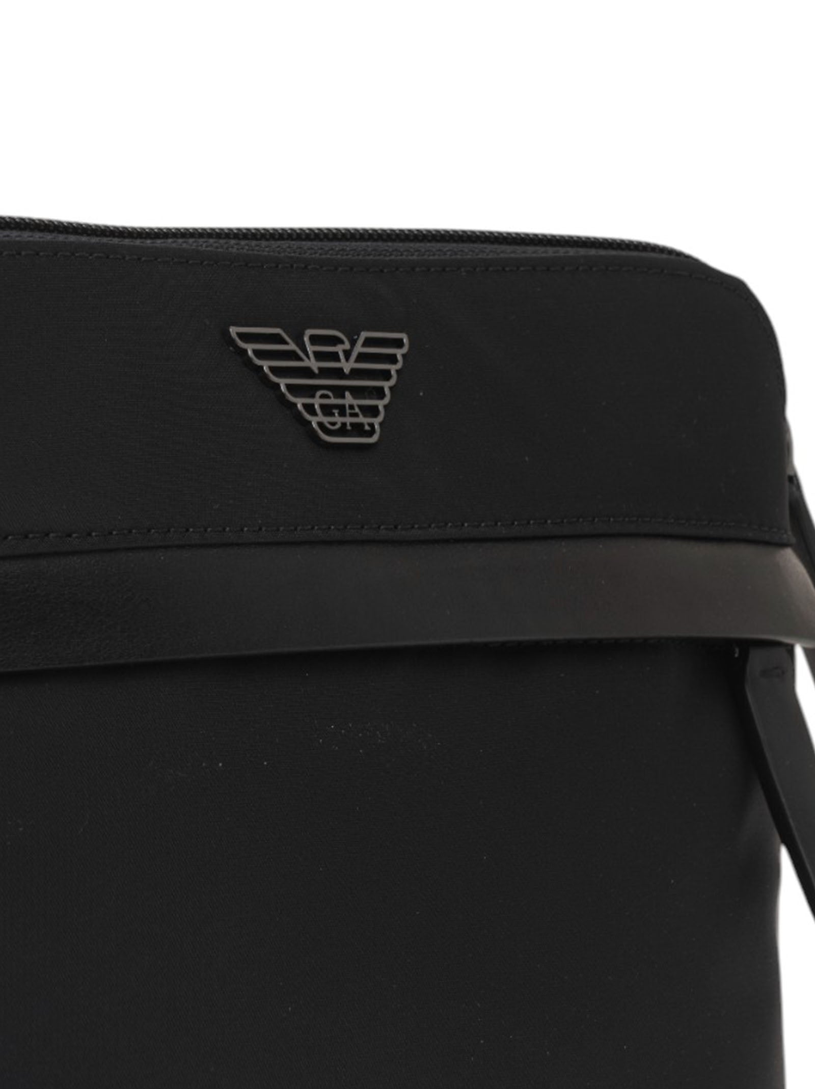 Shoulder bag, adjustable shoulder strap, front logo, front pocket, zip closure, leather trim, composition: nylon leather, line: EMPORIO ARMANI.