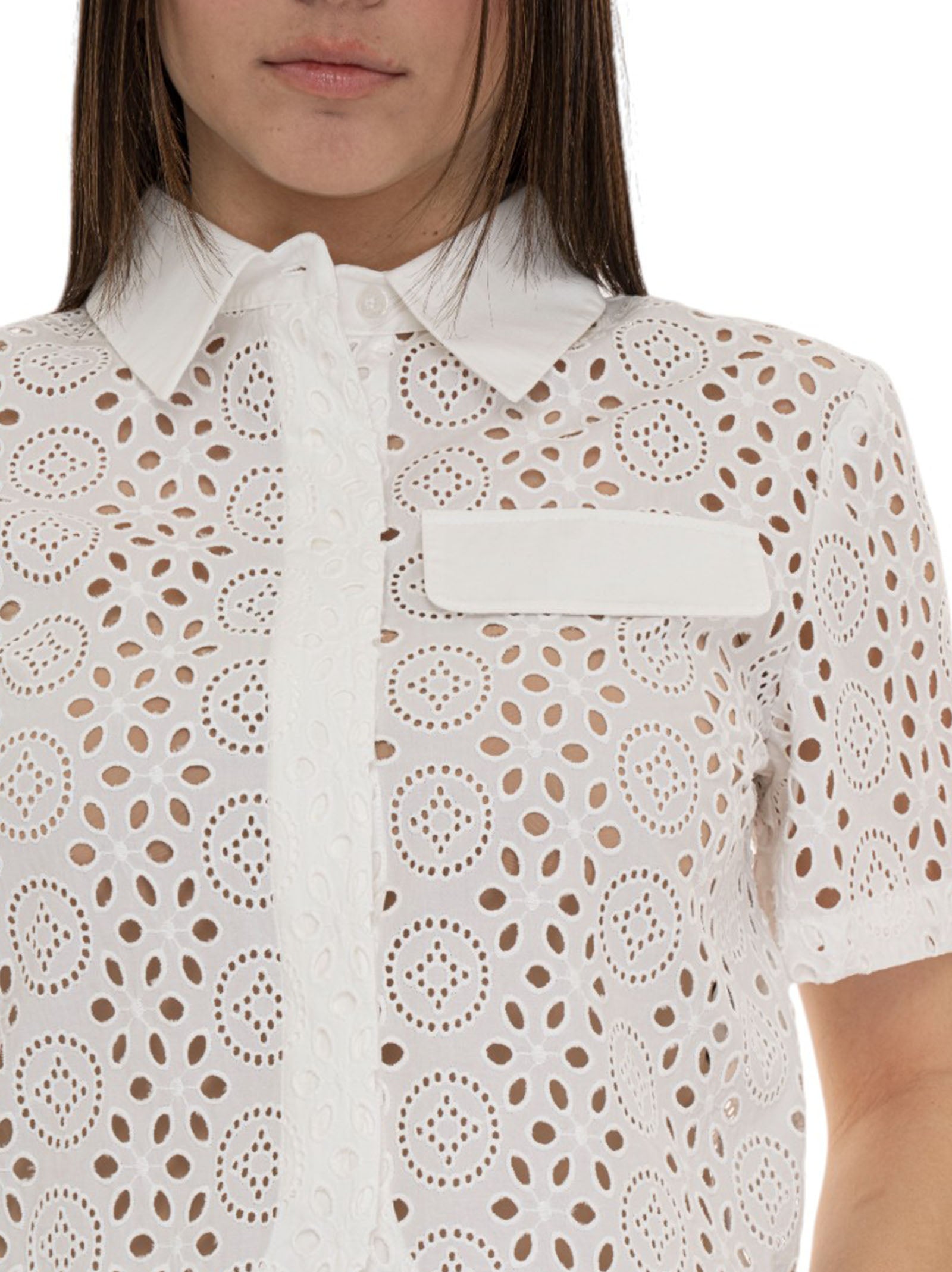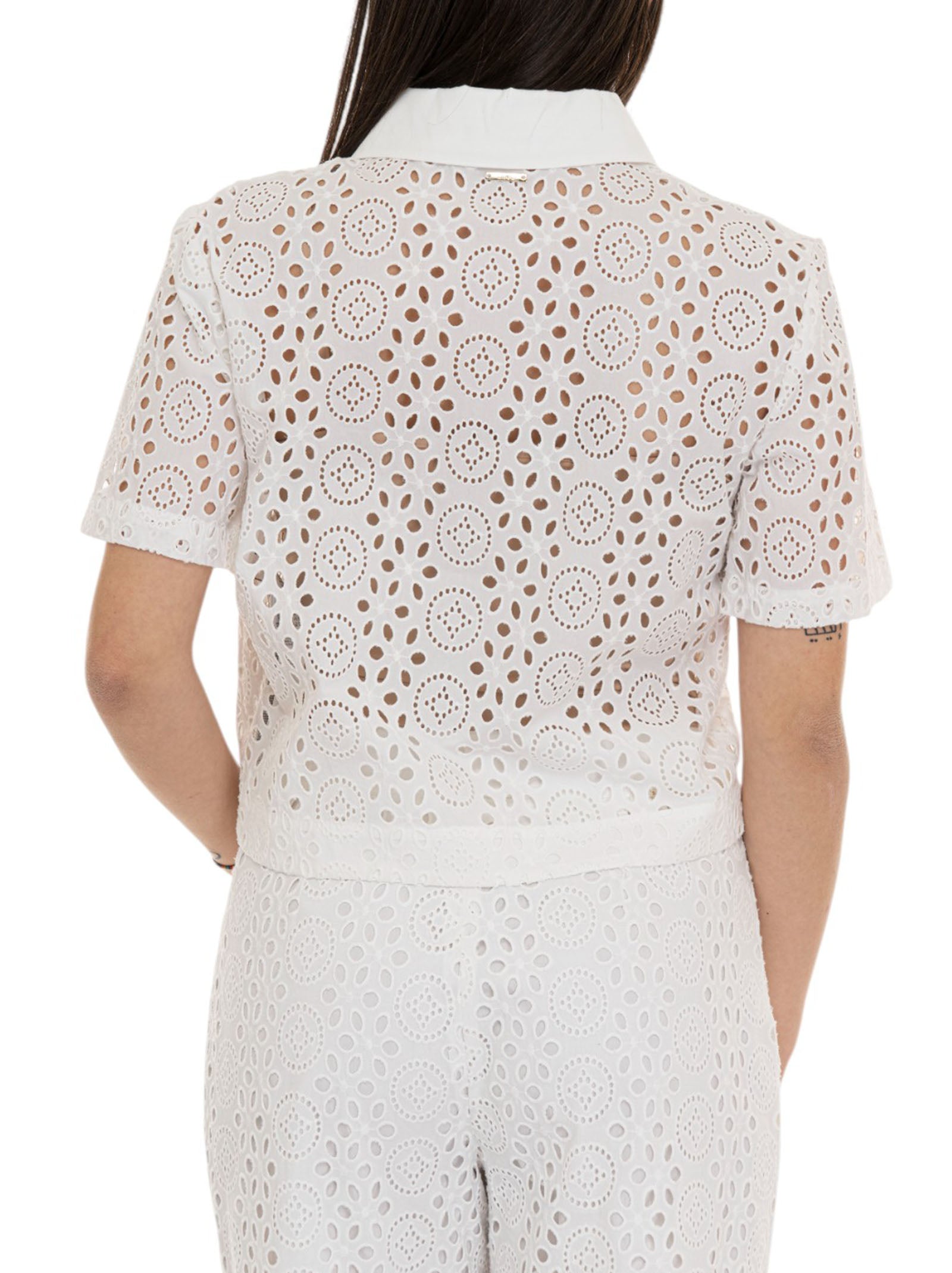 Women's shirt, classic collar, cropped length, button fastening, Sangallo fabric, logo tab, composition: 100% cotton, line: LIU JO.