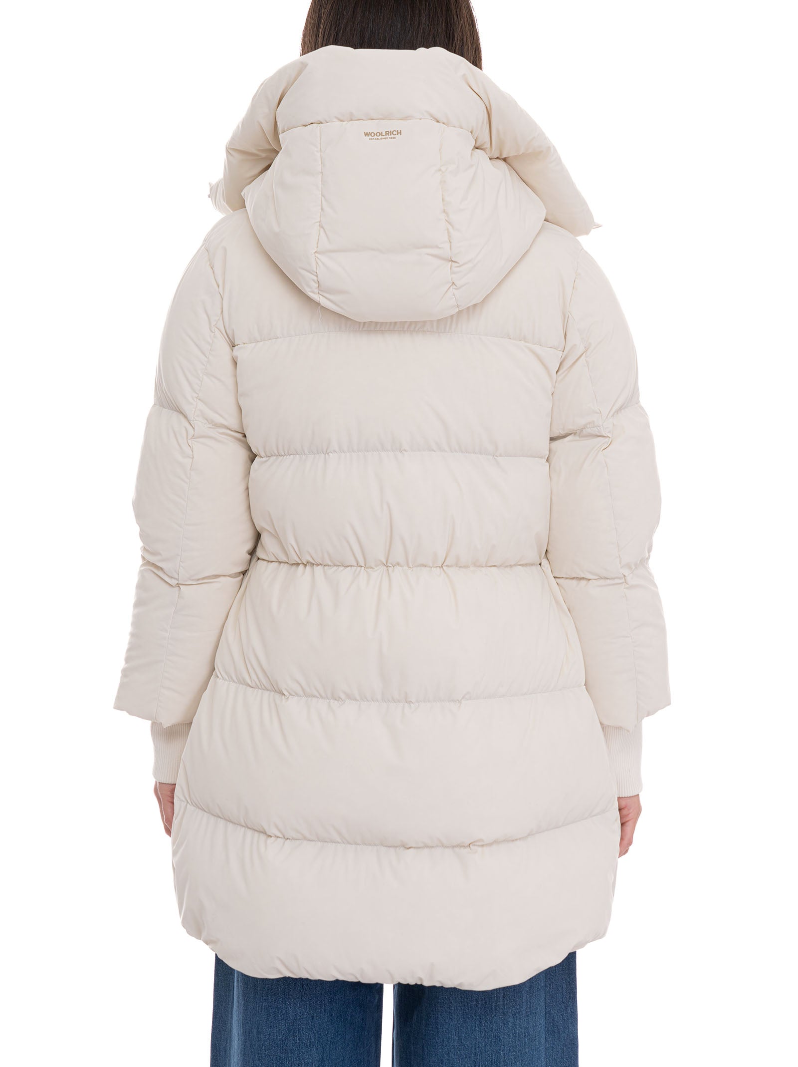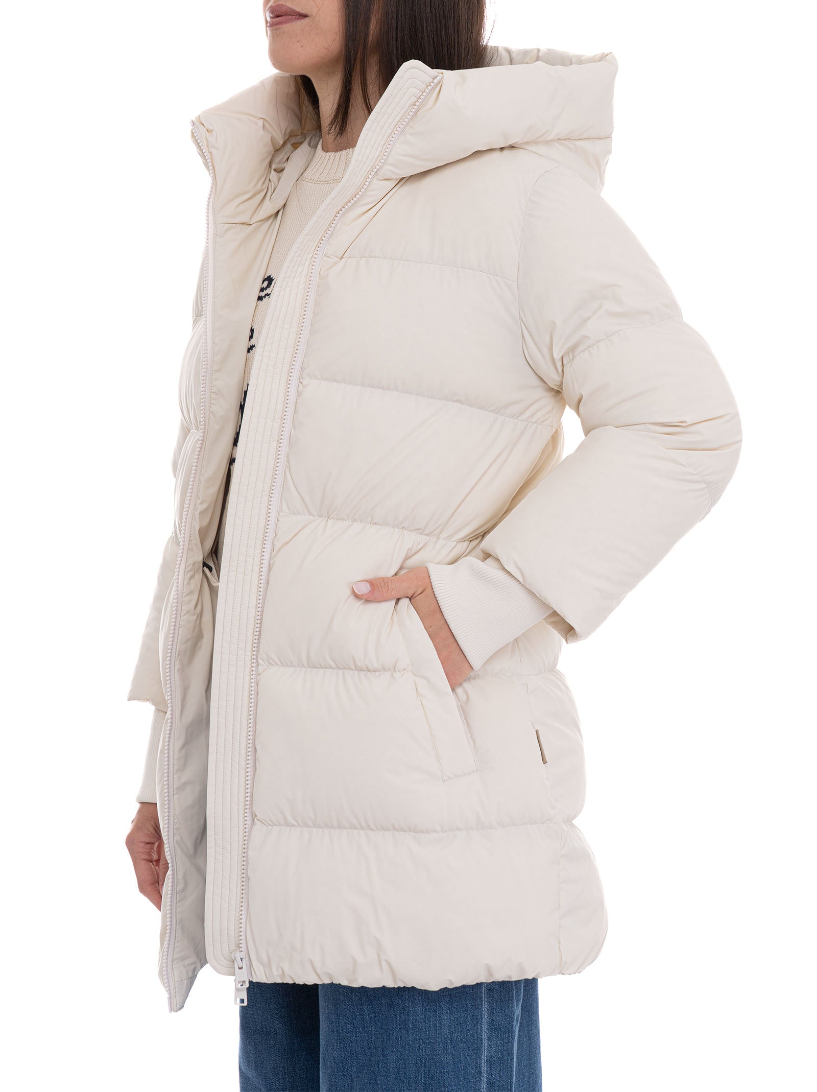 Woolrich CLOUD MADISON COAT hooded jacket, quilted, double slider zip fastening, side pockets, elasticated knit cuffs, logo tab, drawstring waist, composition: 86% polyamide, 14% elastane, lining: 90% duck down, 10% feather, line: WOOLRICH.