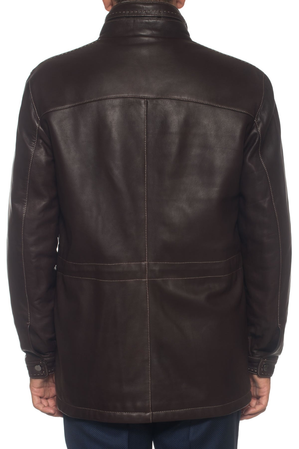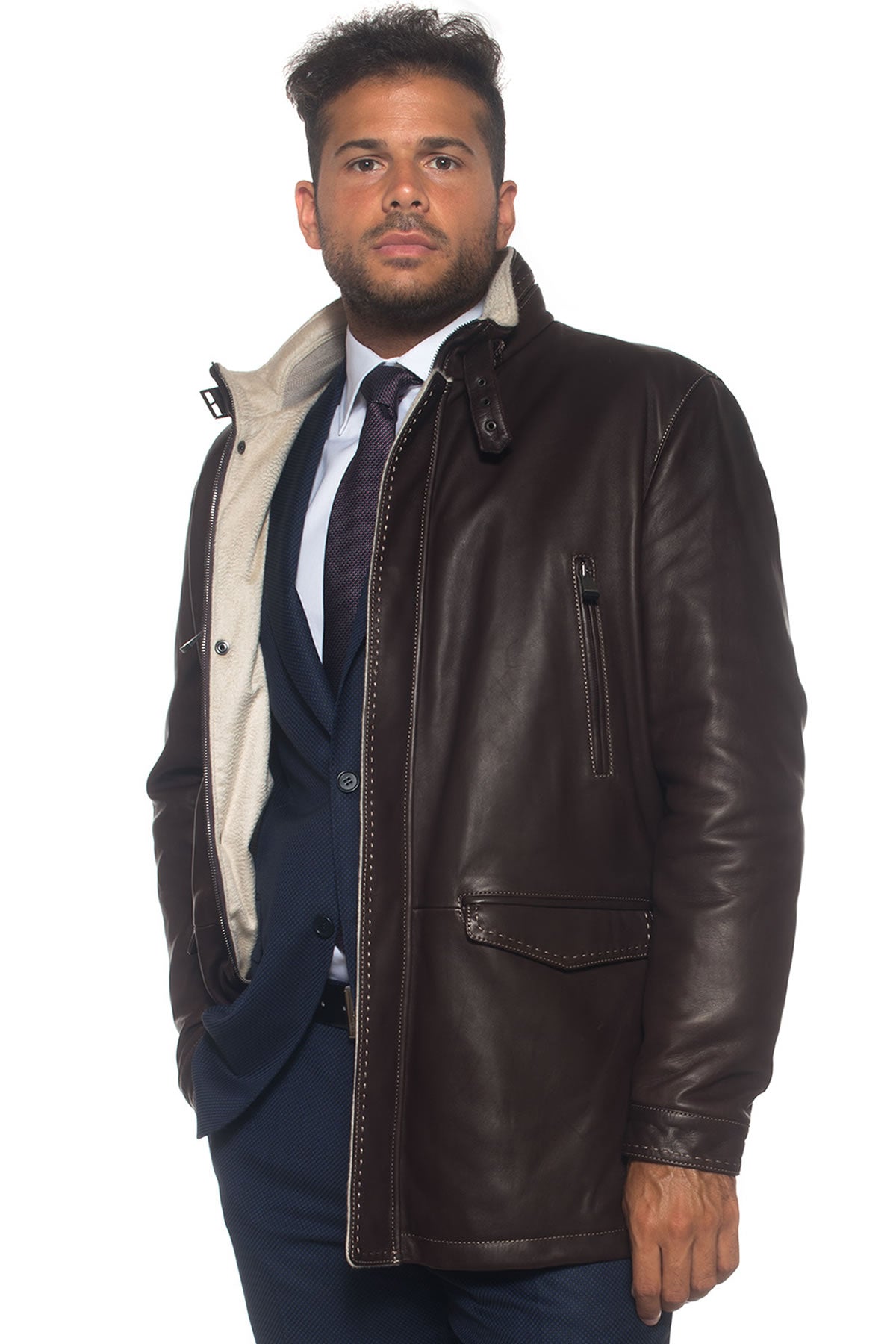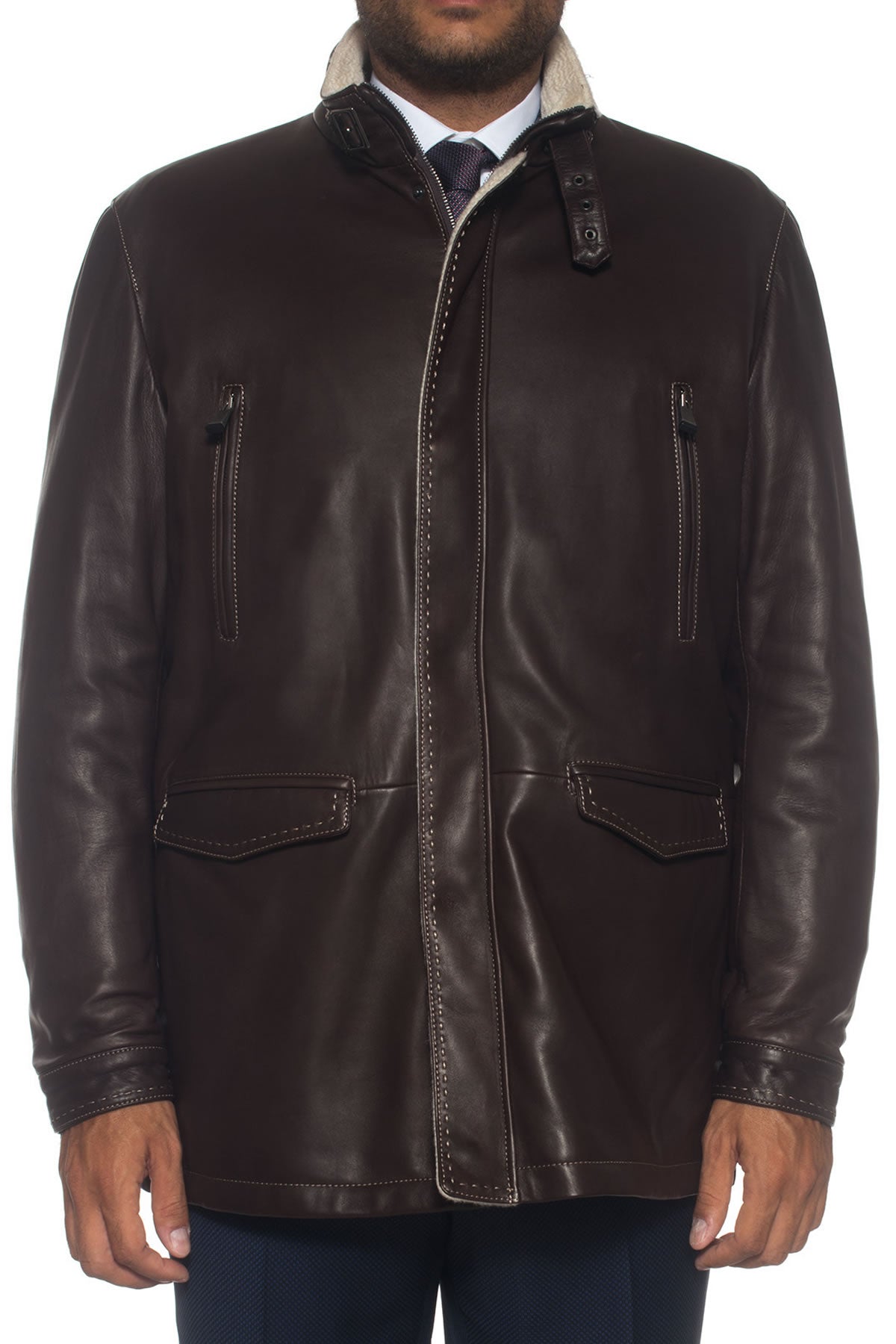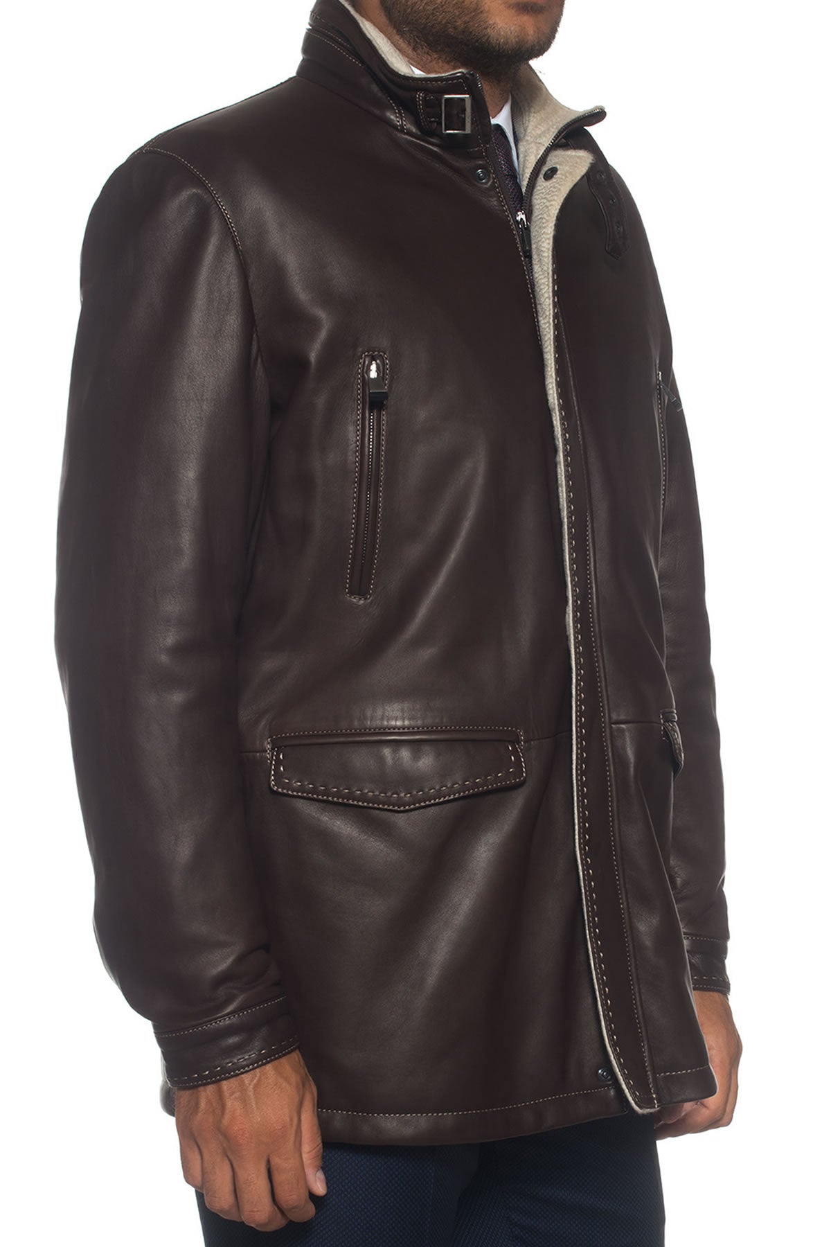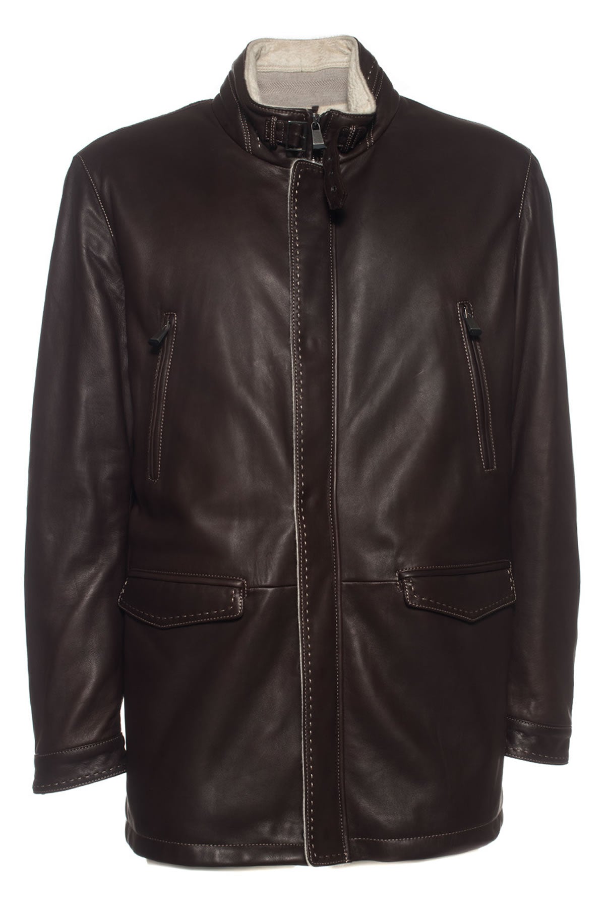 Jacket, concealed zip and button closure, 4 front pockets, contrasting stitching, made in Italy, comfort fit, composition: 100% leather, lining: 100% cashmere, line: LATINI.