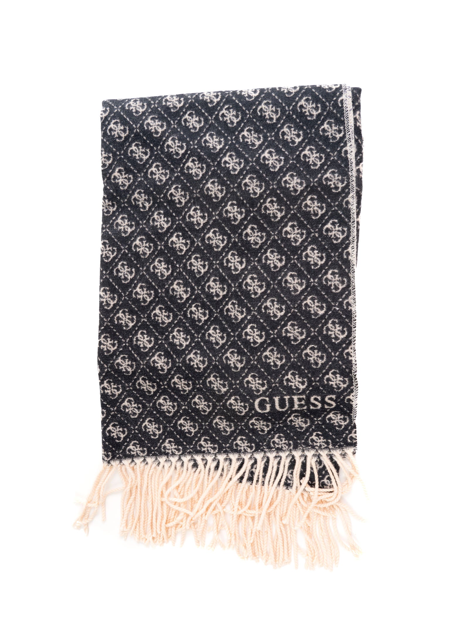 Sciarpa, logata, dettagli a contrasto di colore, frange sul fondo, dettagli in lurex, composizione: 48% viscosa, 43% poliestere, 8% poliammide, 1% metallizzato, linea: GUESS.