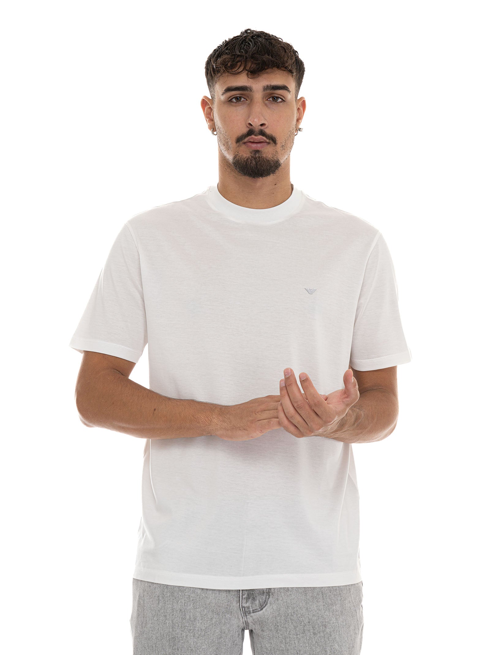 T-shirt, girocollo, mezza manica, logo piccolo frontale, composizione: 70% lyocell, 30% cotone, linea: EMPORIO ARMANI.