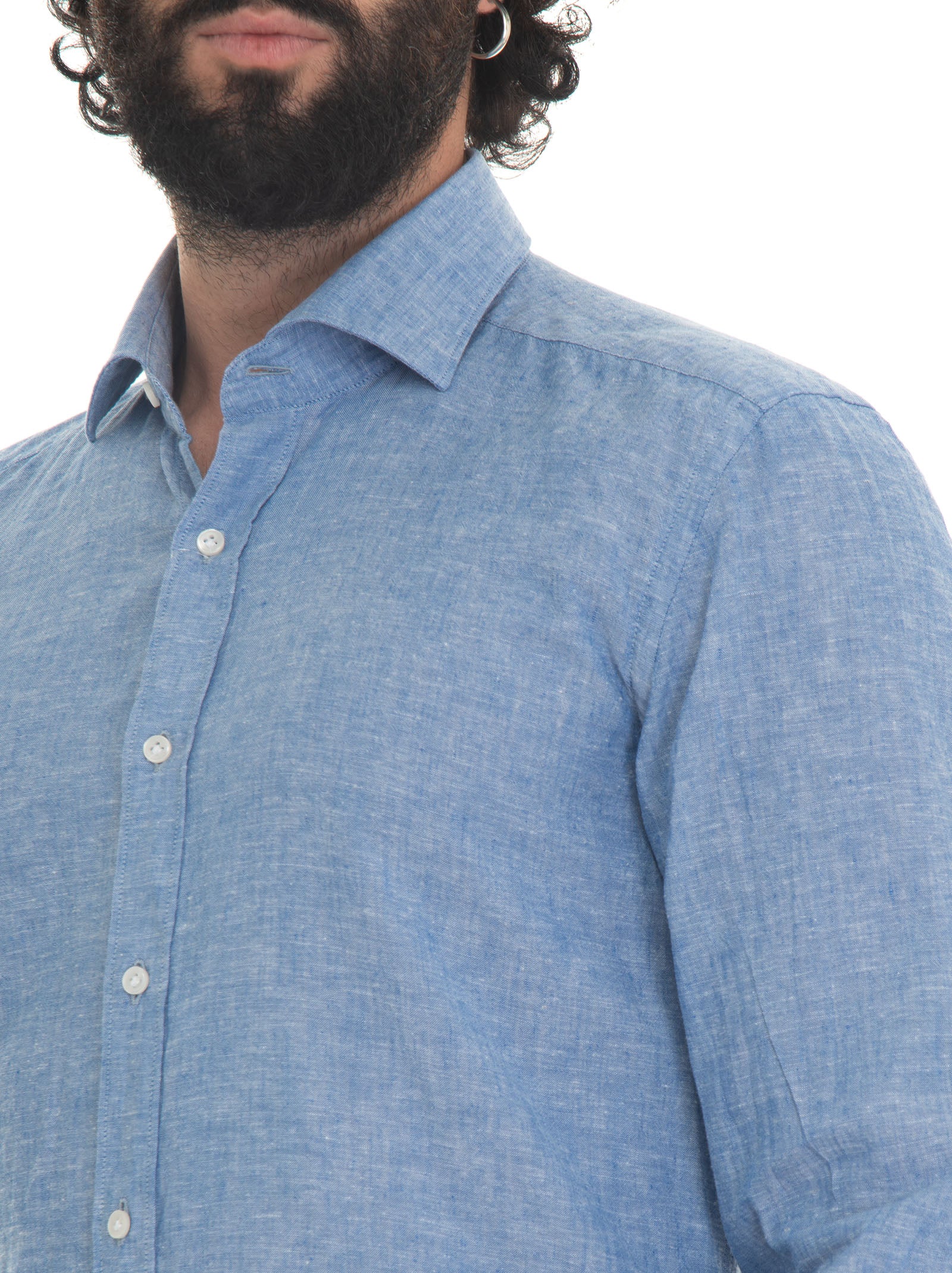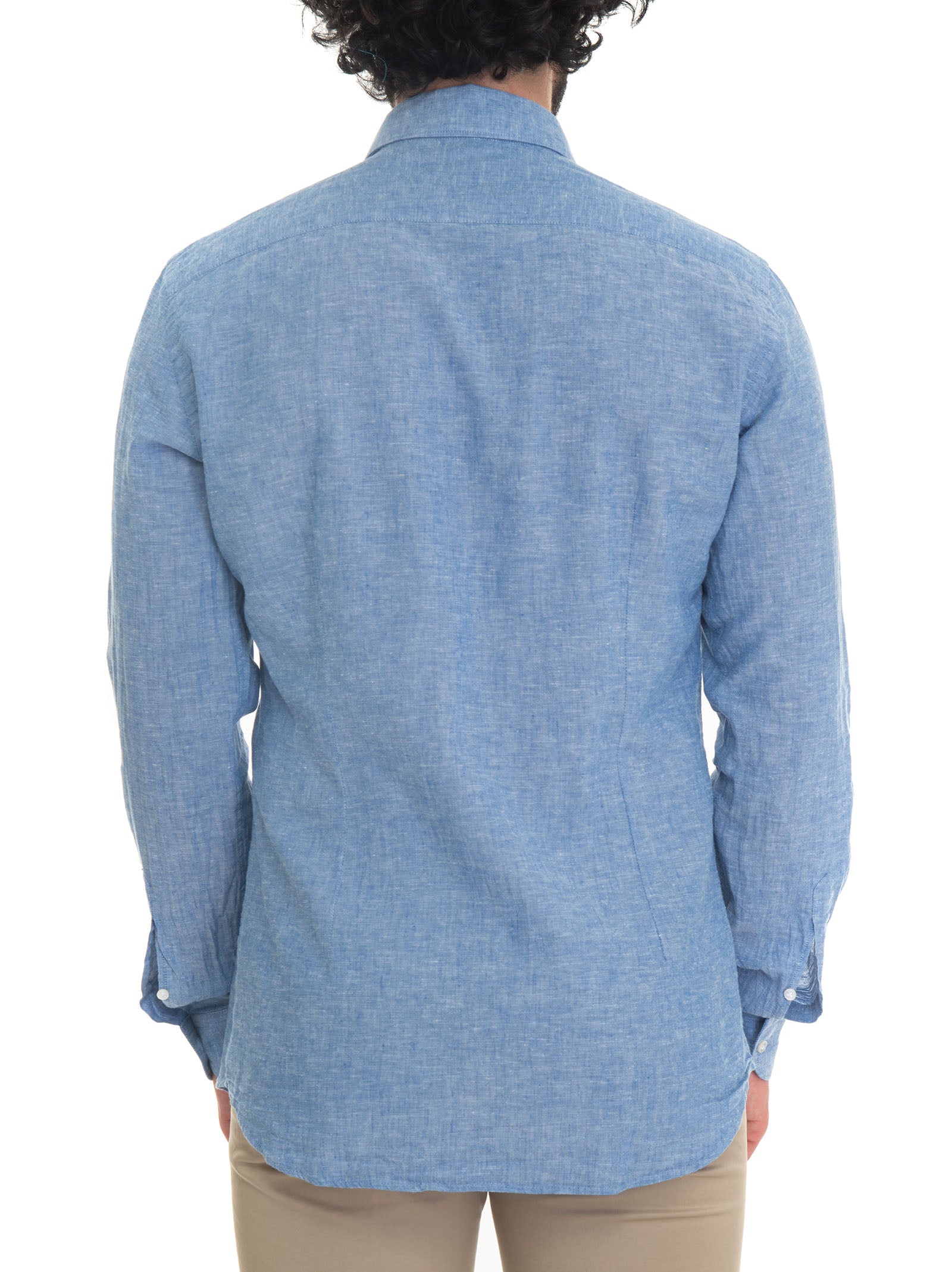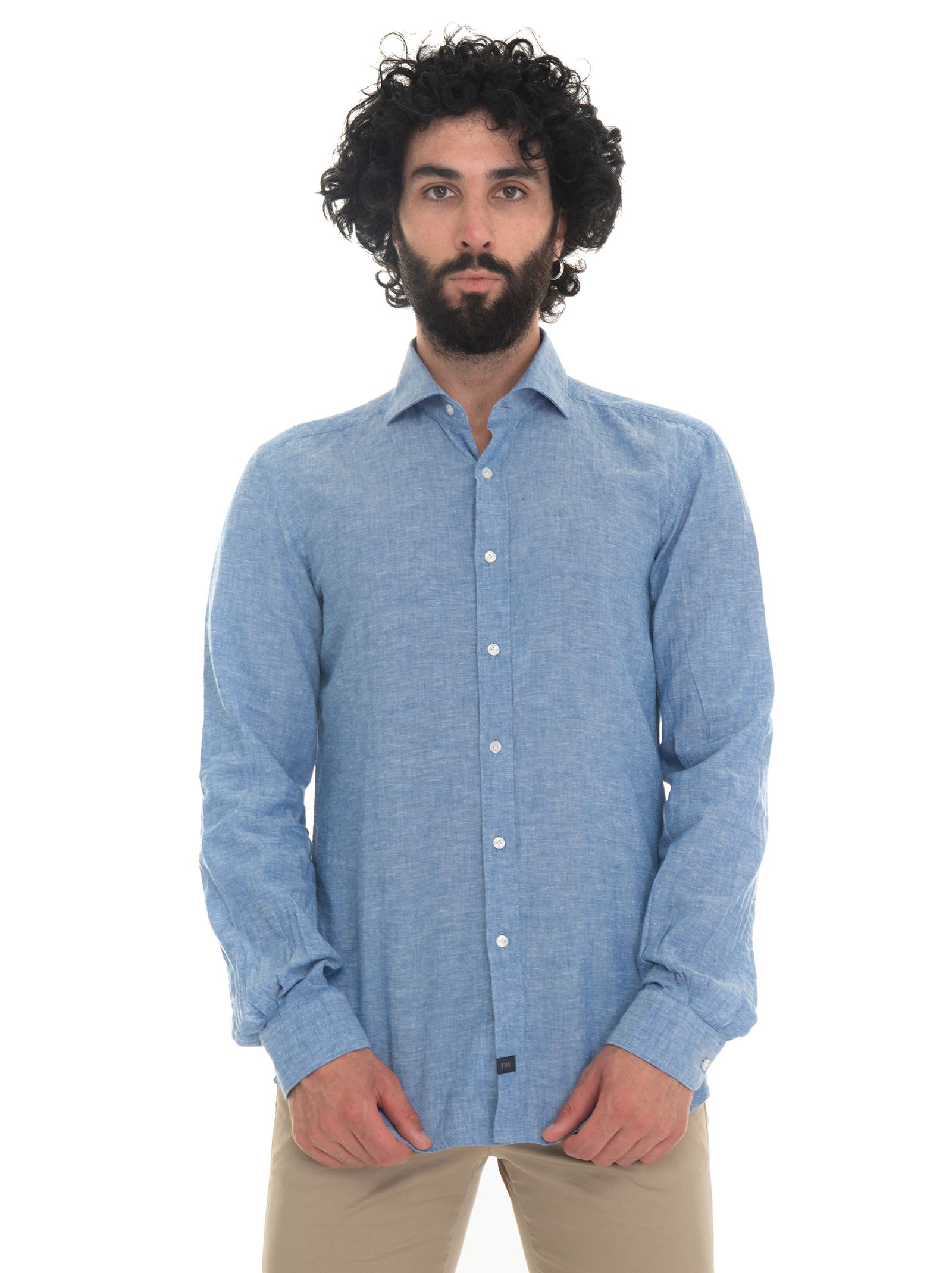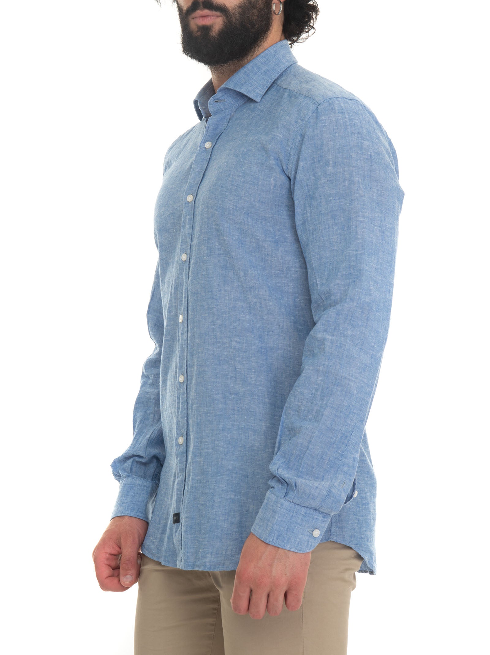 Casual shirt, classic French collar, slub effect, contrast stitched logo, back with two pleats, slim fit, composition: 55% linen, 45% cotton, line: FAY.