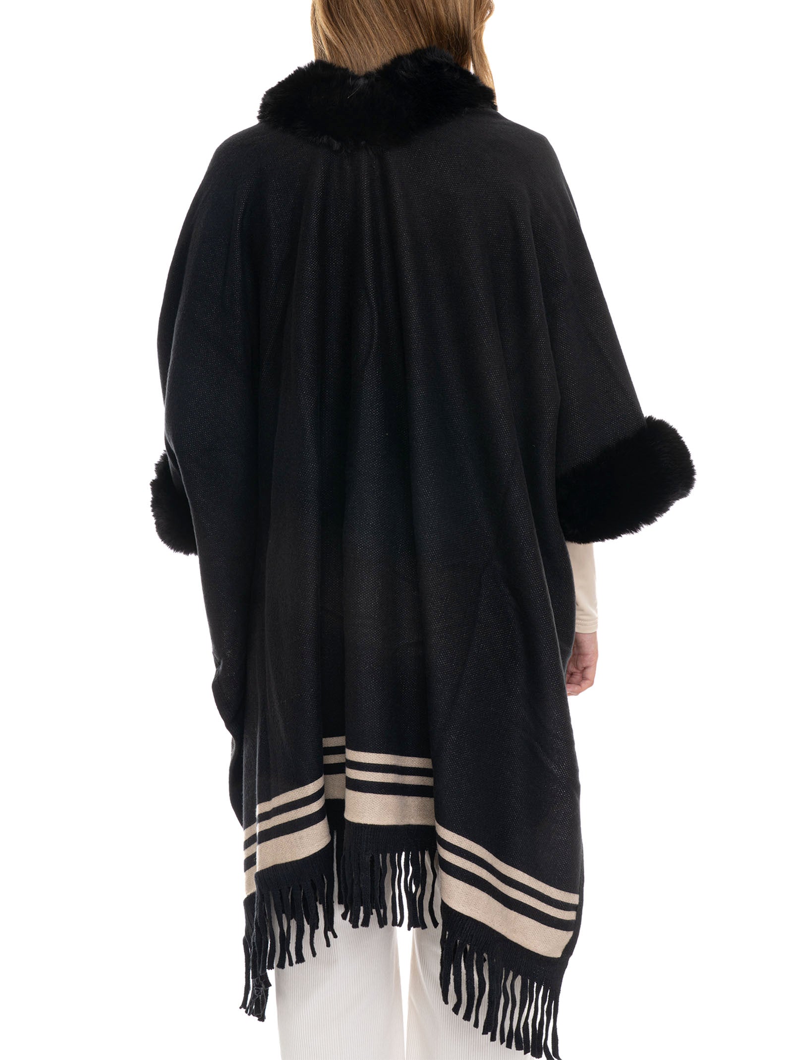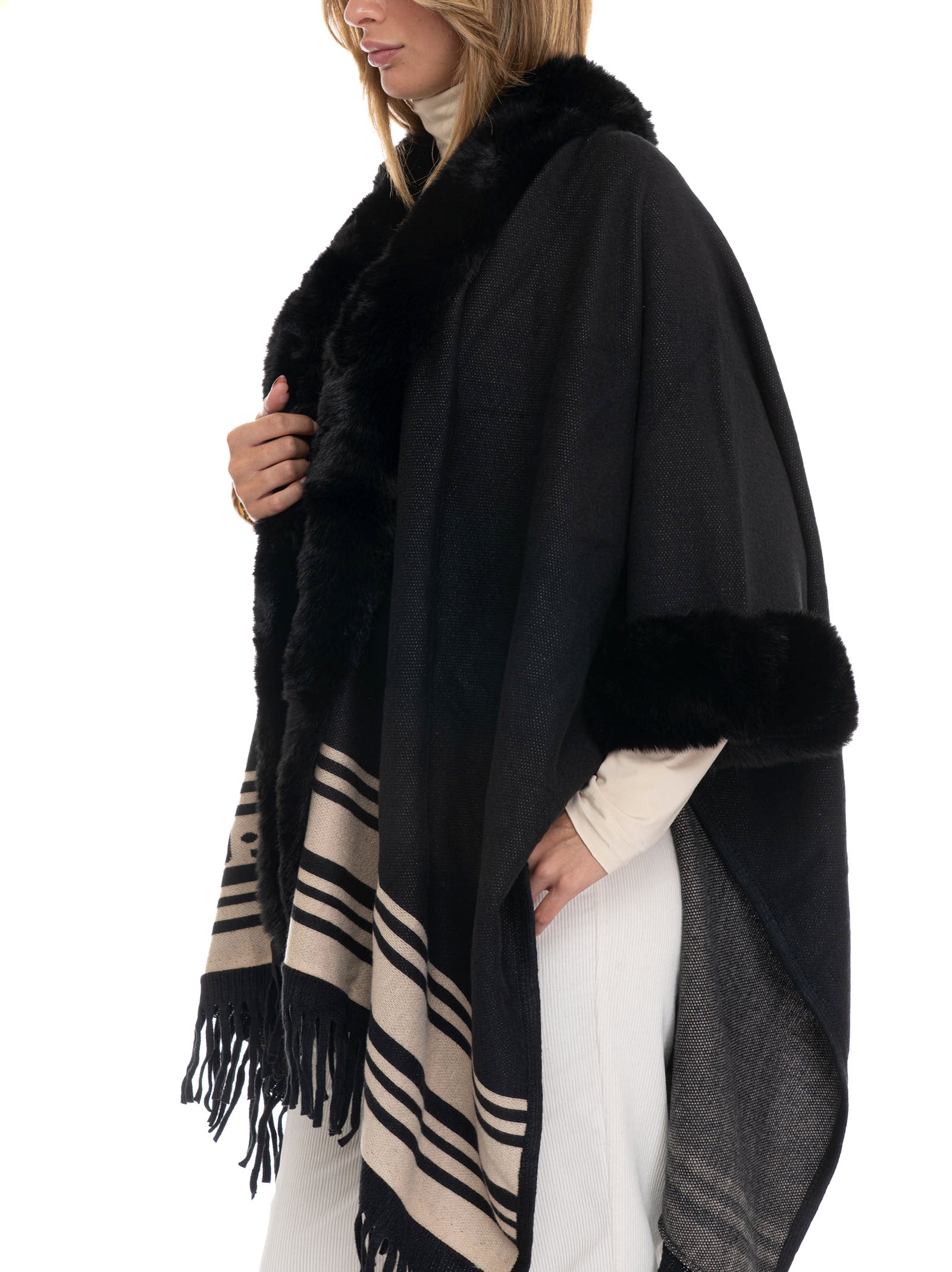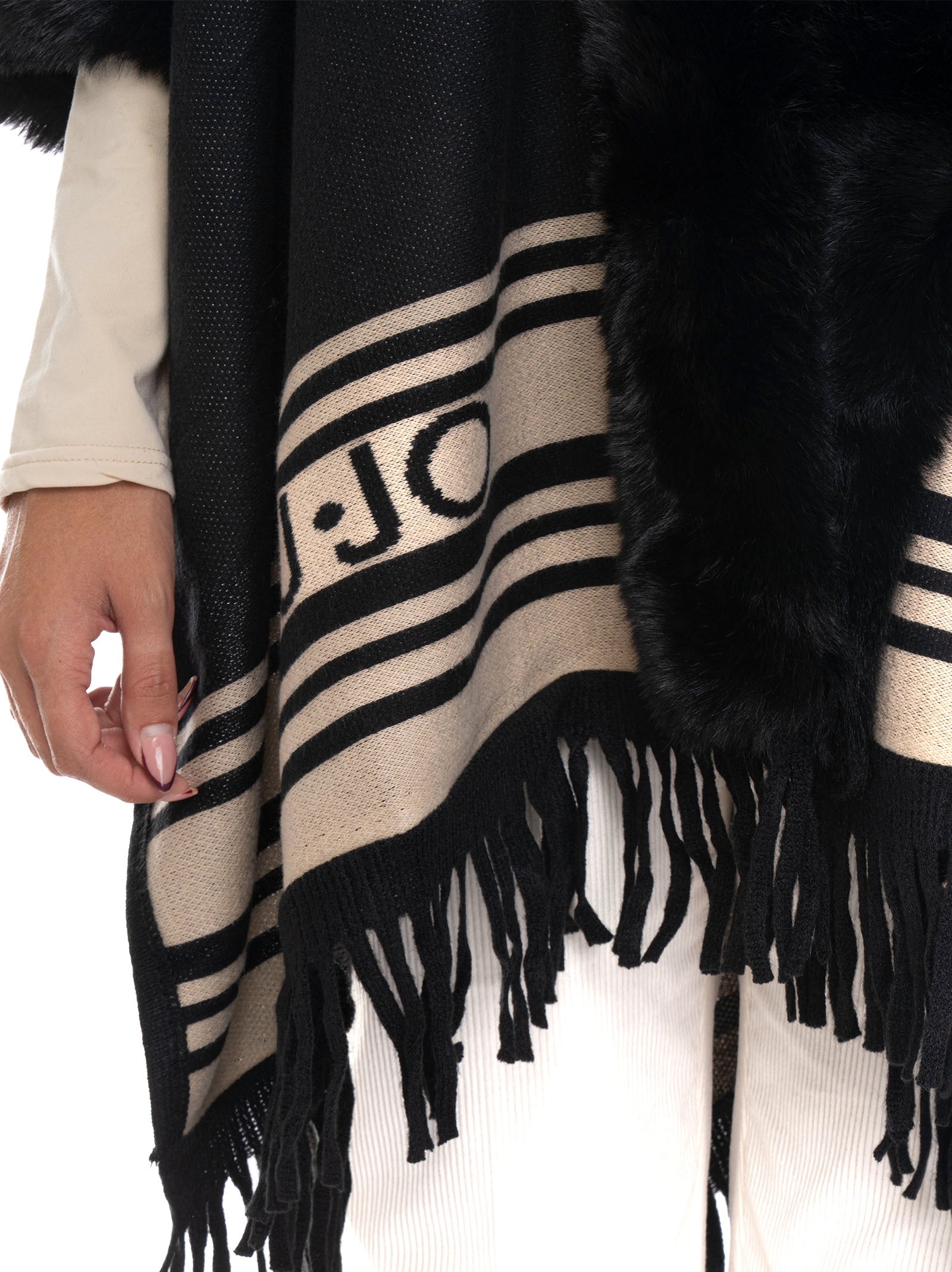 Poncho, fur trim, hook fastening, contrasting colour details, logo on the bottom, fringes on the bottom, composition: 100% polyester, line: LIU JO.