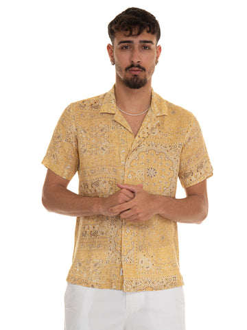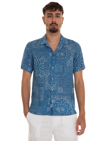 Short-sleeved linen shirt, cashmere pattern, bowling collar, logo sewn on the bottom, composition: 100% linen,...