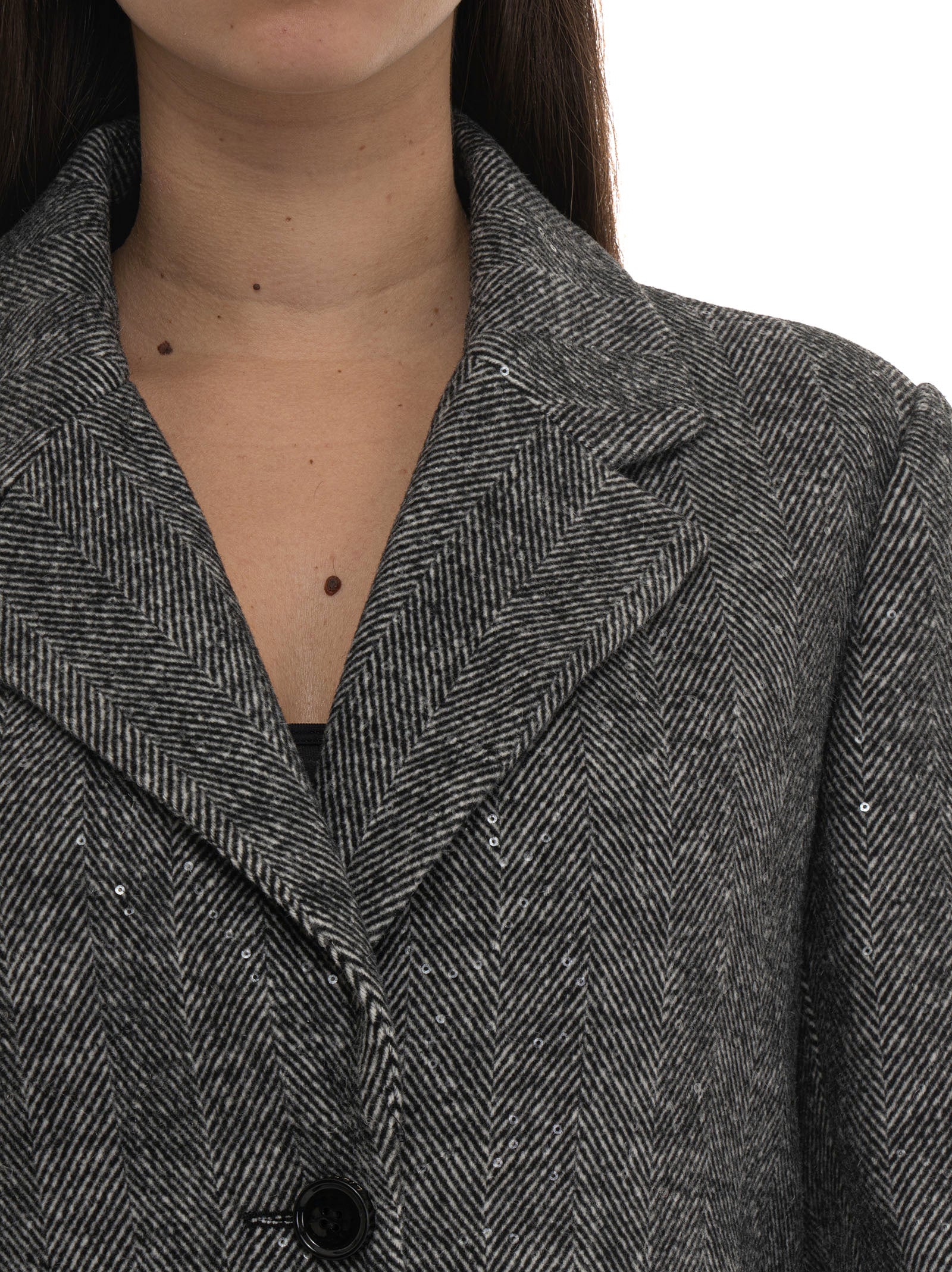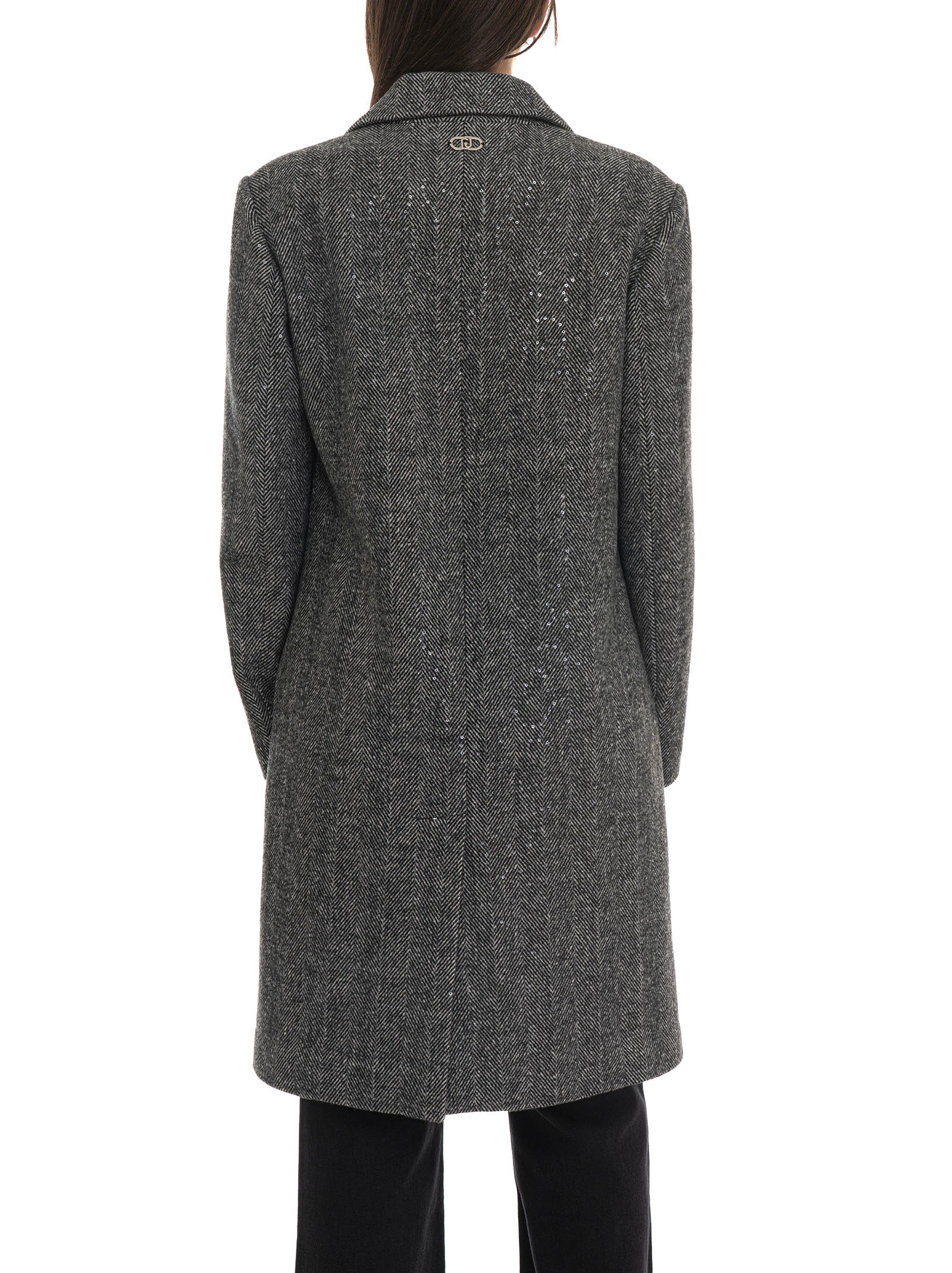Cappotto 3 bottoni, fantasia spigata, collo a revers, tasche sul davanti, spacco posteriore, applicazioni paillettes, composizione: 65% poliestere, 20% acrilico, 10% lana, 5% altre fibre, linea: LIU JO.