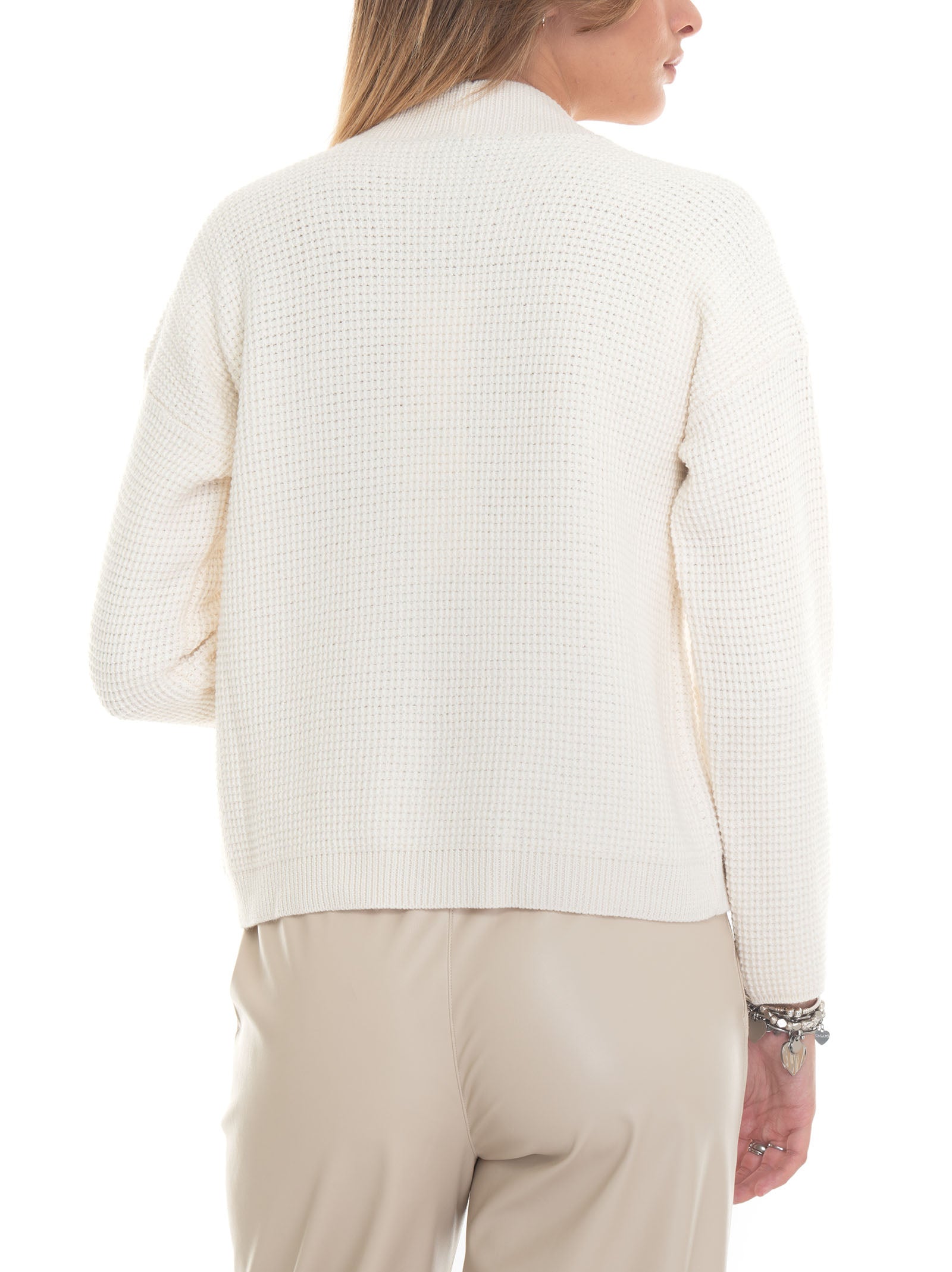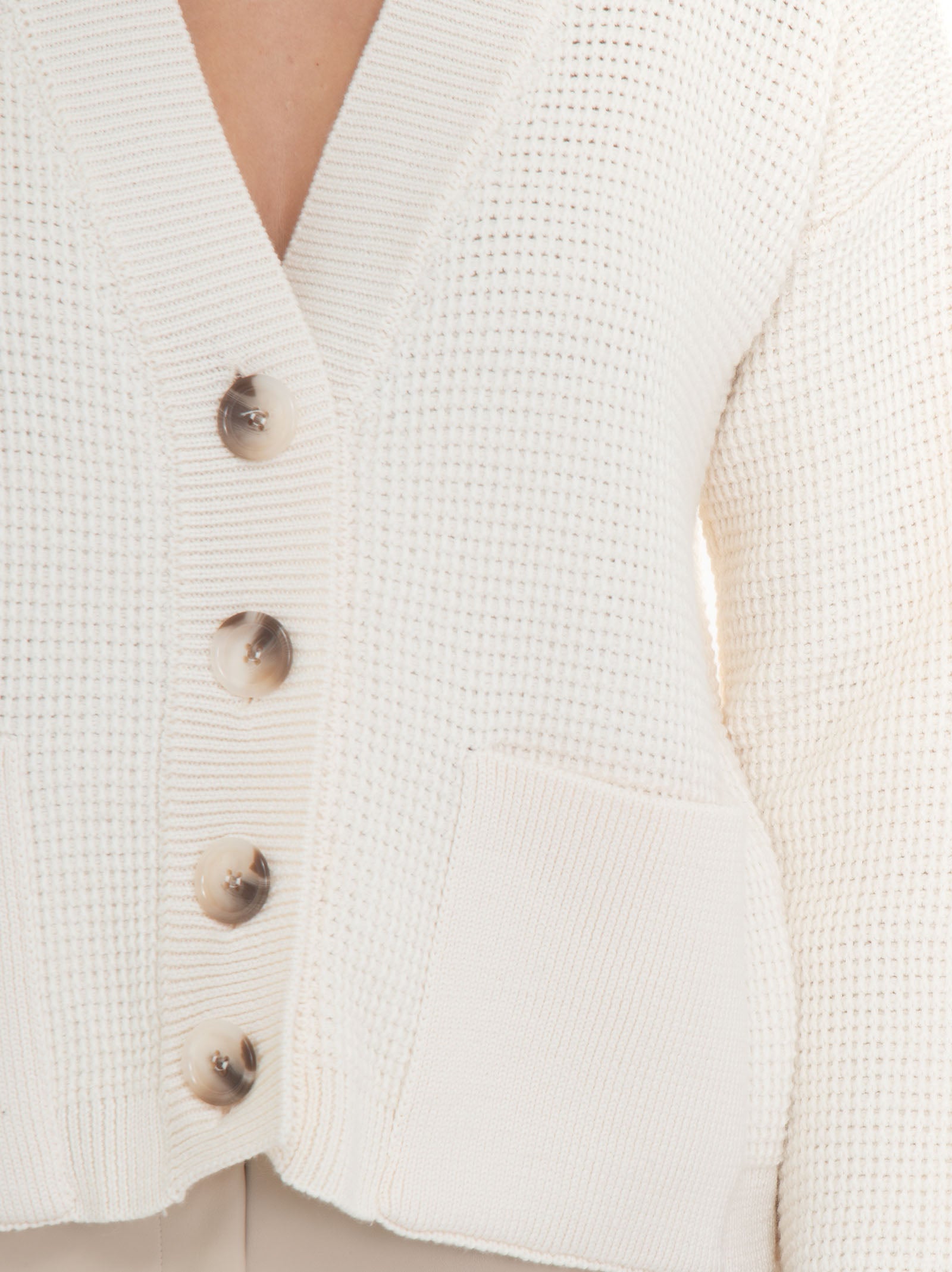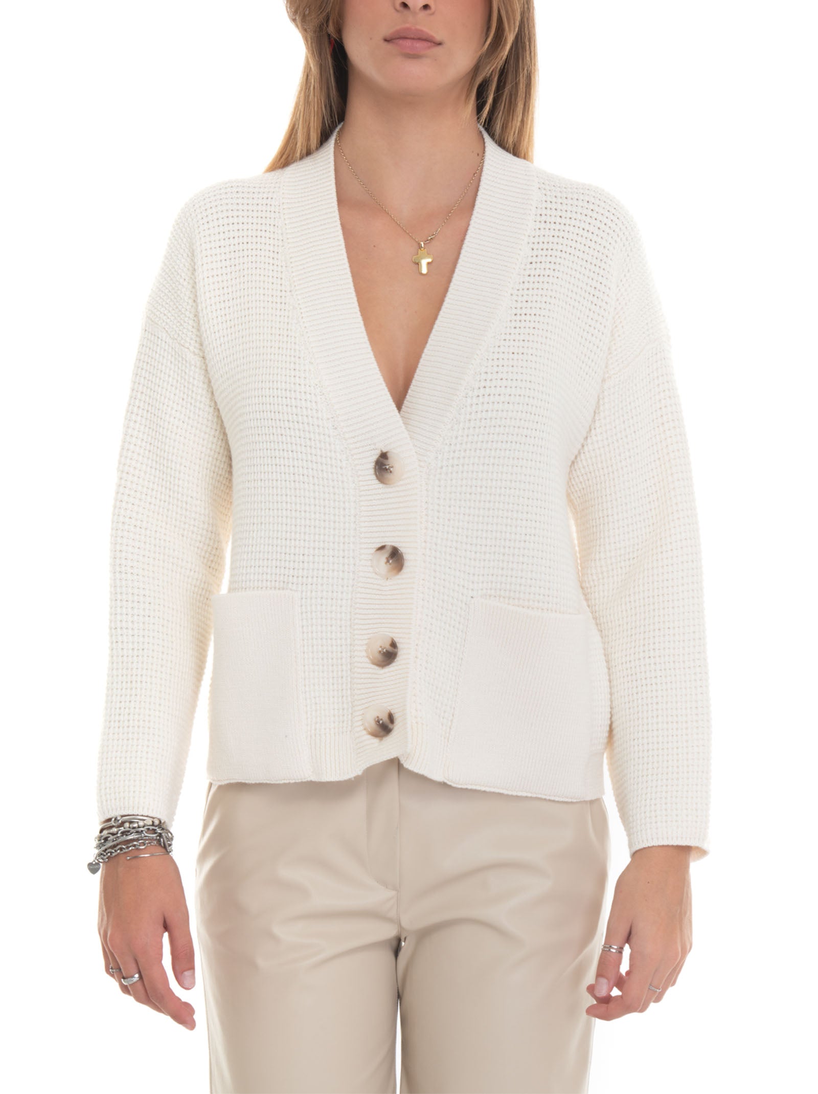 Short cardigan, honeycomb knit, front pockets, bone button, comfort fit, composition: 50% wool, 50% acrylic, line: MARIA BELLENTANI.