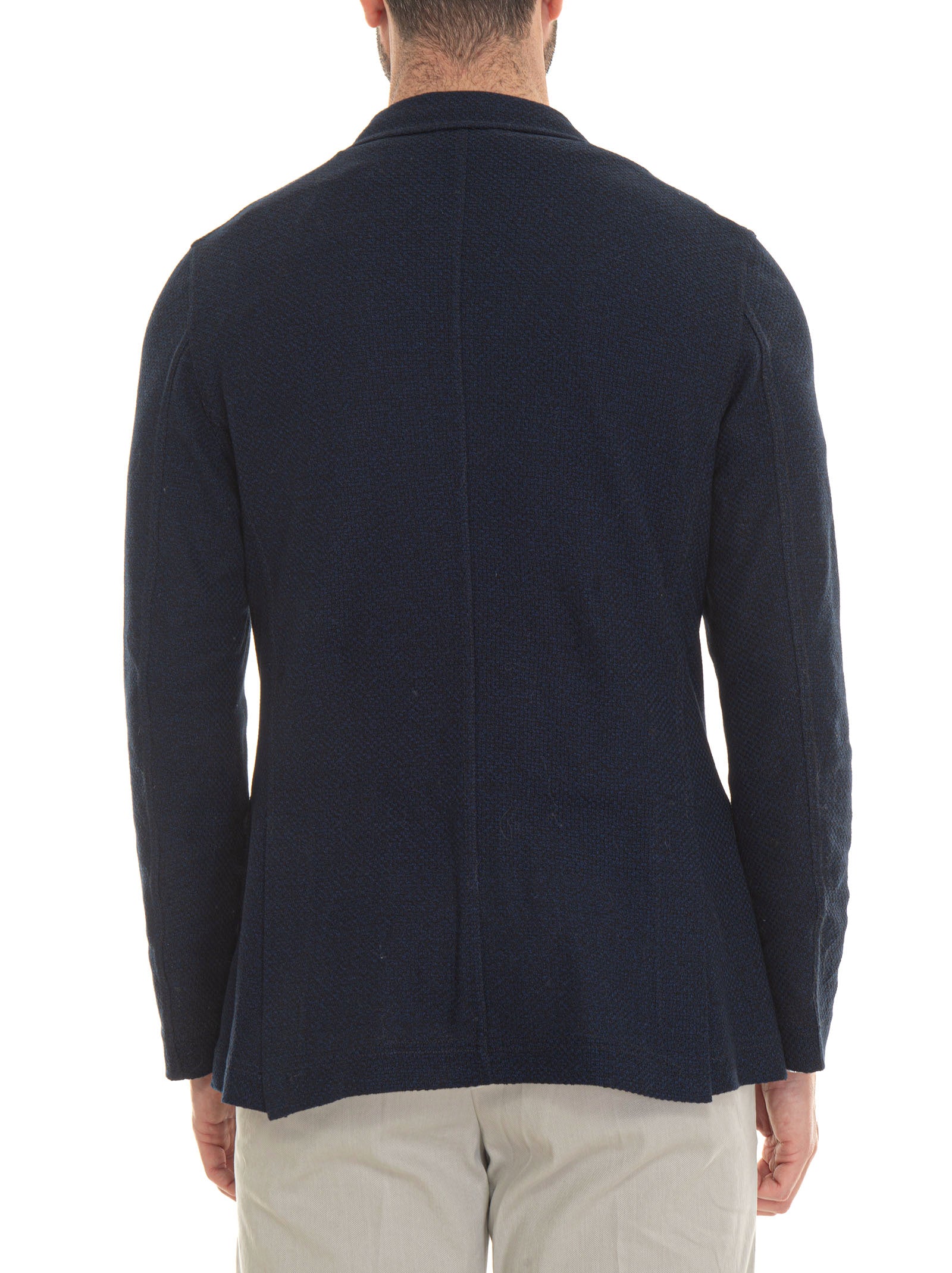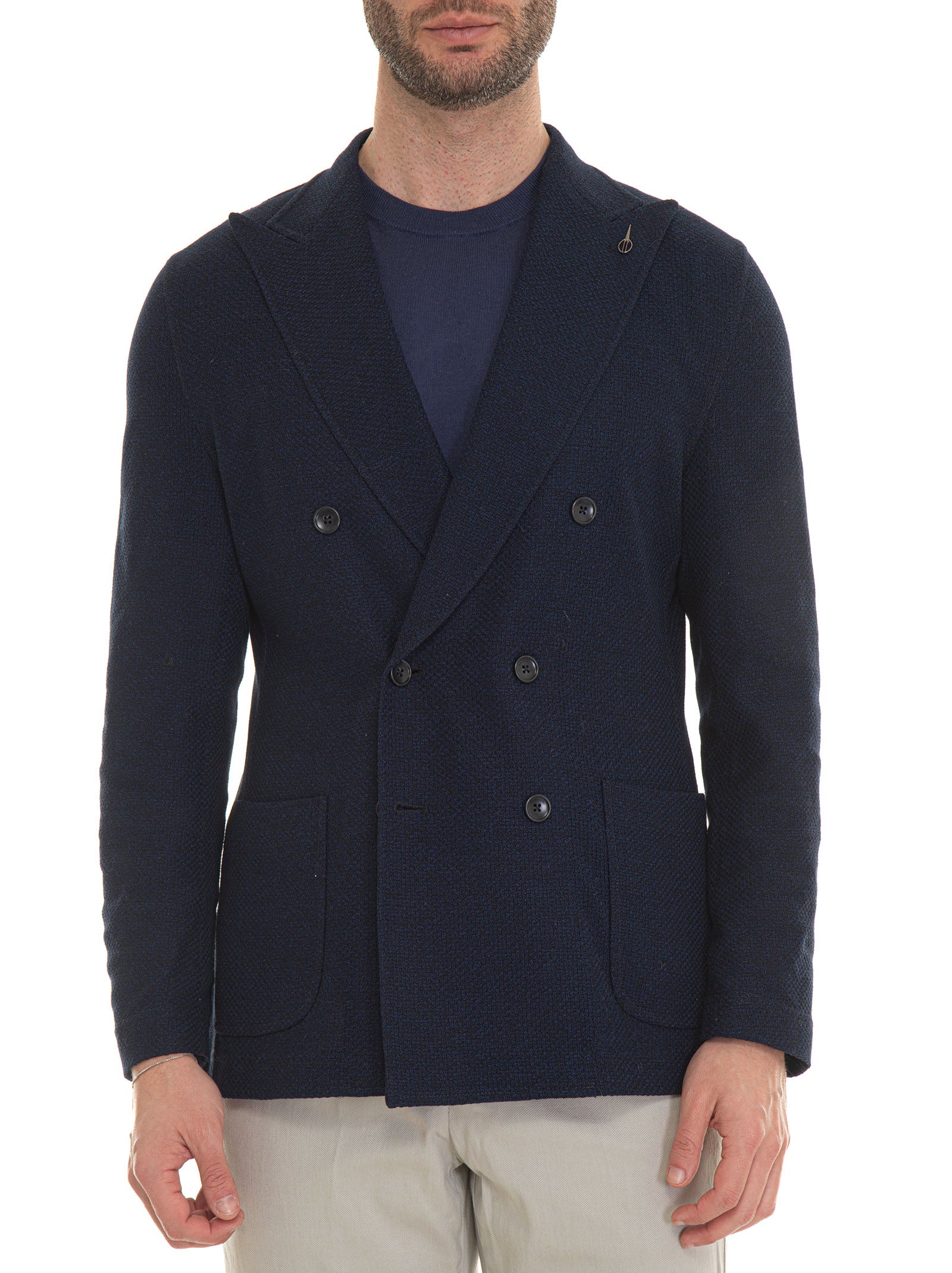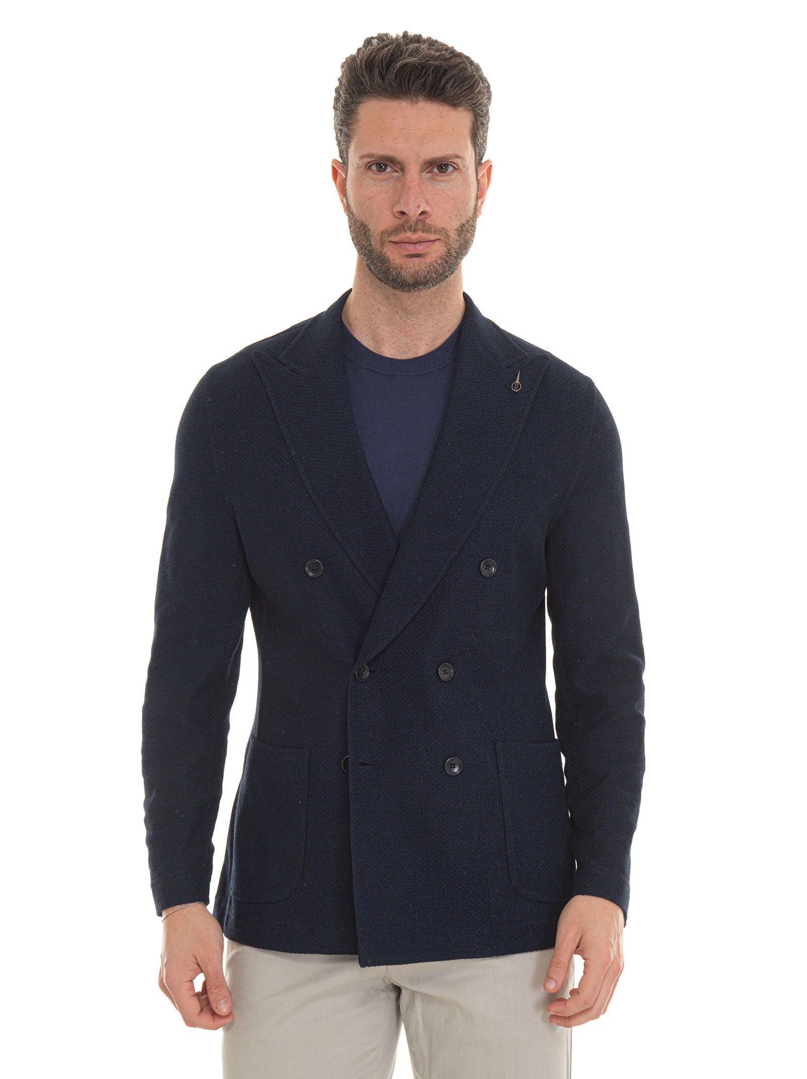 Deconstructed unlined jacket, double breasted, patch pockets, textured fabric, stretch fabric, jacket length 72cm (for size 50), side slits, composition: 100% cotton, line: PAOLONI.