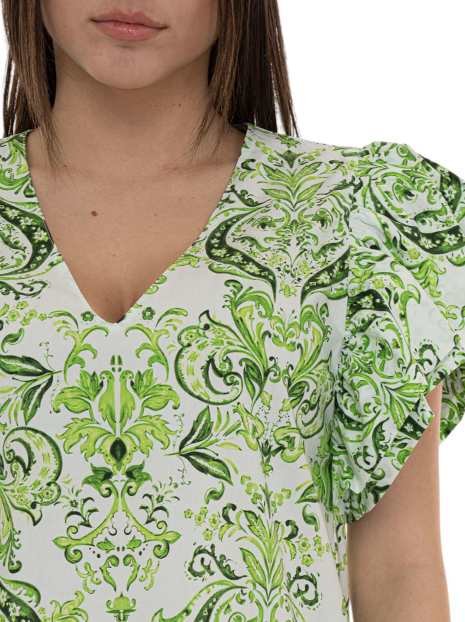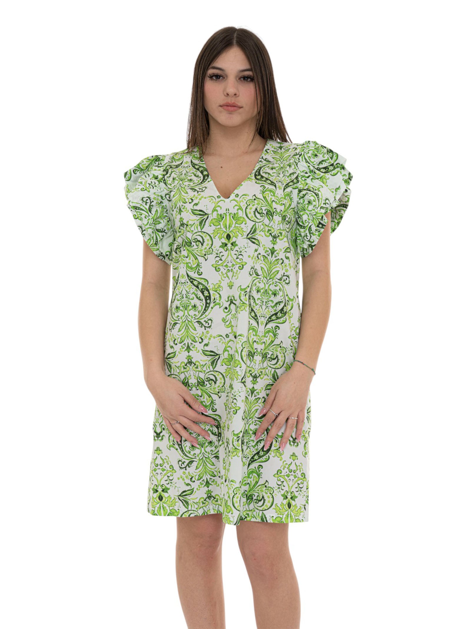 Short dress, V-neck, ruffle sleeves, patterned print, logo tab, composition: 100% cotton, line: LIU JO.