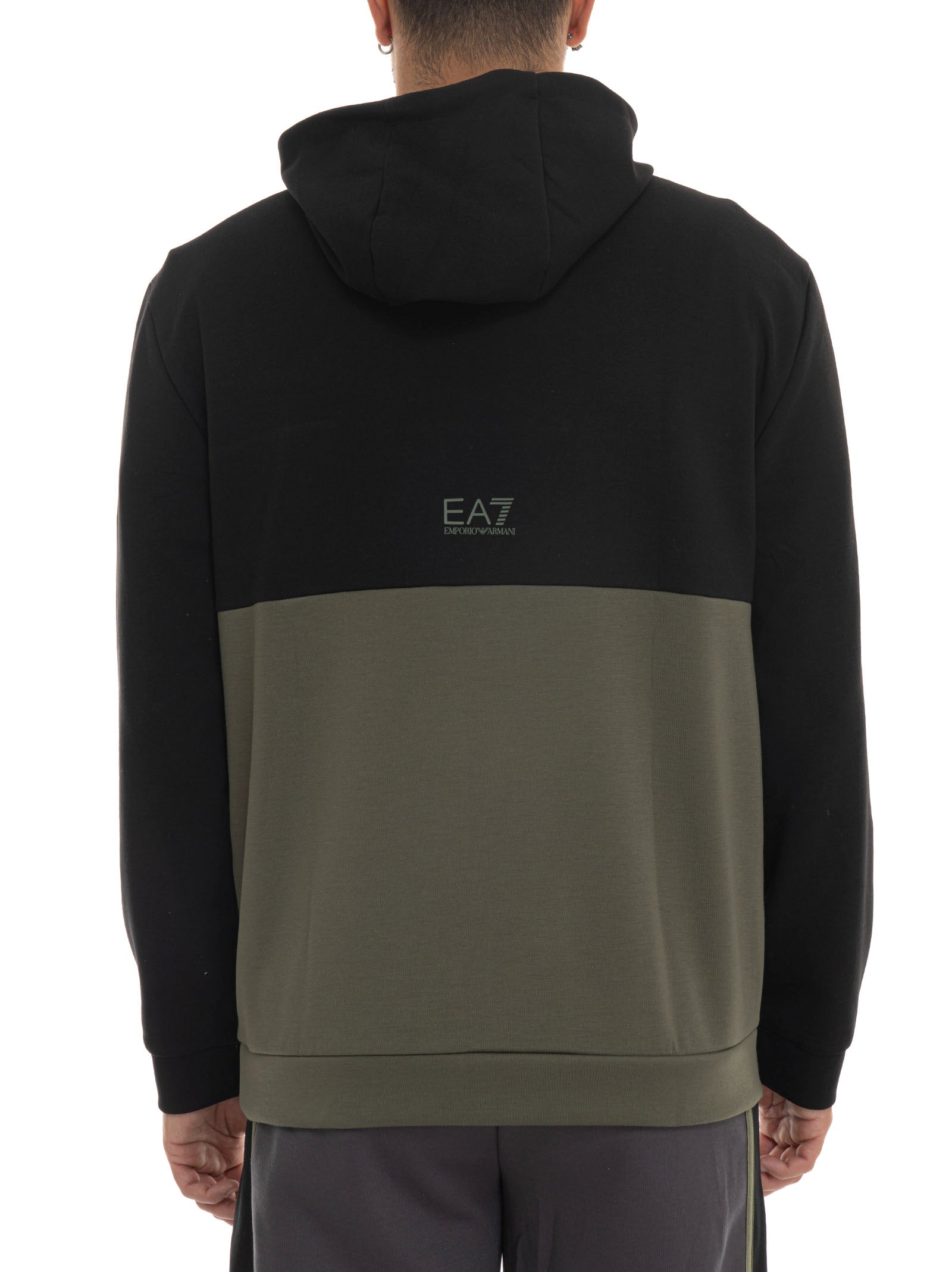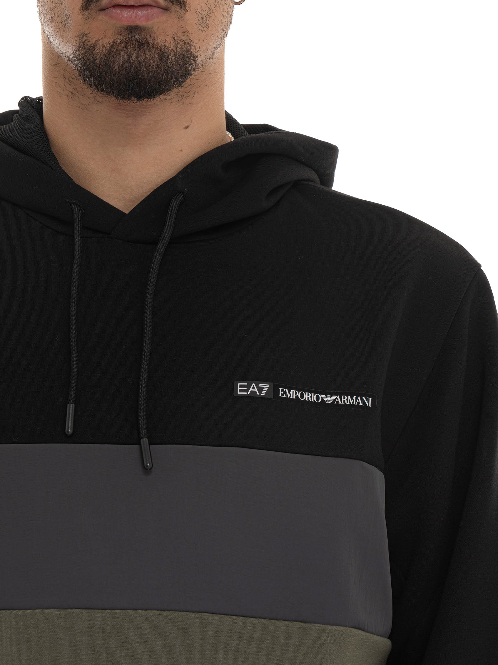 Hooded sweatshirt, two-material, kangaroo pockets, elasticated cuffs and waist, lettering logo applied on the front, composition: 77% polyester, 6% elastane, 17% viscose, line: EA7.