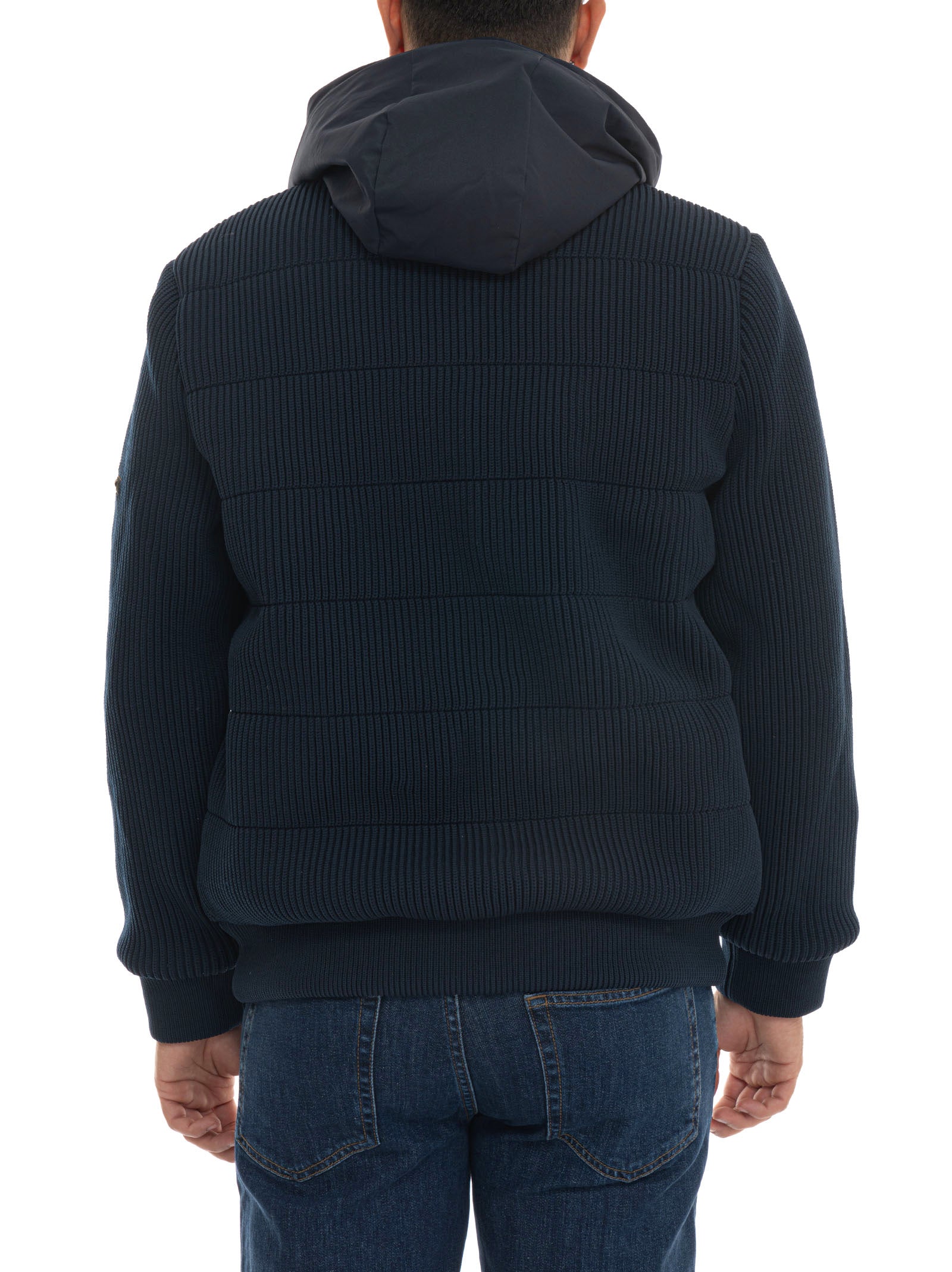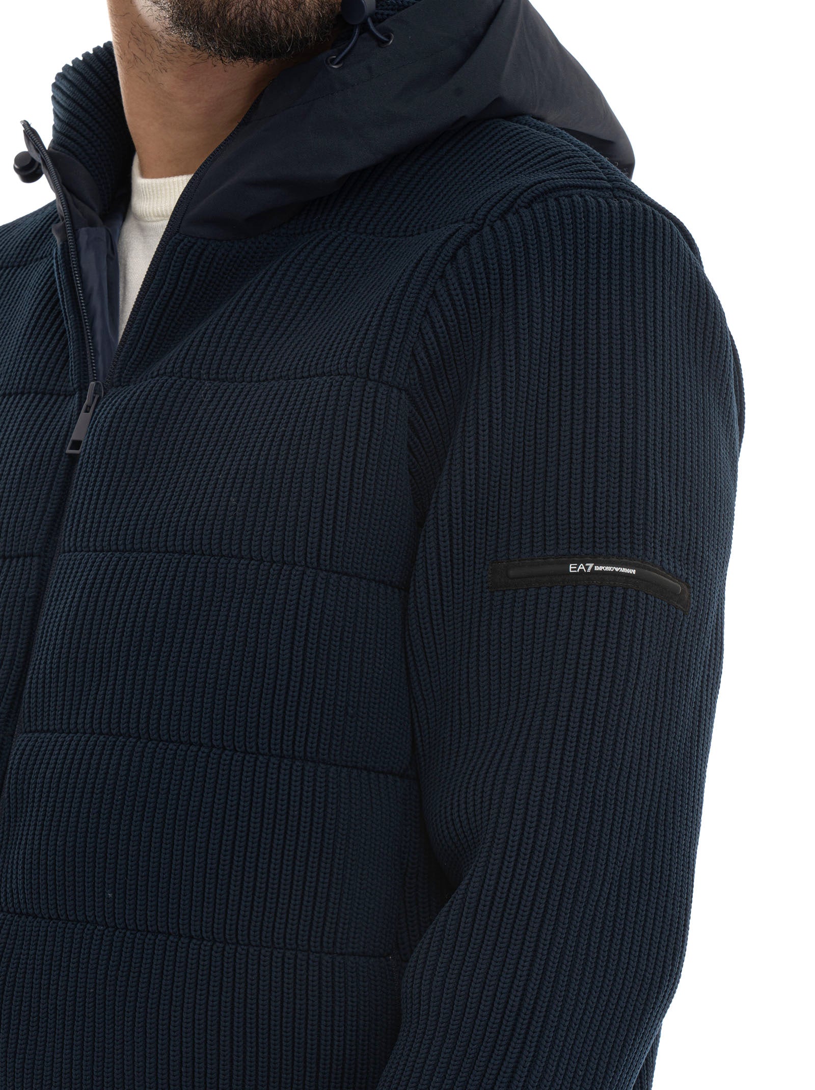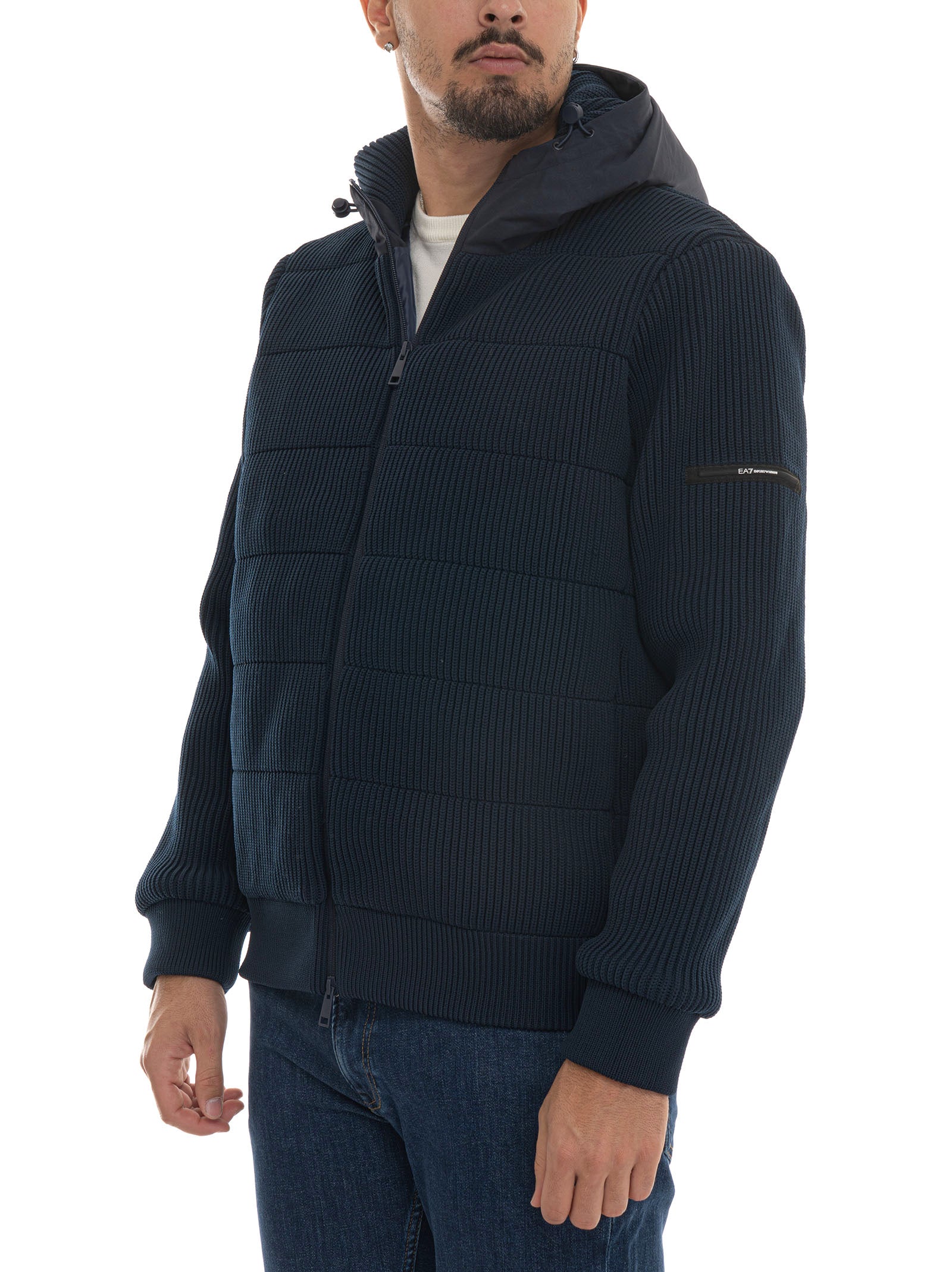 Knitted jacket, short model, fixed hood, elasticated cuffs and waist, zip pockets, logo on the arm, double-slider zip fastening, composition: 100% polyester, line: EA7.
