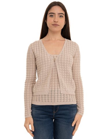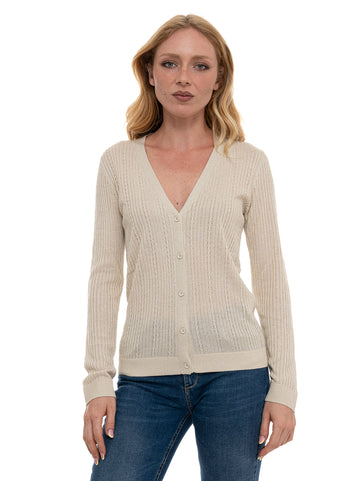 Cardigan corto, chiusura frontale con bottone, lavorazione operata, tessuto lurex, composizione: 86% viscosa, 10% poliestere,...