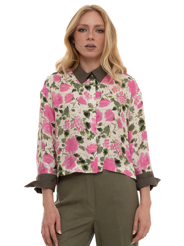 Camicia morbida da donna, collo e polsini a contrasto di colore, chiusura bottoni, piega sul...