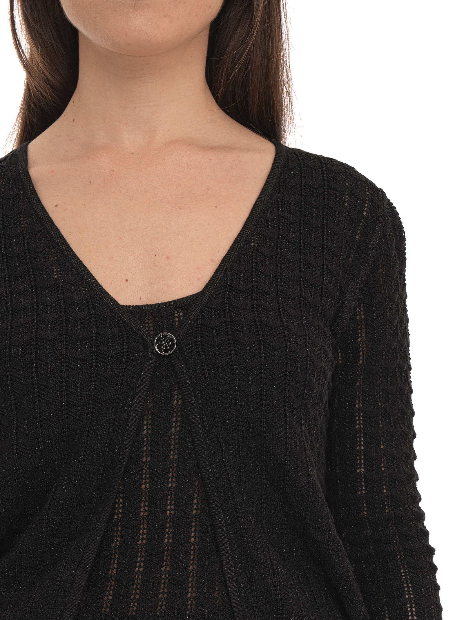 Cardigan corto, chiusura frontale con bottone, lavorazione operata, tessuto lurex, composizione: 86% viscosa, 10% poliestere, 4% metallizzato, linea: GUESS.