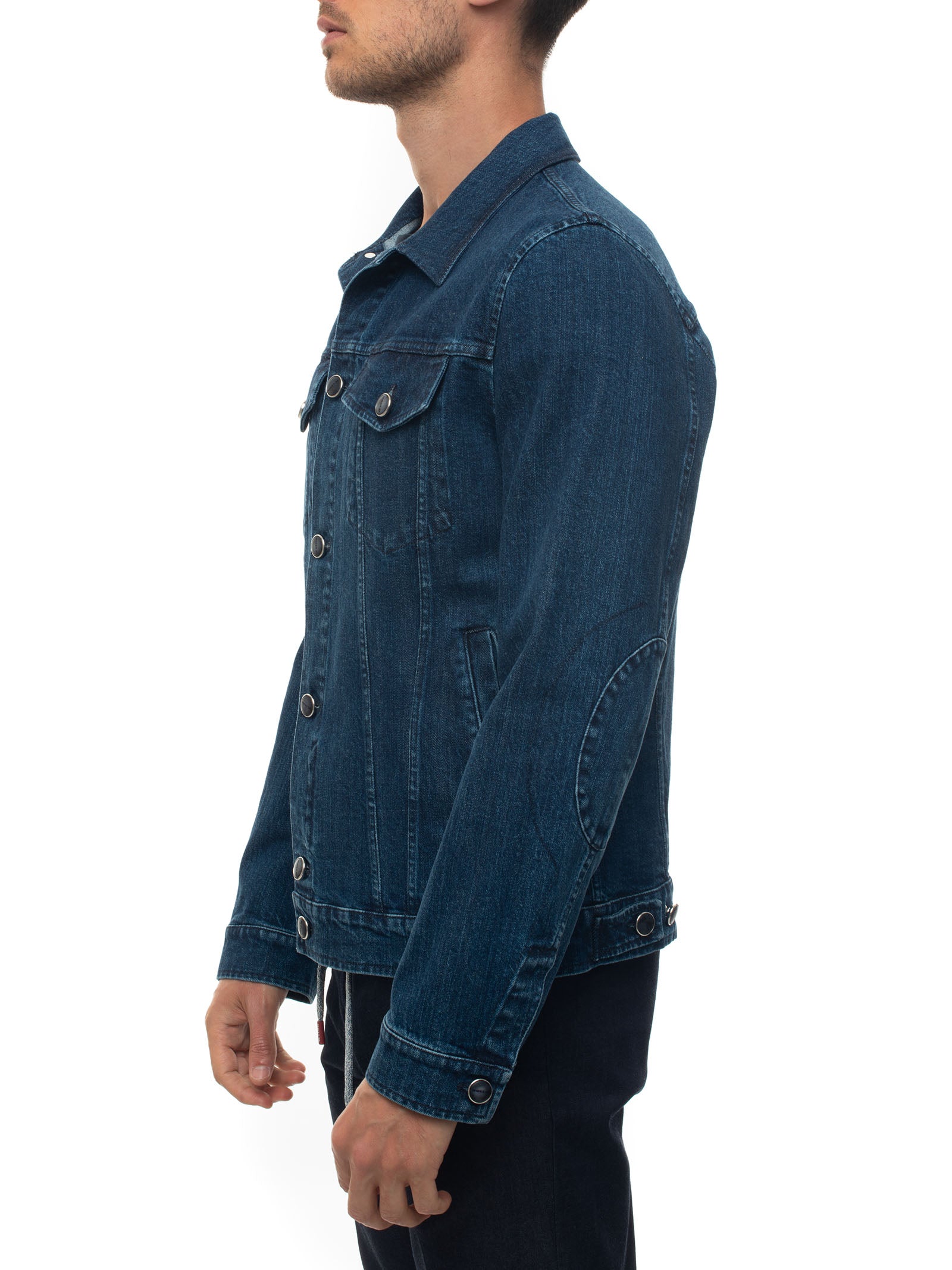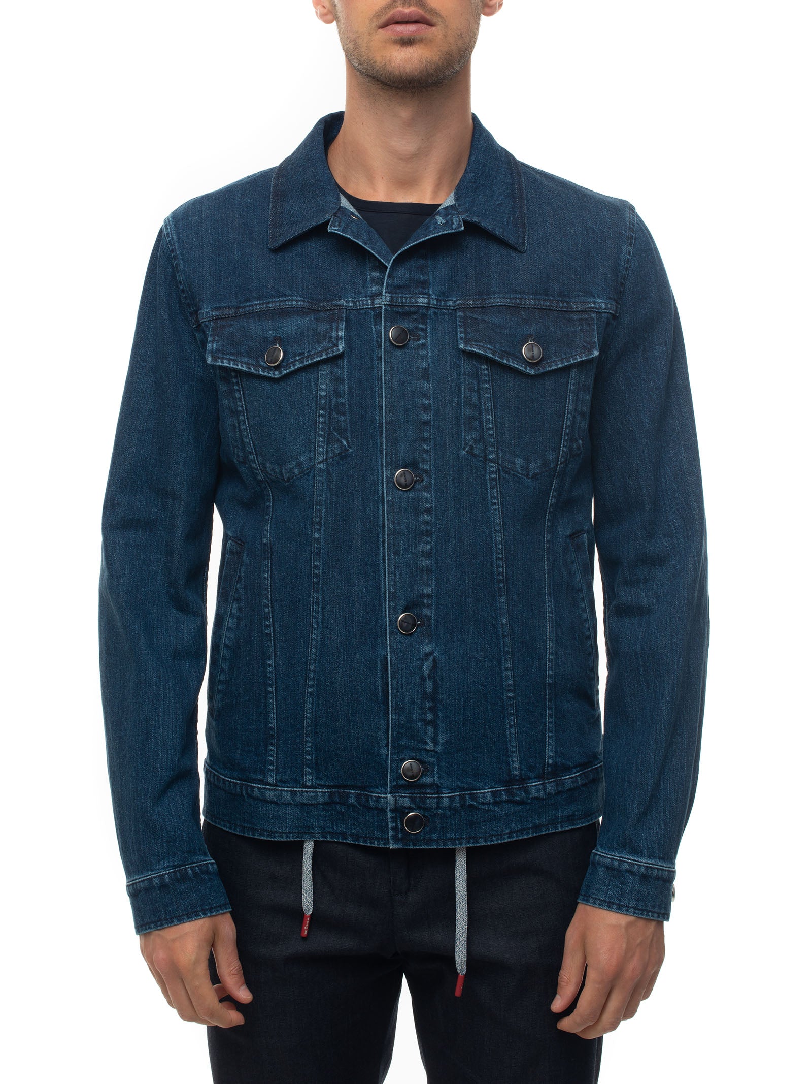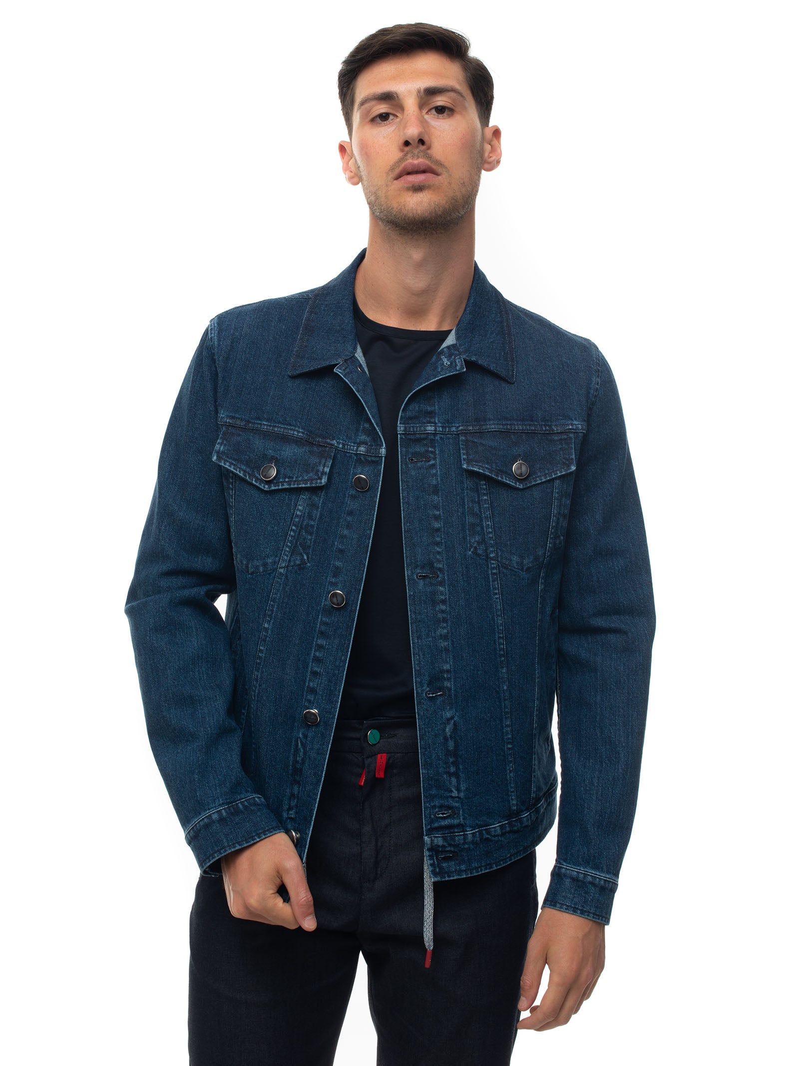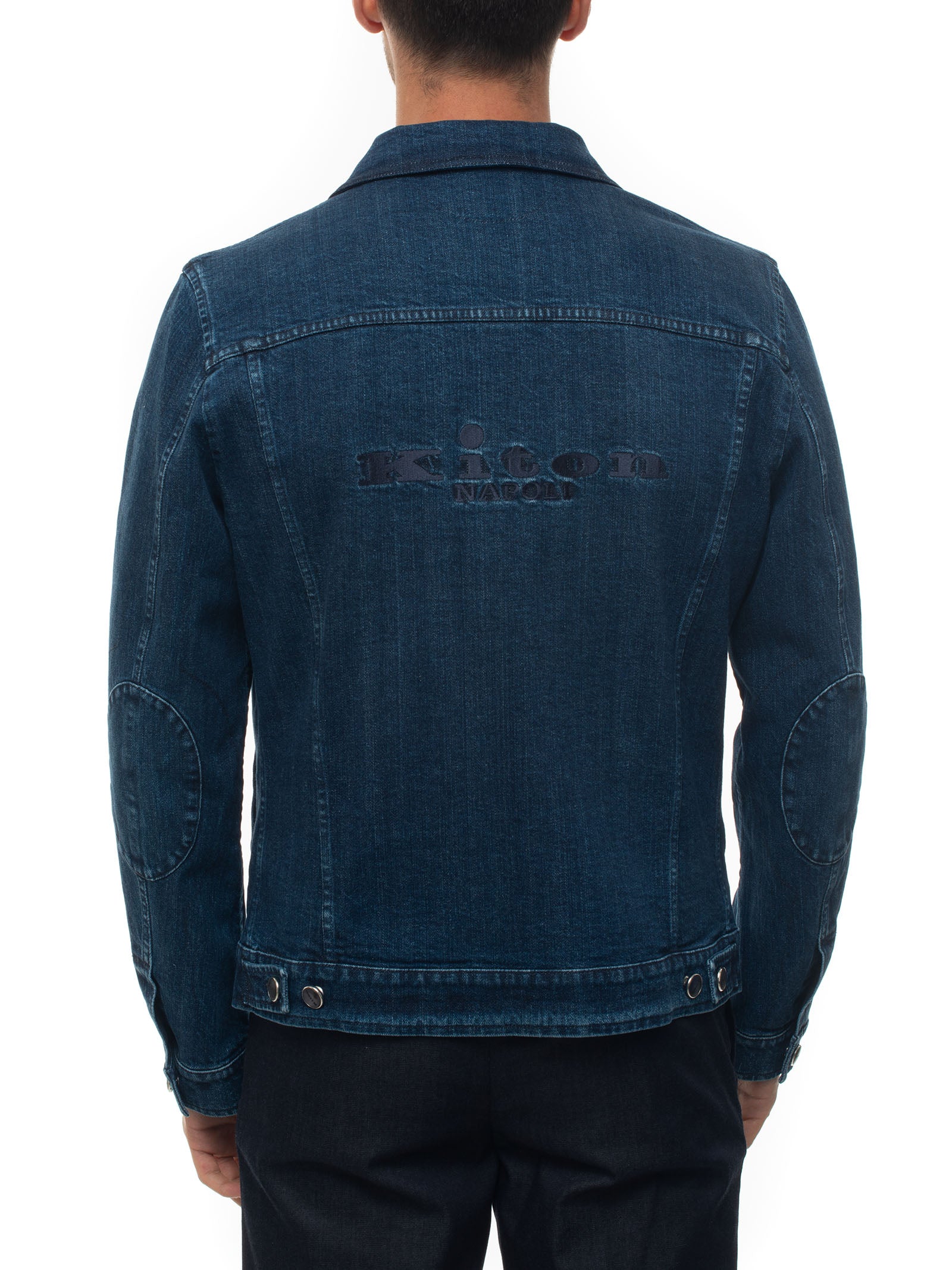 Giubbino in jeans, chiusura a vista con bottoni, bottoni logati, logo posteriore, sottocollo in agnello, made in italy, vestibilità comfort, composizione: 98% elastan, 2% elastan, linea: KITON.