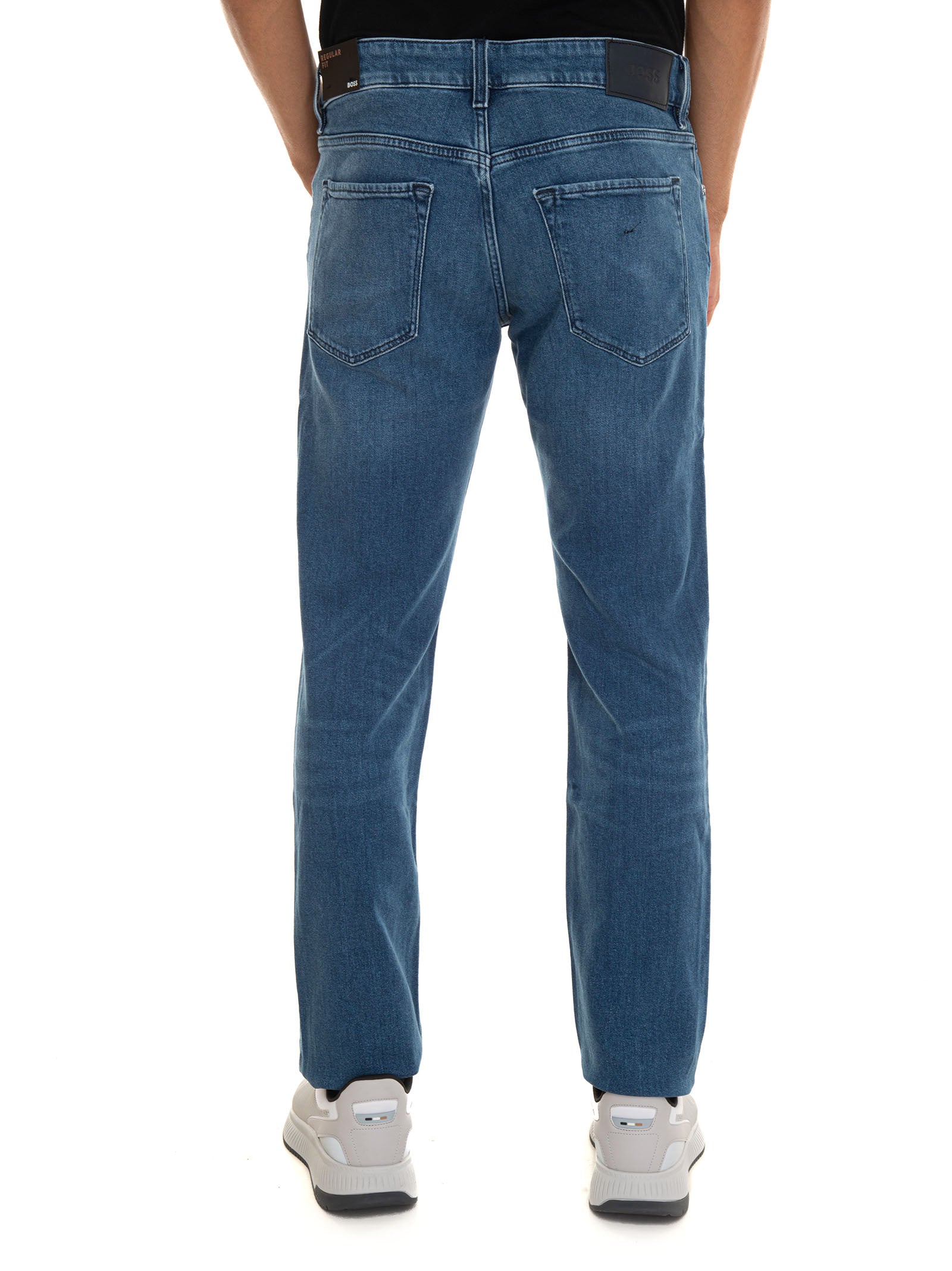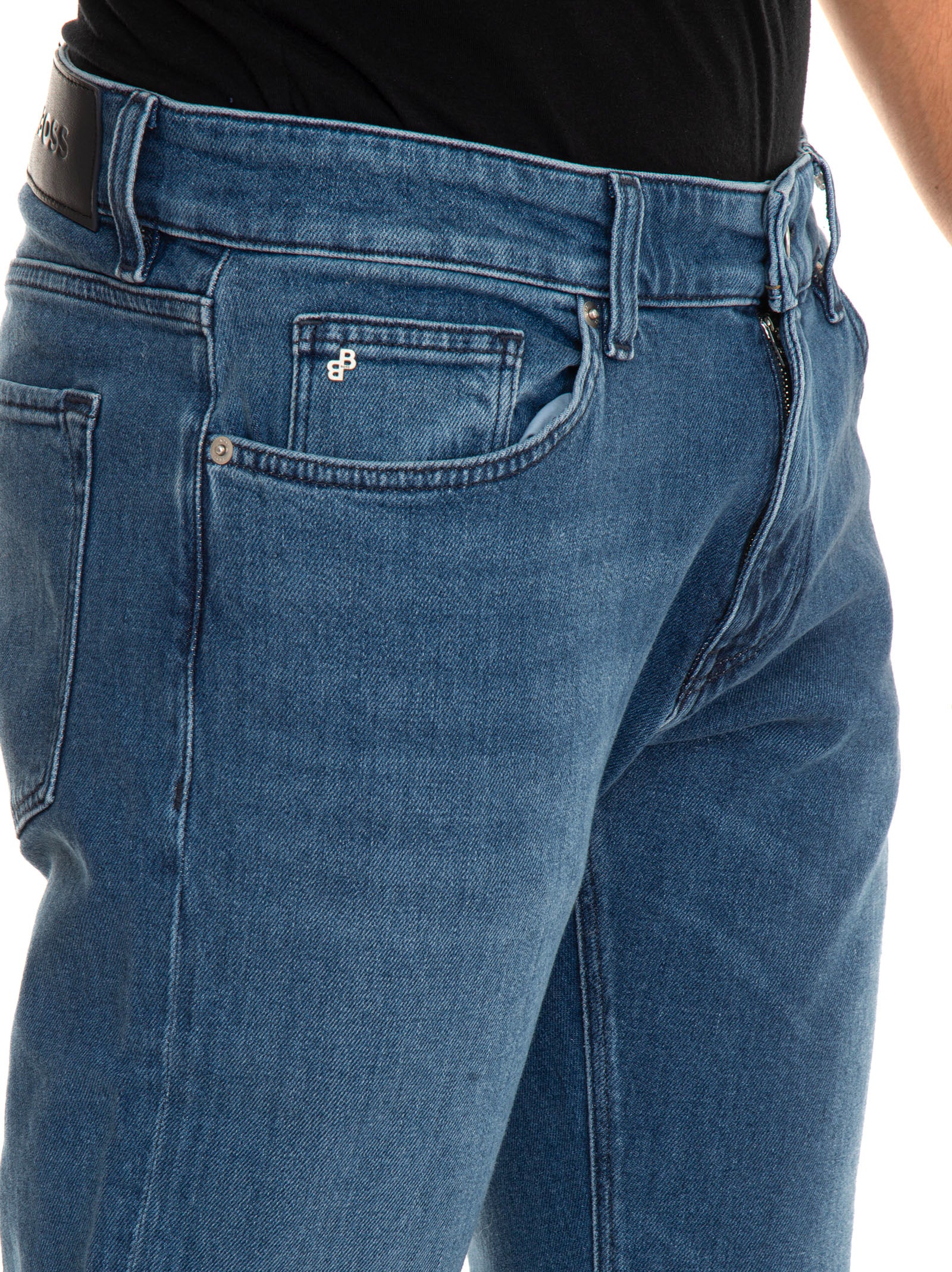 Jeans 5 tasche BOSS MAINE3, salpa in pelle con logo, stone washed, chiusura con bottone e zip a scomparsa, fondo 20 cm, vestibilità regular, composizione: 60% cotone, 39% lyocell, 1% elastan, elastanlinea: BOSS.
