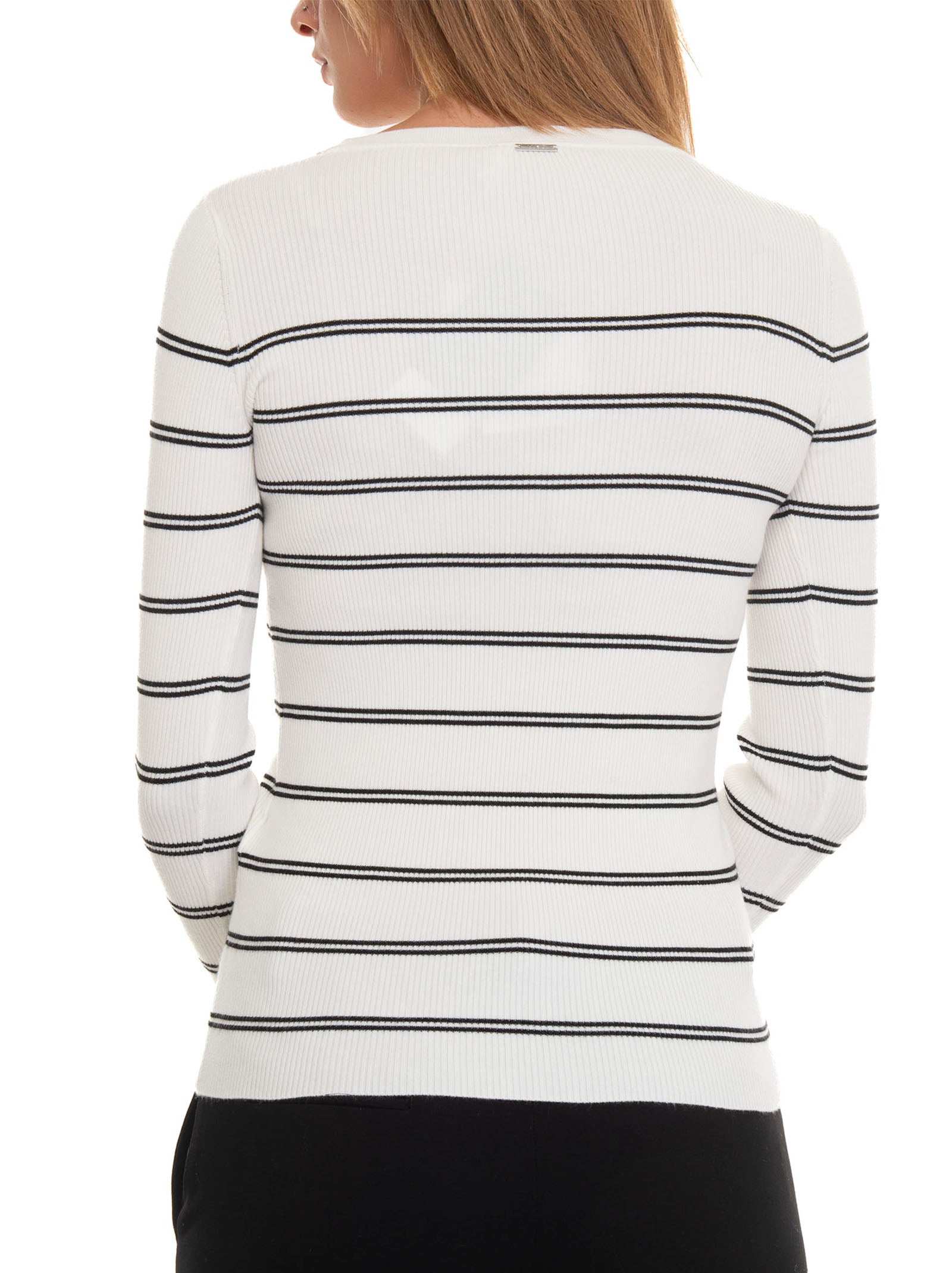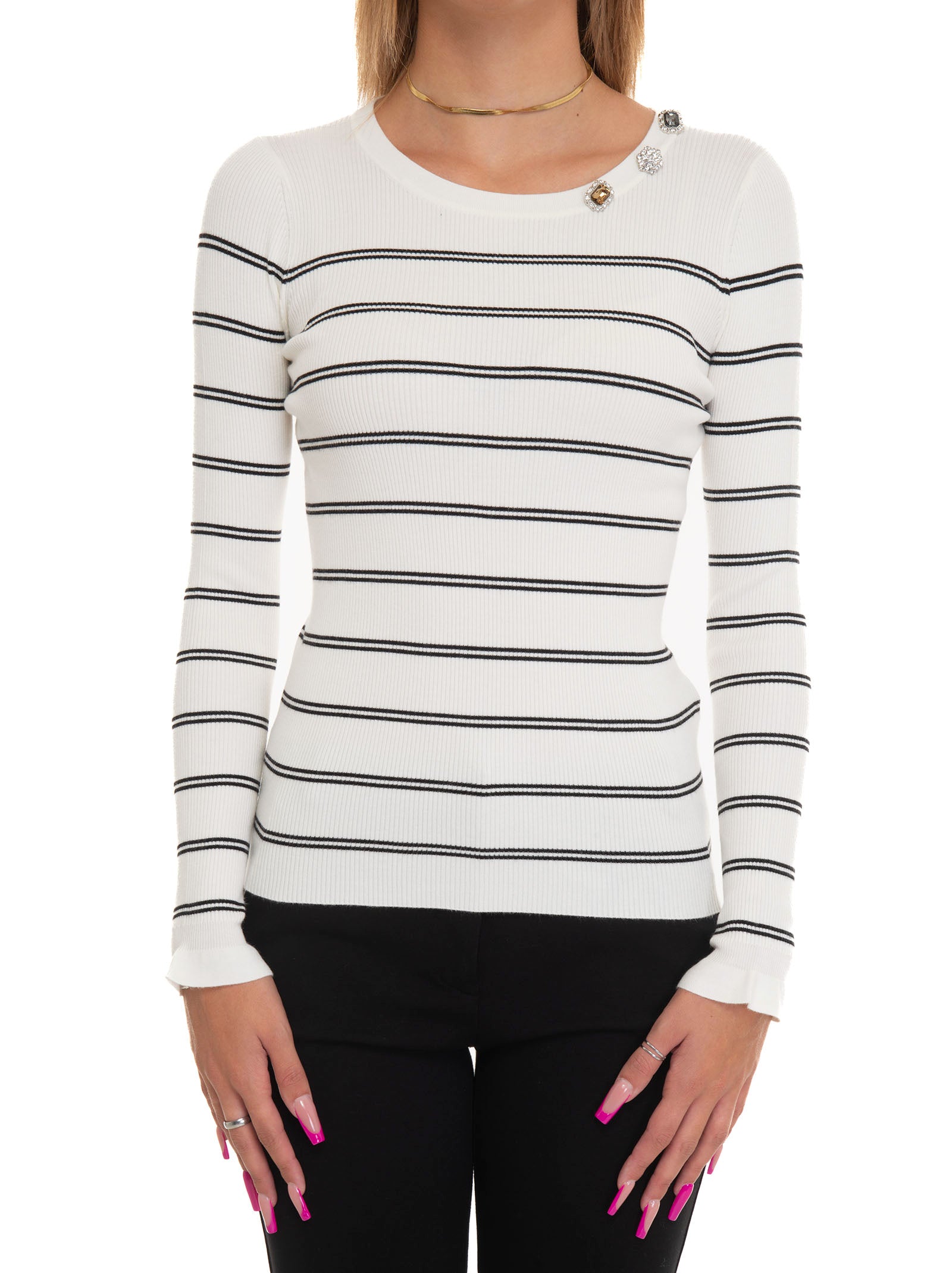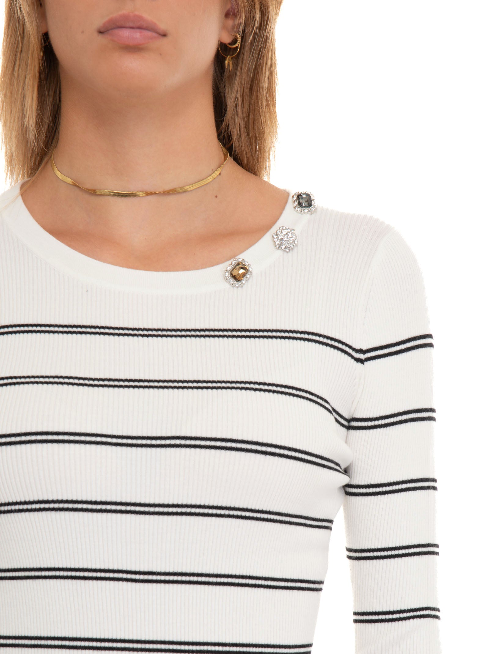 Maglia, girocollo, fantasia rigata, applicazioni gioiello, linguetta con logo, vestibilità regular, composizione: 62% viscosa, 38% poliestere, linea: LIU JO.
