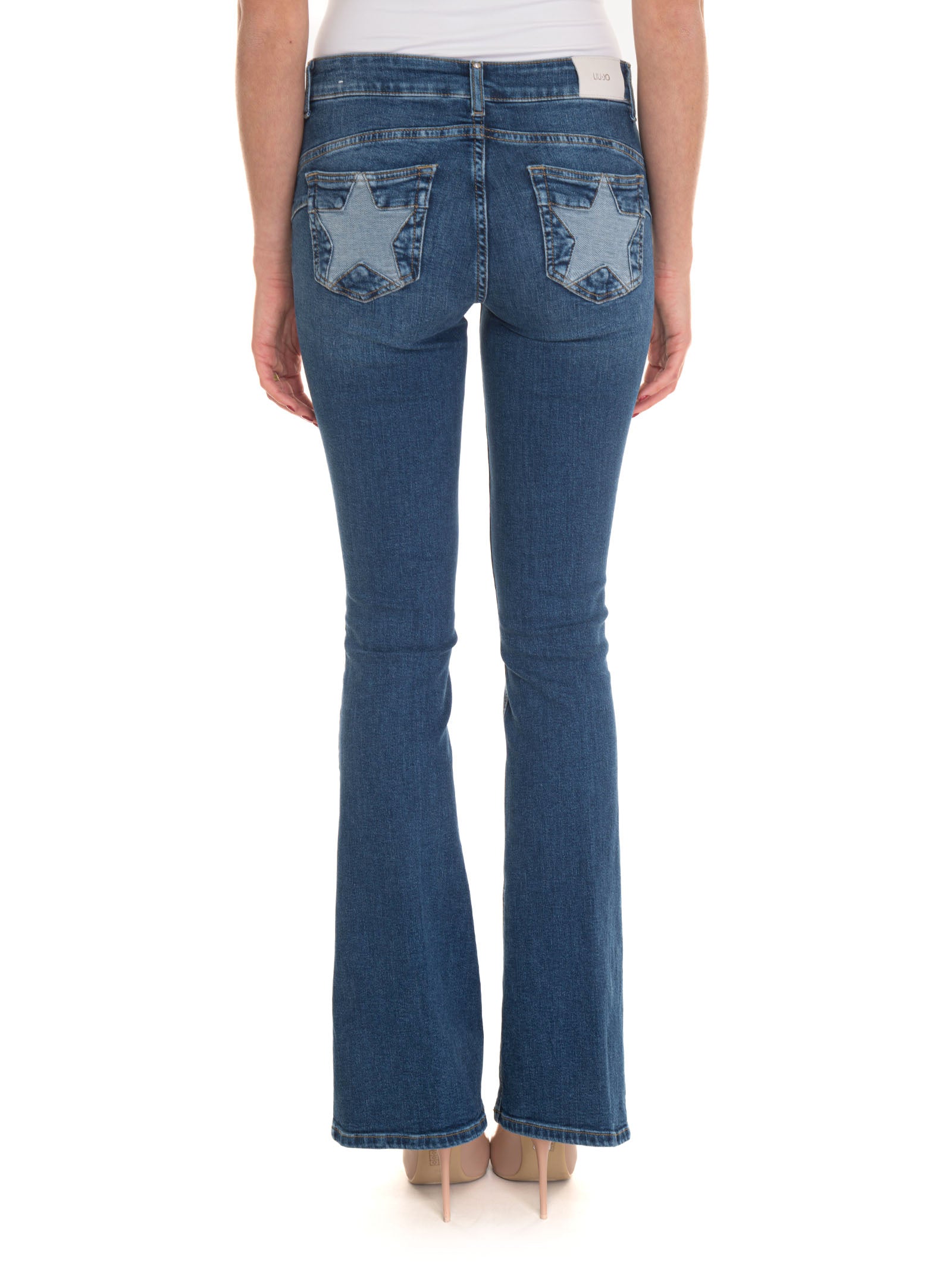 Jeans 5 tasche Liu Jo BEAT, vita media, zampa, chiusura con bottone e zip a scomparsa, stampa posteriore, composizione: 98% cotone, 2% elastan, linea: LIU JO.