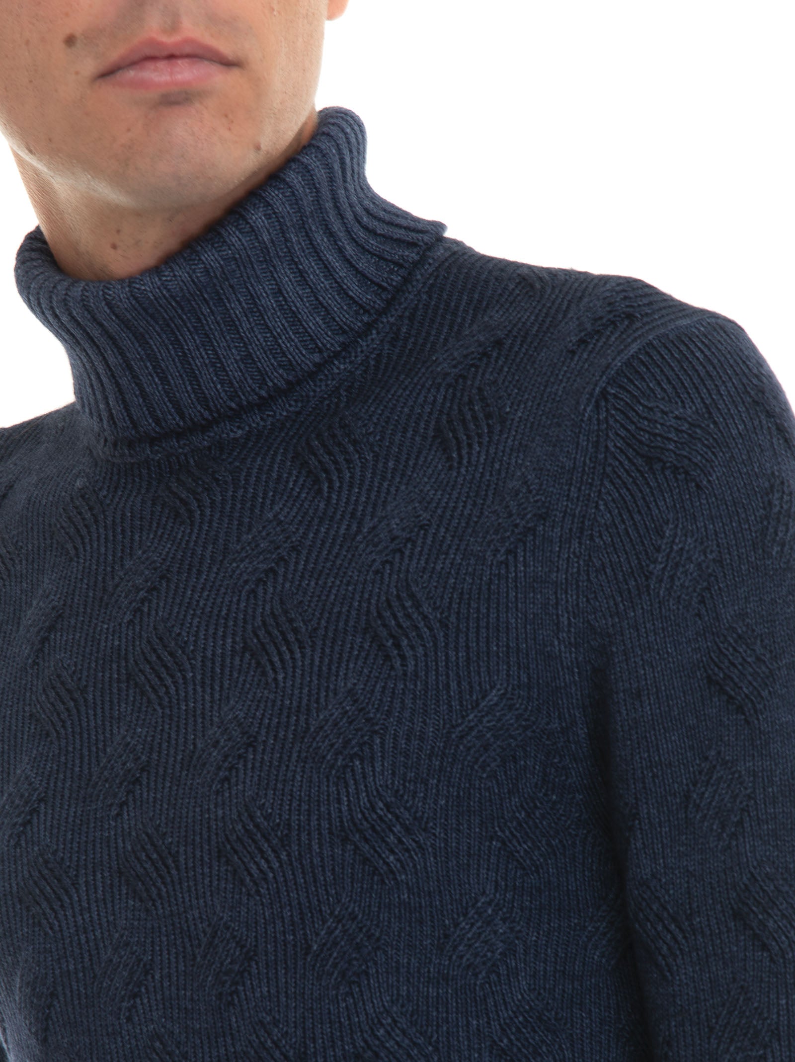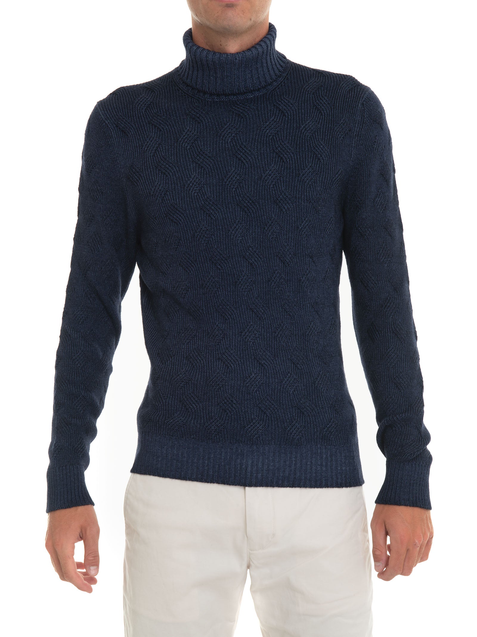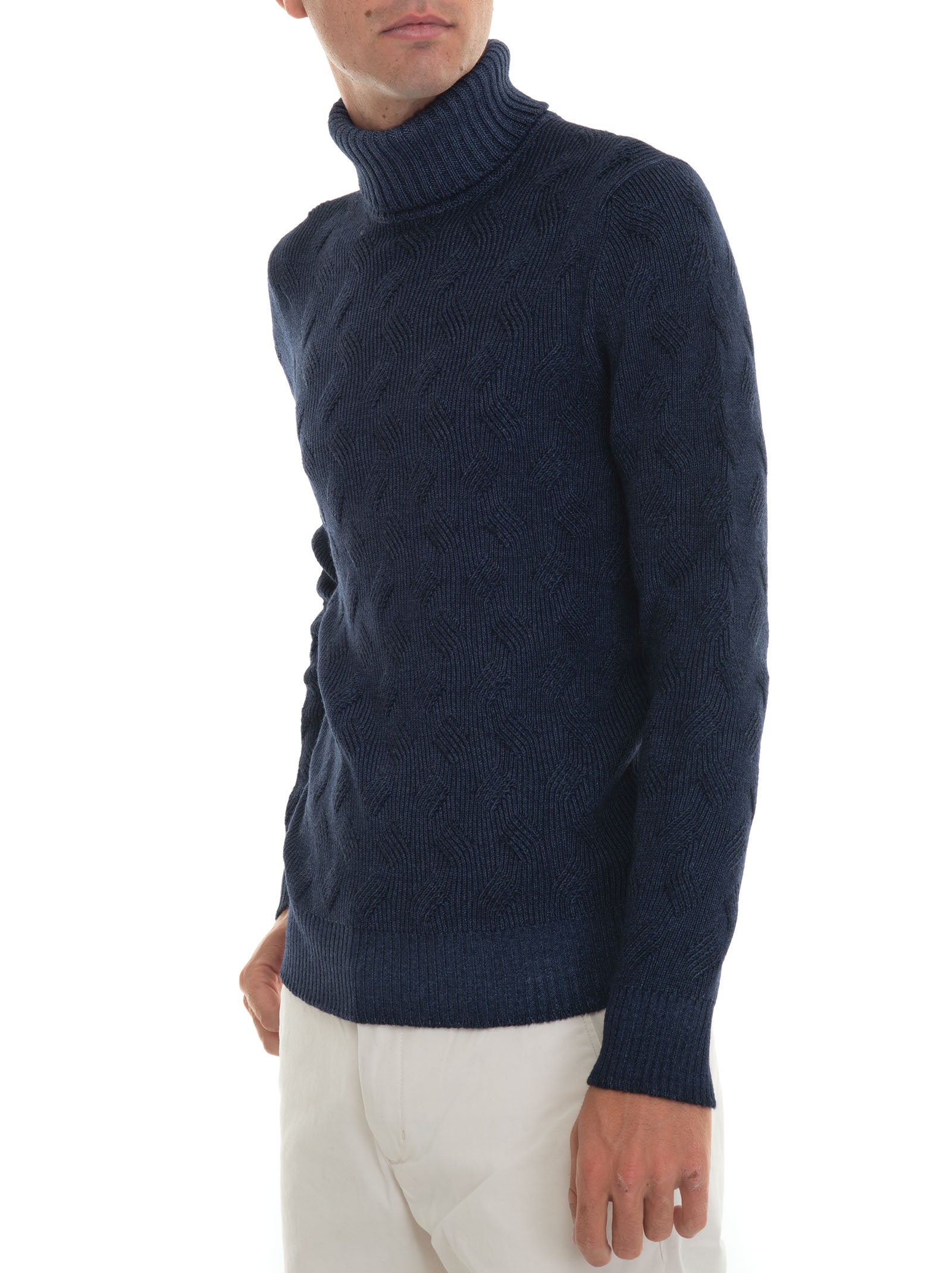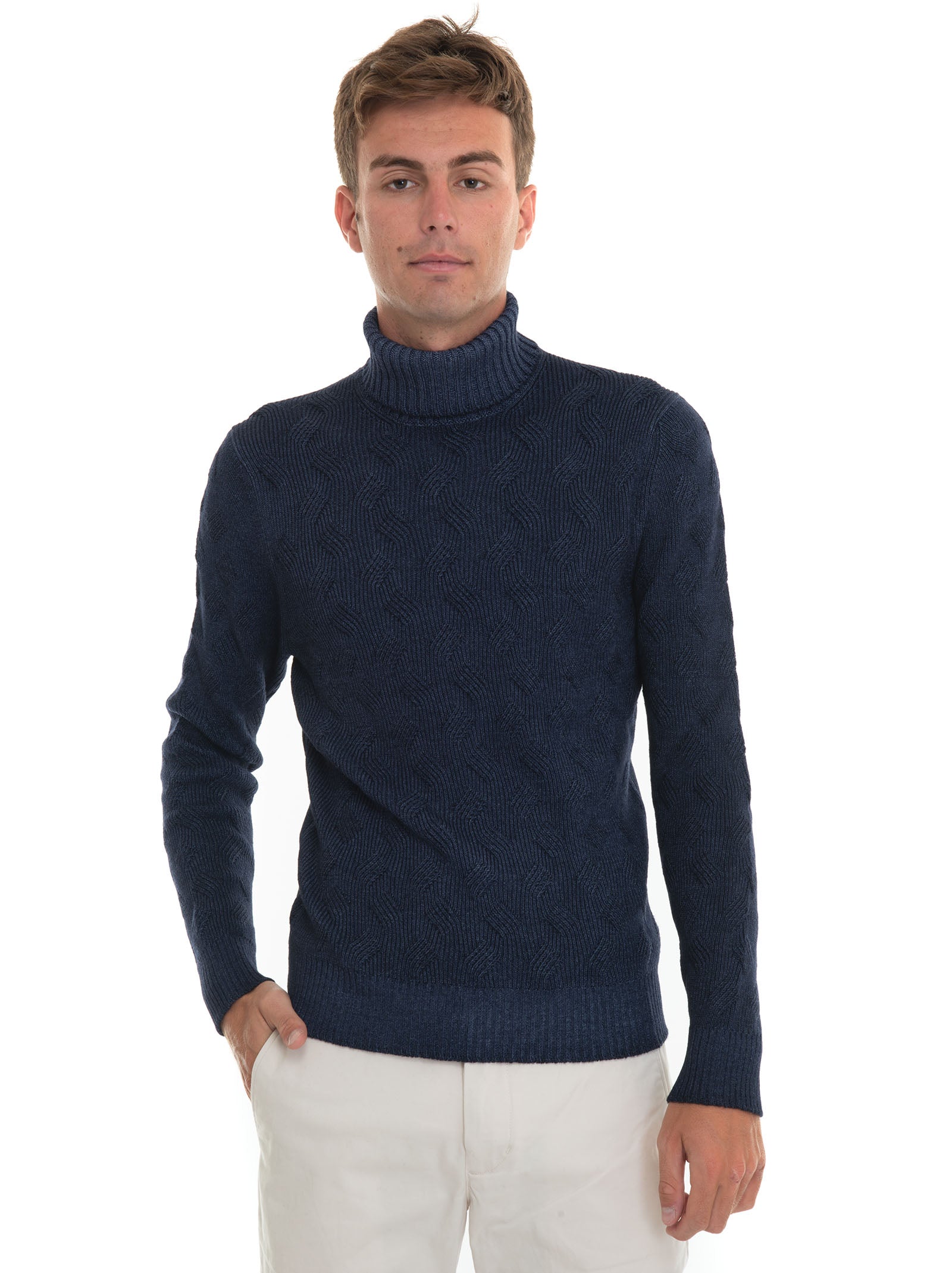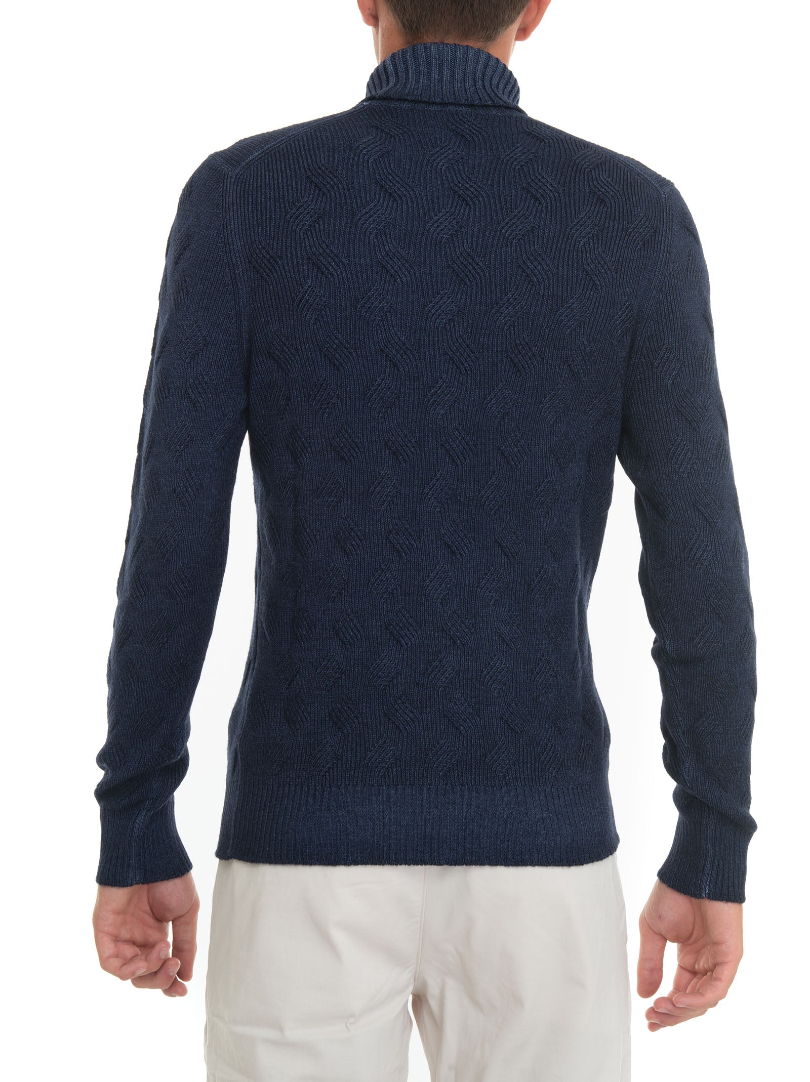 Pullover collo alto, lavorazione maglia a treccia, stone washed, vestibilità slim, composizione: 100% lana, linea: GRAN SASSO.