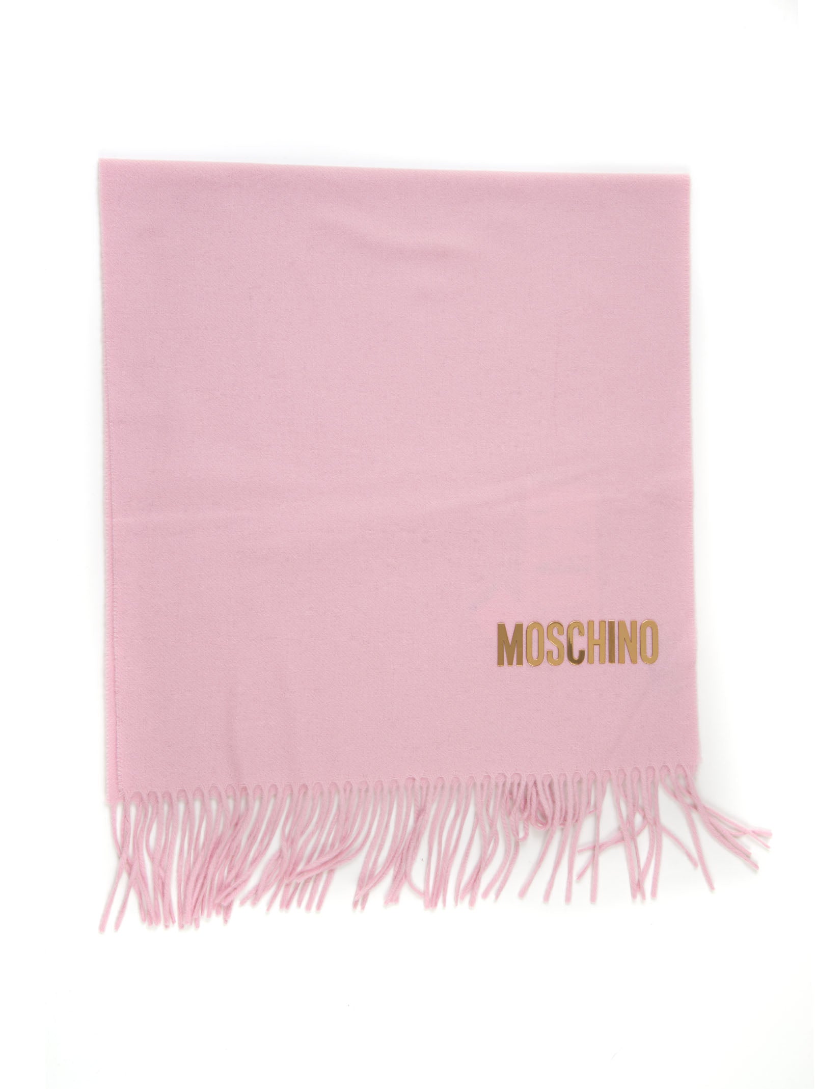 Sciarpa classica, logo in metallo color oro, profilo con frange, fantasia diagonale, tinta unita, composizione: 100% lana, linea: MOSCHINO.
