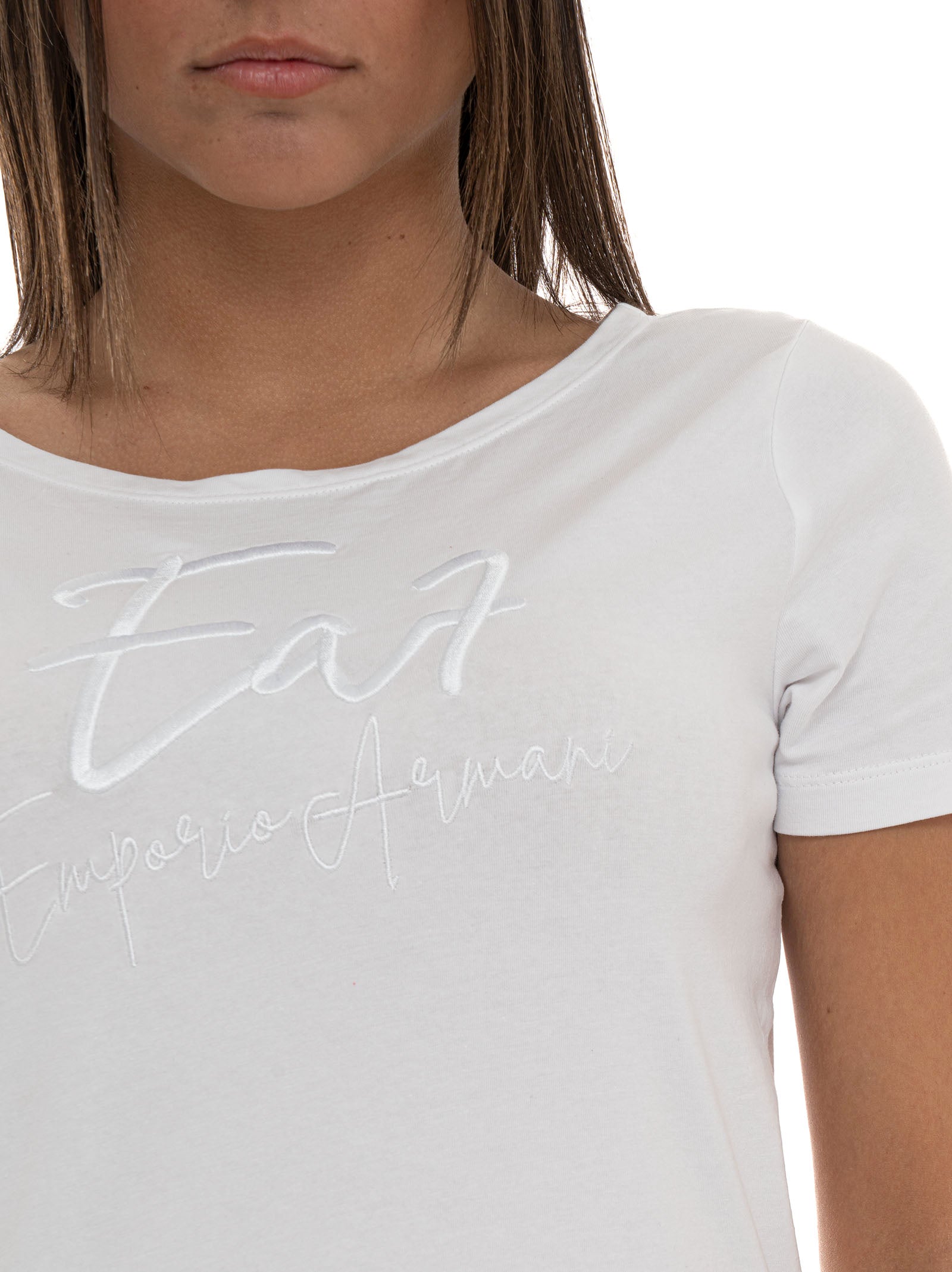 T-shirt, manica corta, logo ricamato sul pannello frontale, scollatura ampia, composizione: 95% cotone, 5% elastan, linea: EA7.