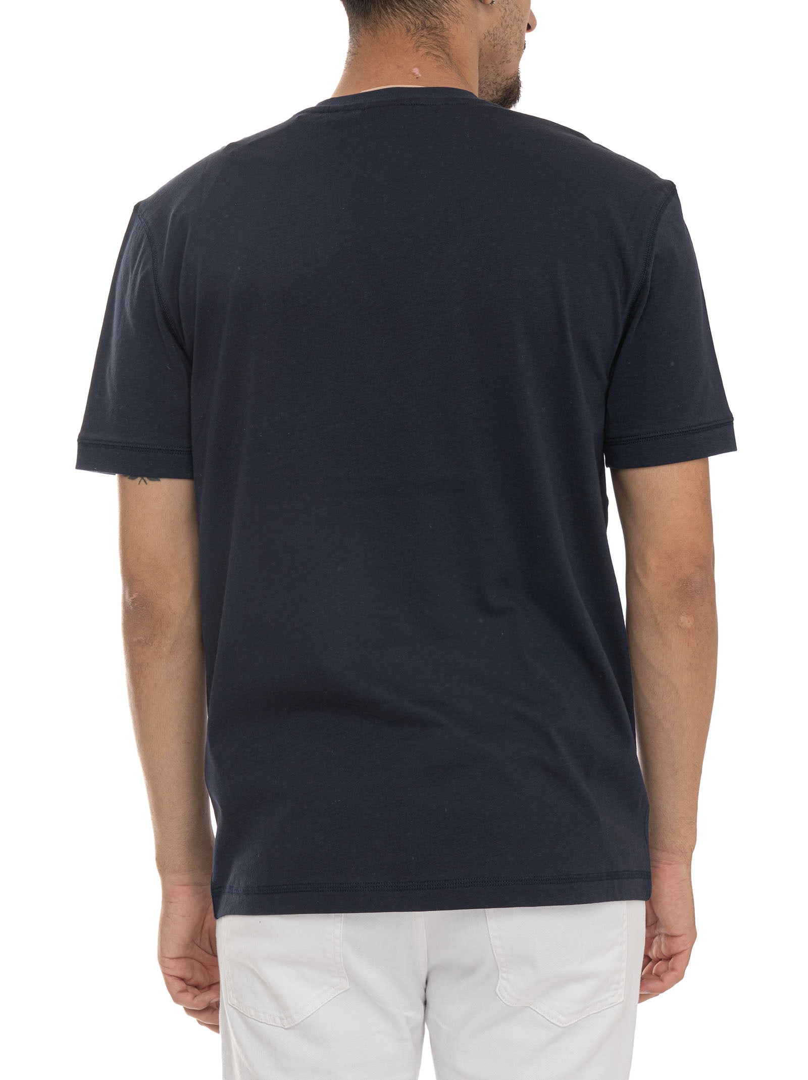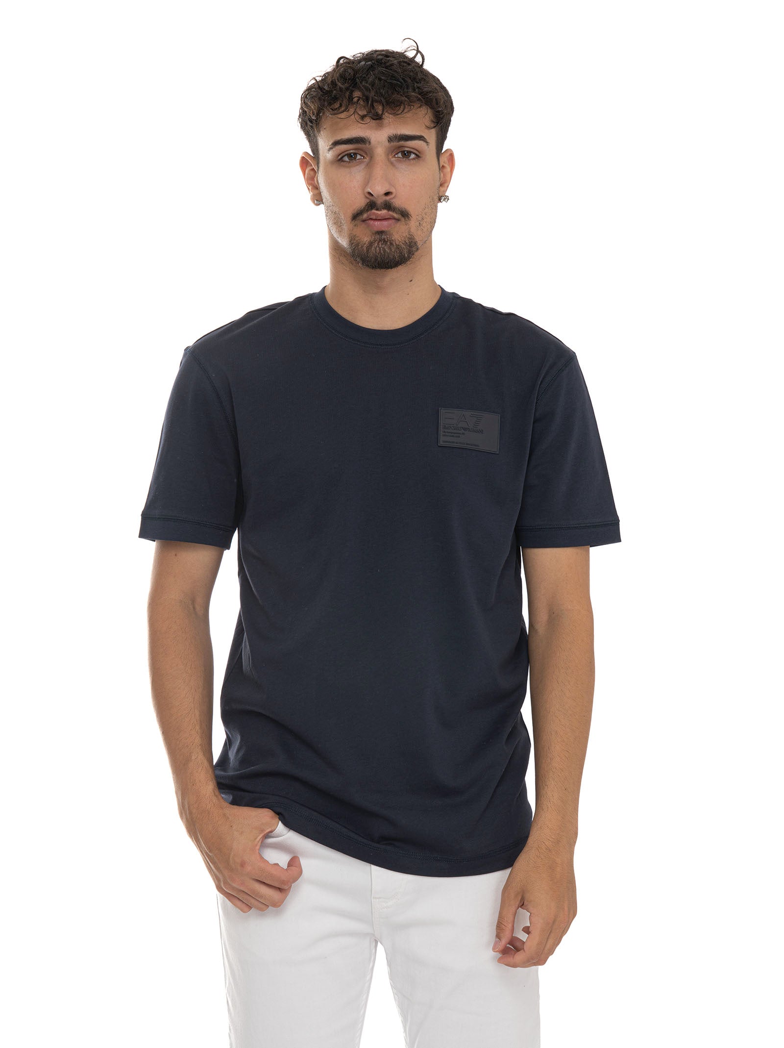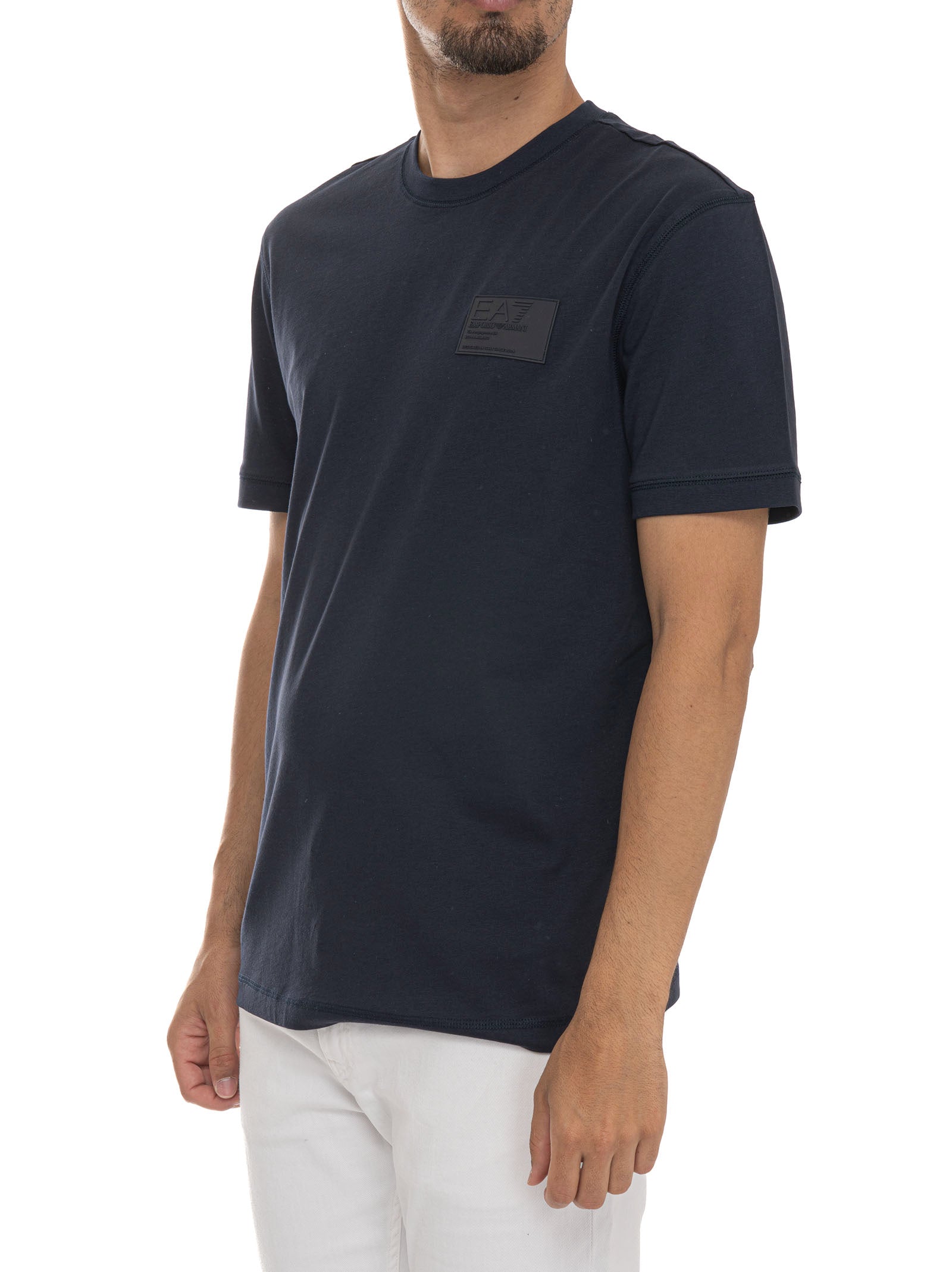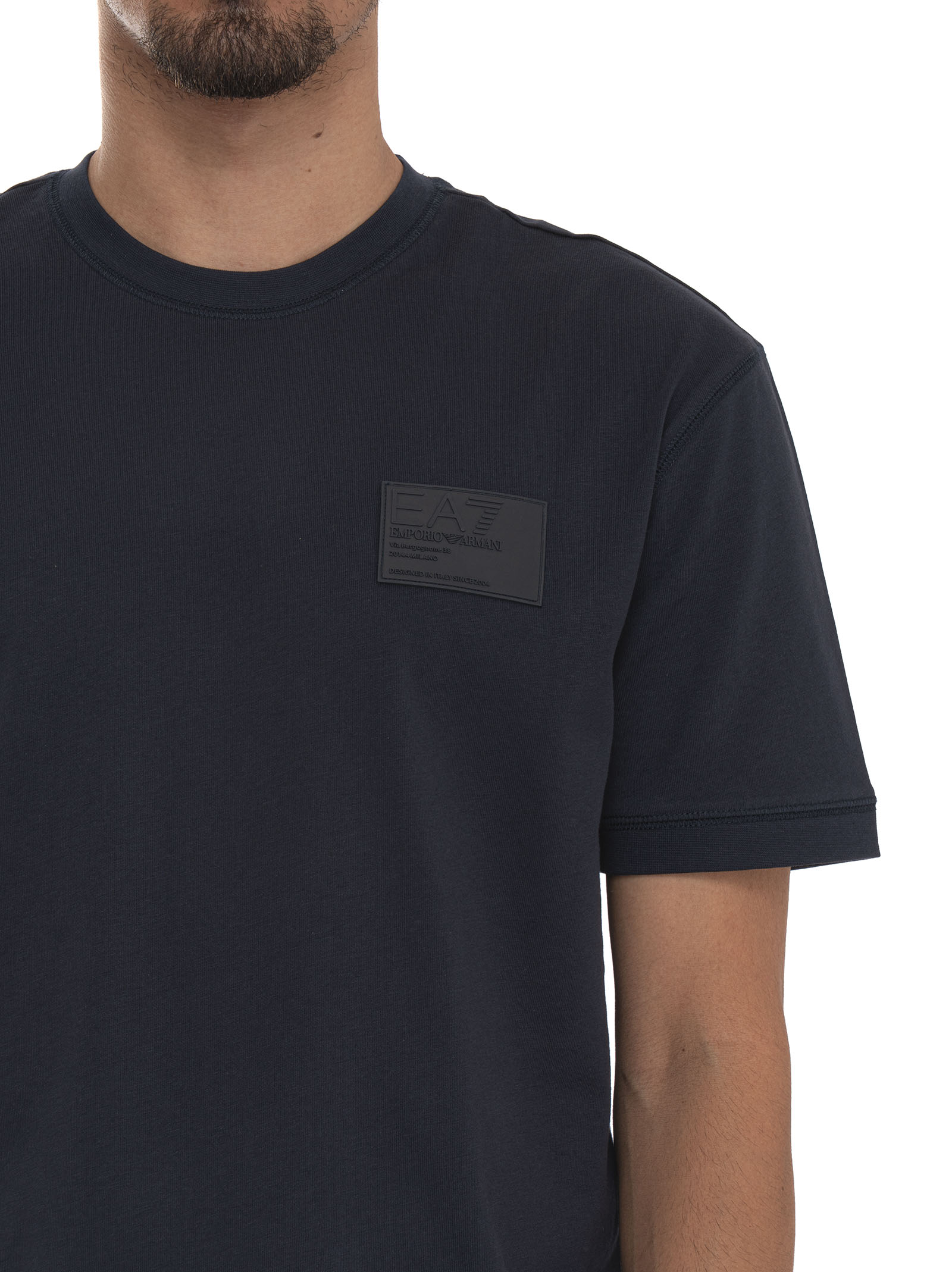 T-shirt girocollo, mezza manica, logo sul petto sinistro, cuciture a rilievo, composizione: 100% cotone, linea: EA7.
