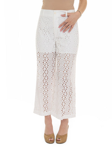 Pantalone cropped, tessuto in sangallo, linguetta con logo, chiusura con bottone e zip a scomparsa,...