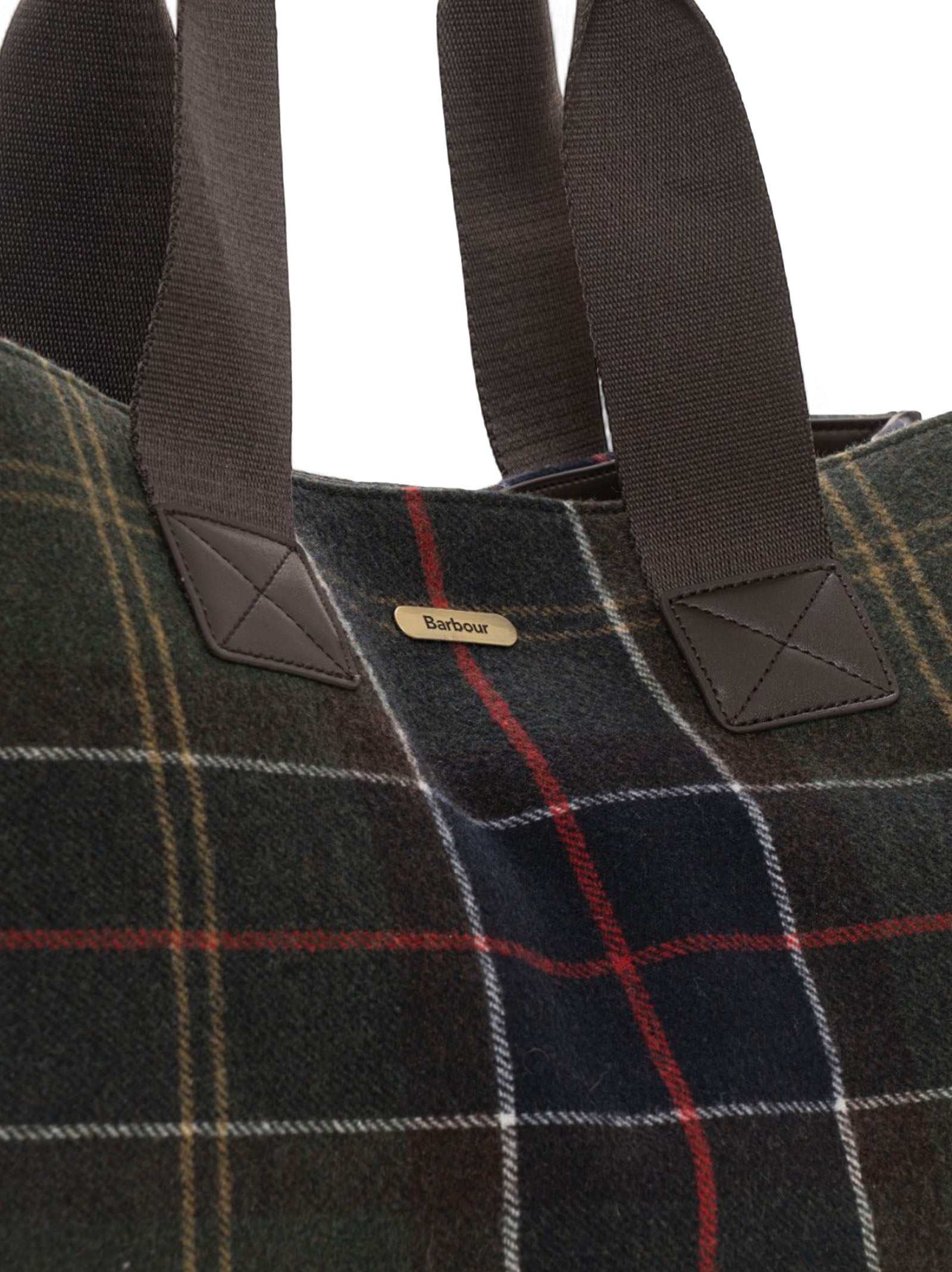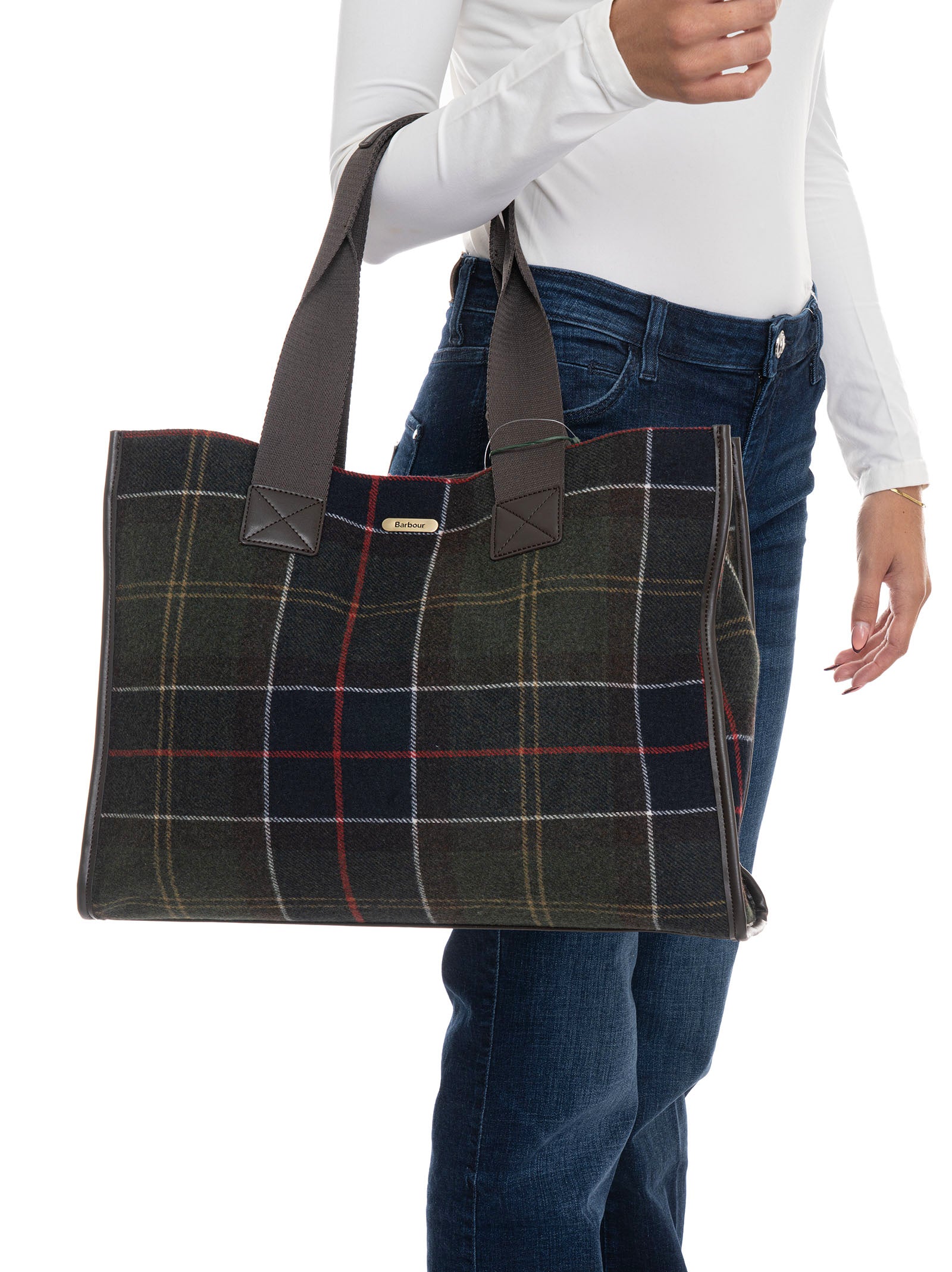 Borsa in tessuto modello shopper Barbour Tumberry, fantasia scozzese, doppi manici, chiusura a scatto, tasca interna chiusa con cerniera, piedini metallici alla base, composizione: 65% poliestere, 20% lana, 10% poliammide, 5% acrilico, linea: BARBOUR.