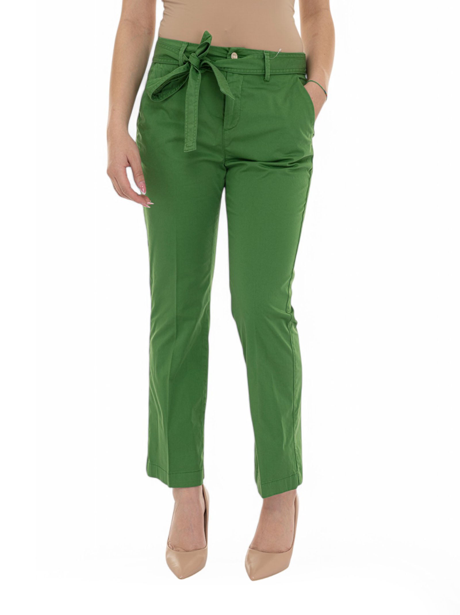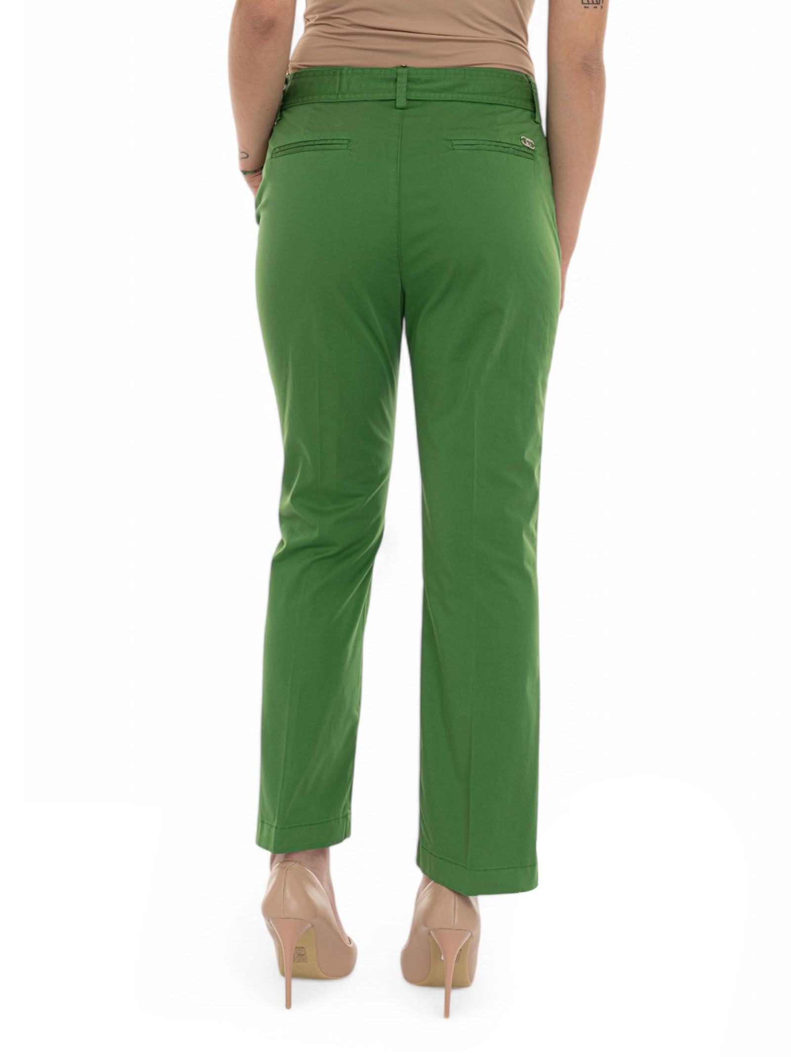 Pantalone in cotone, chiusura con bottone e zip a scomparsa, cintura in vita, modello chino, vita media, gamba dritta, linguetta con logo, composizione: 97% cotone, 3% elastan, linea: LIU JO.