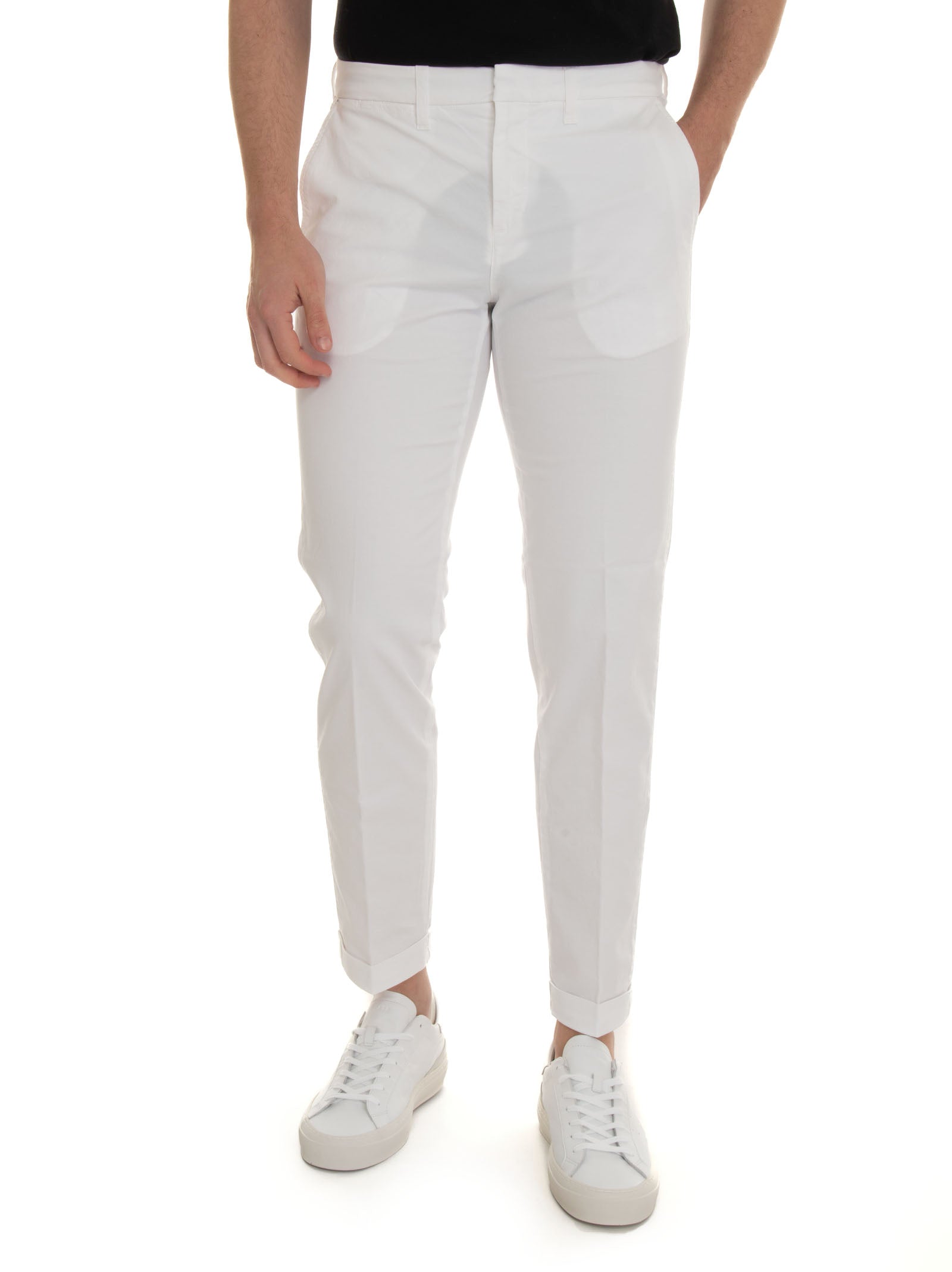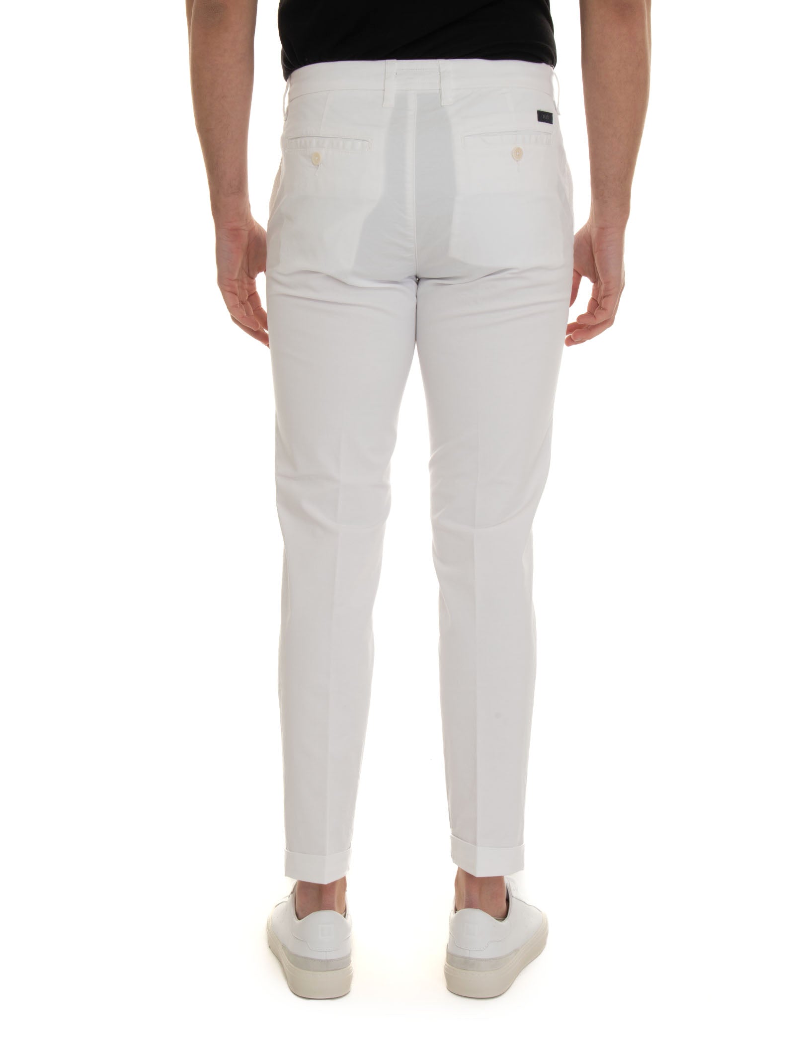 Pantalone modello chino, fondo con risvolto, chiusura con bottone e zip a scomparsa, logo tasca destra, fondo 16 cm, vestibilità slim, composizione: 97% cotone, 3% elastan, linea: FAY.