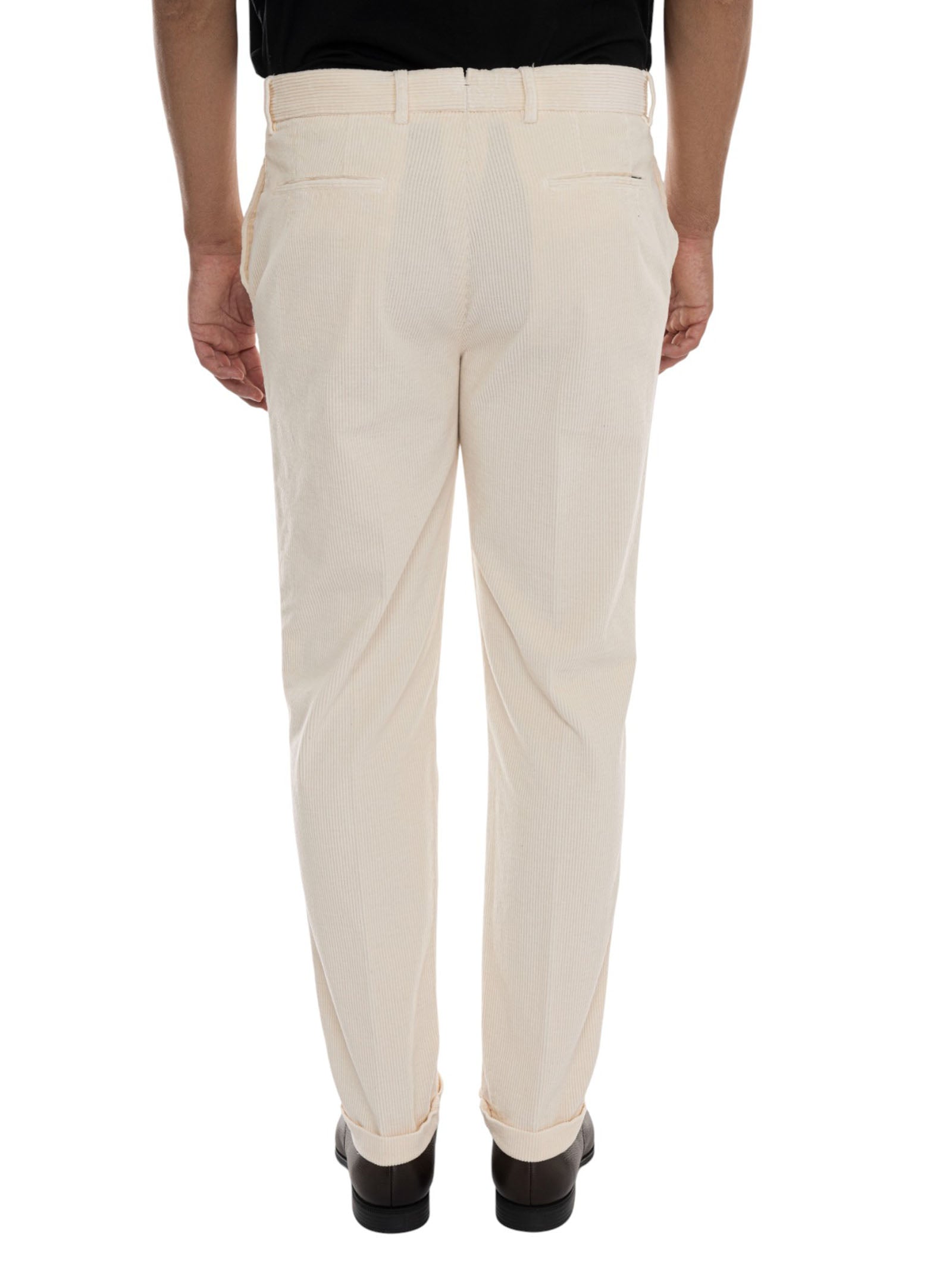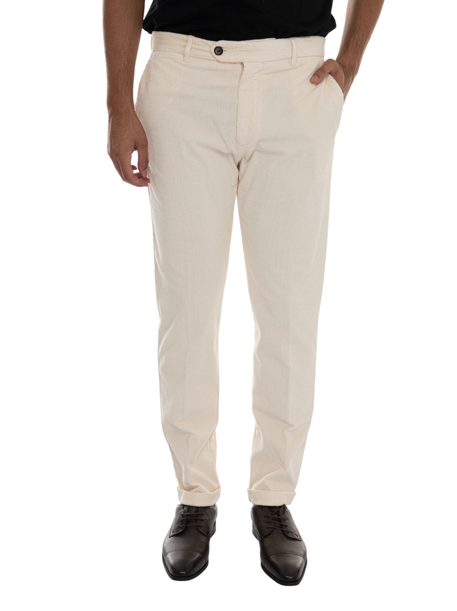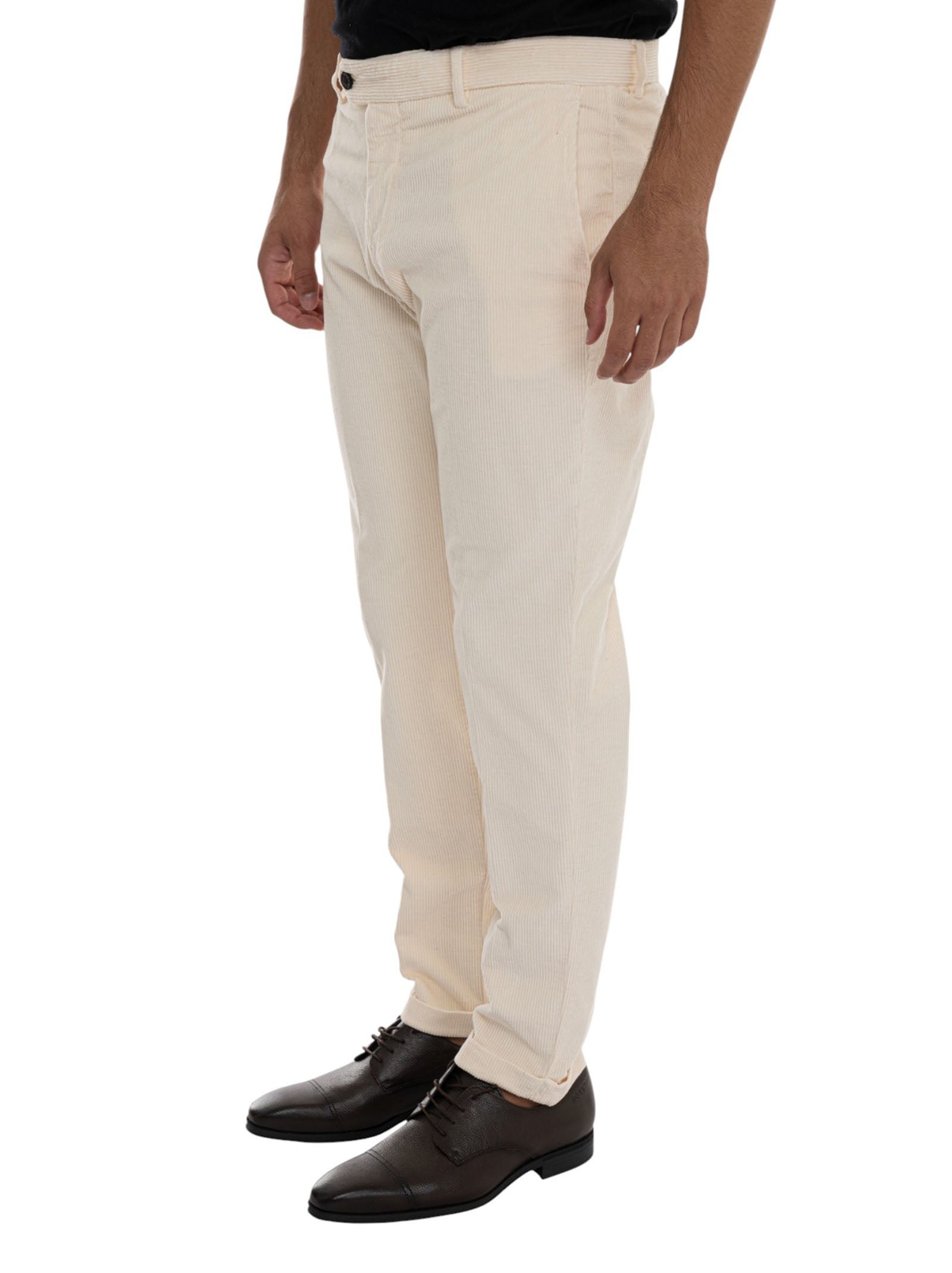 Pantalone modello chino Berwich YRETROGD-DV0500X, costina stretta in velluto, risvolti sul fondo, chiusura con bottone e zip a scomparsa, spacchetto sartoriale, logo posteriore, fondo 17 cm, composizione: 98% cotone, 2% elastan, linea: BERWICH.